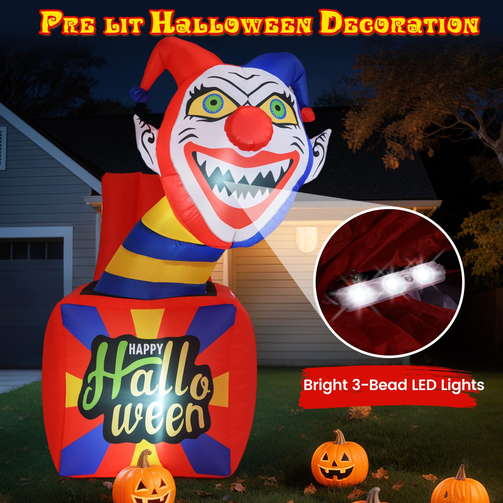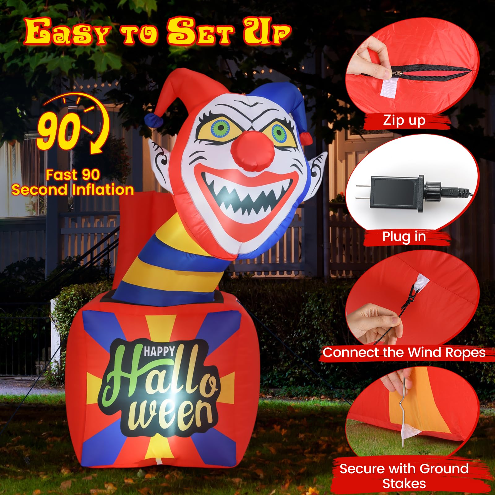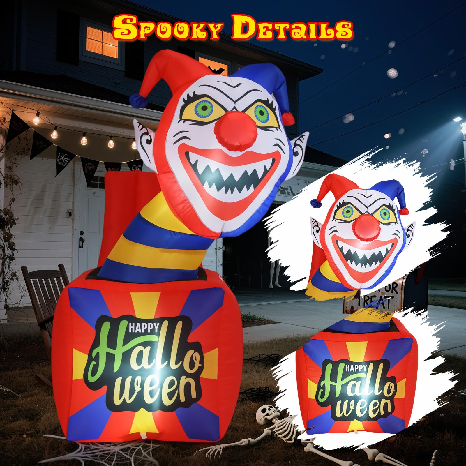 - 【Scary Halloween Clown】Showcasing a circus clown with its head popping out of the box, this 5ft tall decoration brings a playful sense of fright to your Halloween displays. Its bright colors stands out at your entryway, porch, or party, making your setup fun and attention-grabbing.