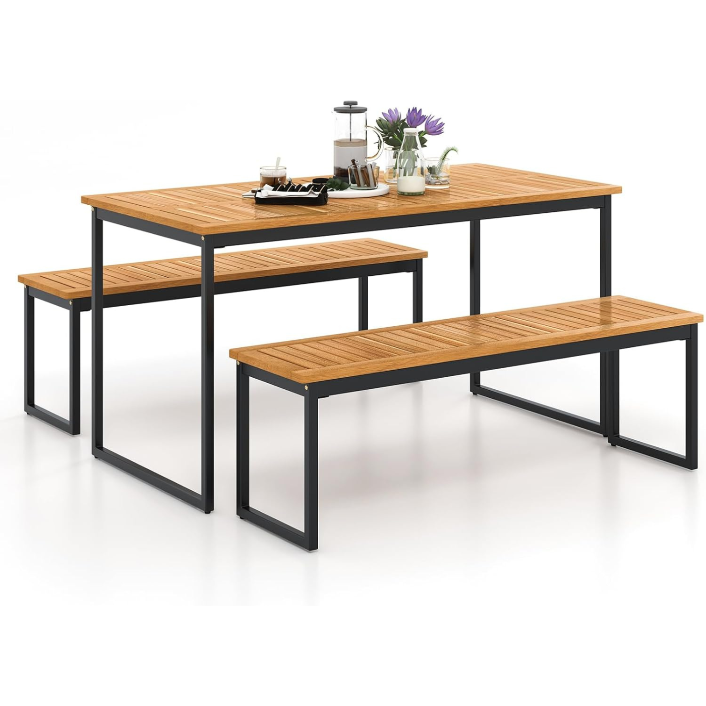 - Multi-scene Application: Combing natural wood grain and black metal frame, the garden diner table set complements any decorative themes of your yards, balconies or poolsides. For prolonged lifespan, please refrain from leaving the patio table and bench set outdoors during rainy days.