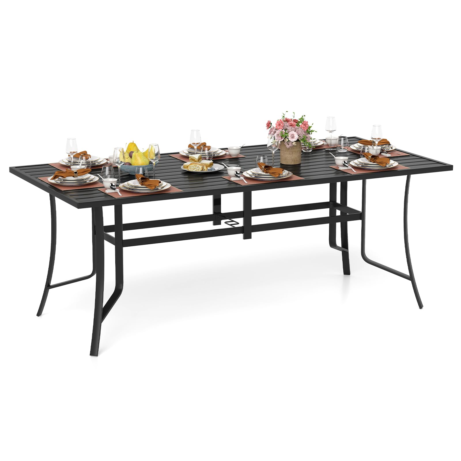 Tangkula's patio dining table collection includes rectangular, round, square, and oval shapes. Options range from compact bistro-style tables for smaller spaces to larger rectangular tables for bigger gatherings, with many featuring umbrella holes, slatted tops, or foldable designs.