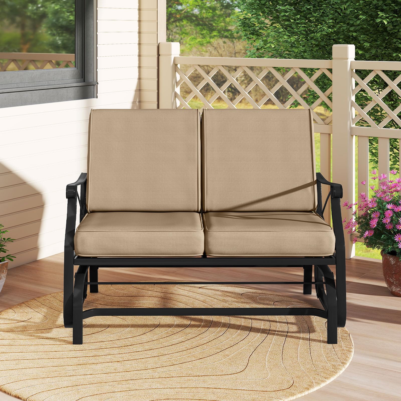 Designed for comfort and durability, the rocking bench features reinforced gliding arms for a safe, soothing motion and a robust metal frame that supports up to 660 lbs. And the soft and elastic cushions bring optimal coziness to you, which can be removed as you need. Moreover, the breathable backrest fabric ensures long-lasting outdoor use. Ideal for outdoor enjoyment, this glider bench is perfect for porch, backyard, or poolside, bringing a touch of style and leisure, and allowing you to enjoy shared relaxation with family or friend.