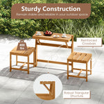 It cleverly morphs between a transforming patio table and chairs set, a cozy porch loveseat and an elegant plant rack, catering to your garden, deck and backyard needs. Built from high-hardness, splinter-free solid acacia wood, this front porch bench promises durability and a smooth, natural aesthetic. The design features ergonomic comforts such as an inclined backrest and slatted seats for breathability and support, ensuring leisure meets functionality. Moreover, its robust construction, reinforced with crossbars and a triangular structure, supports up to 400 pounds per seat, making it a reliable and stylish choice for different outdoor settings.
