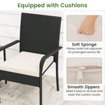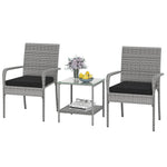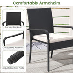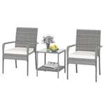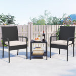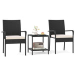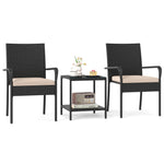 Crafted with premium PE rattan, this patio conversation set showcases a stylish appearance and ensuring durability. Both the table and chairs rest on a sturdy metal frame that promises exceptional stability, equipped with adjustable foot pads for extra stability. Designed for comfort, each chair features a sponge-filled cushion with smoothly zipping covers for easy maintenance. The balcony furniture set includes a 2-tier table for organized and accessible item storage. Perfect for various settings such as porches, gardens, or patios, this outdoor furniture set is a versatile choice for complementing your outdoor space.