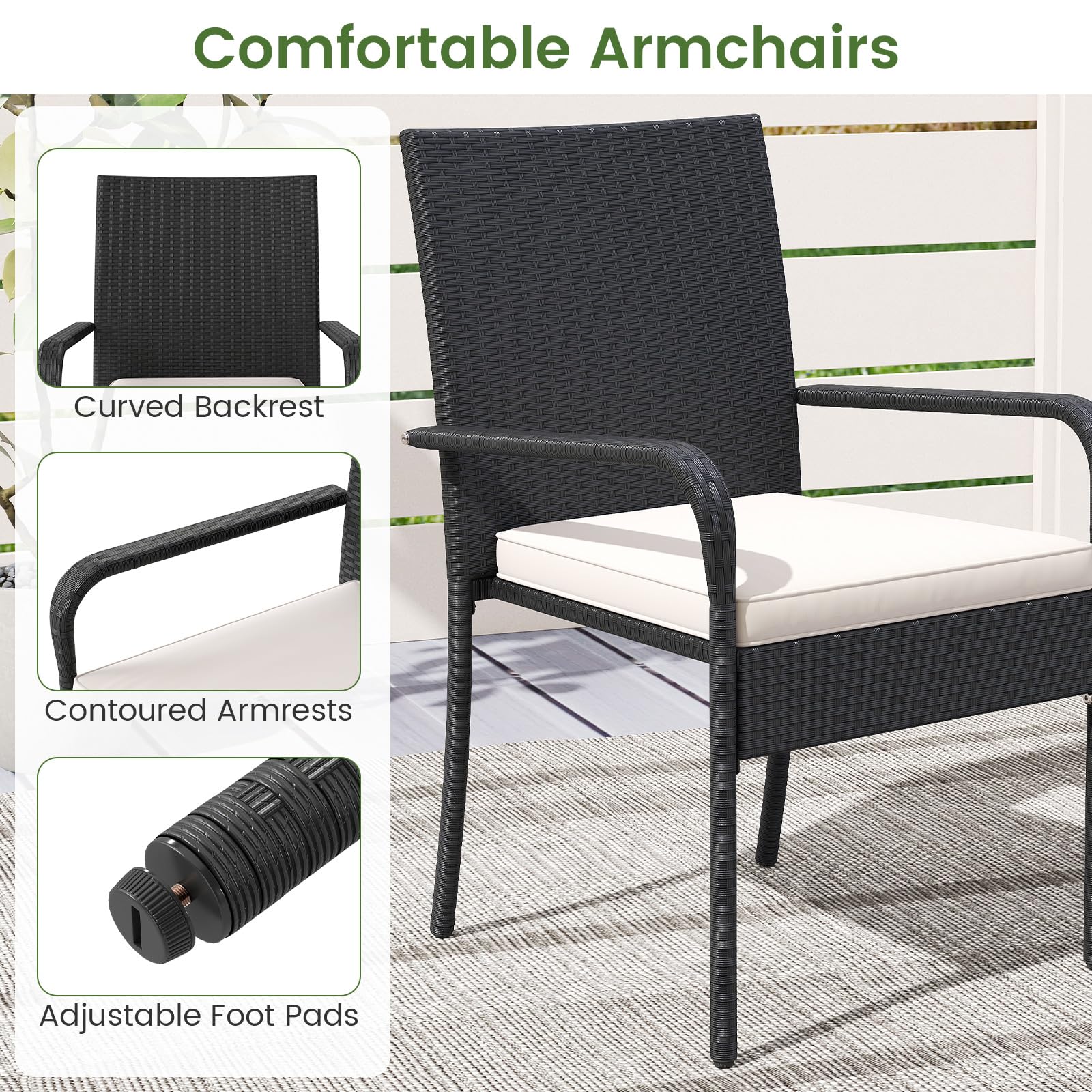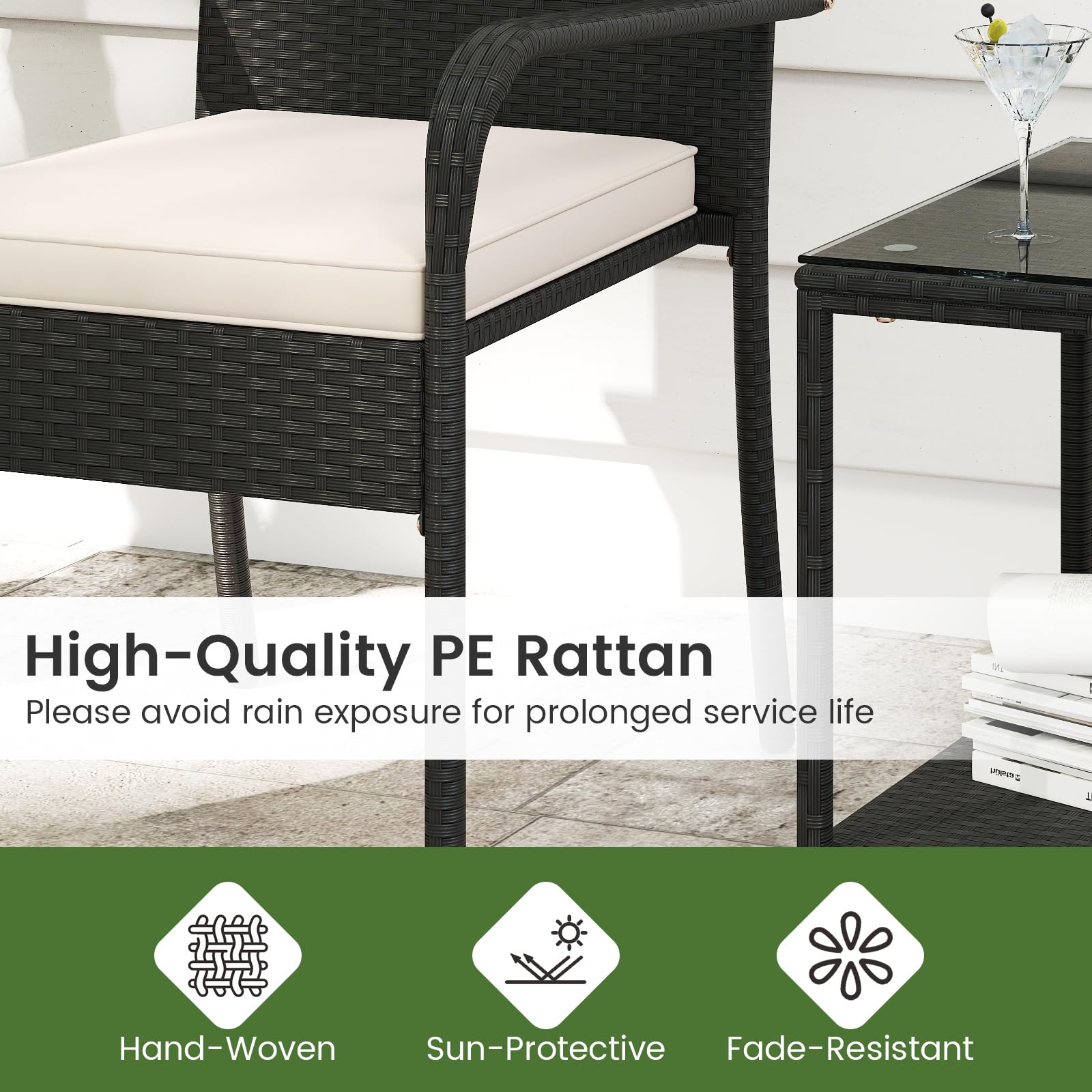 Materials: PE Rattan, Metal, Tempered Glass, Polyester, Sponge