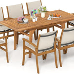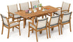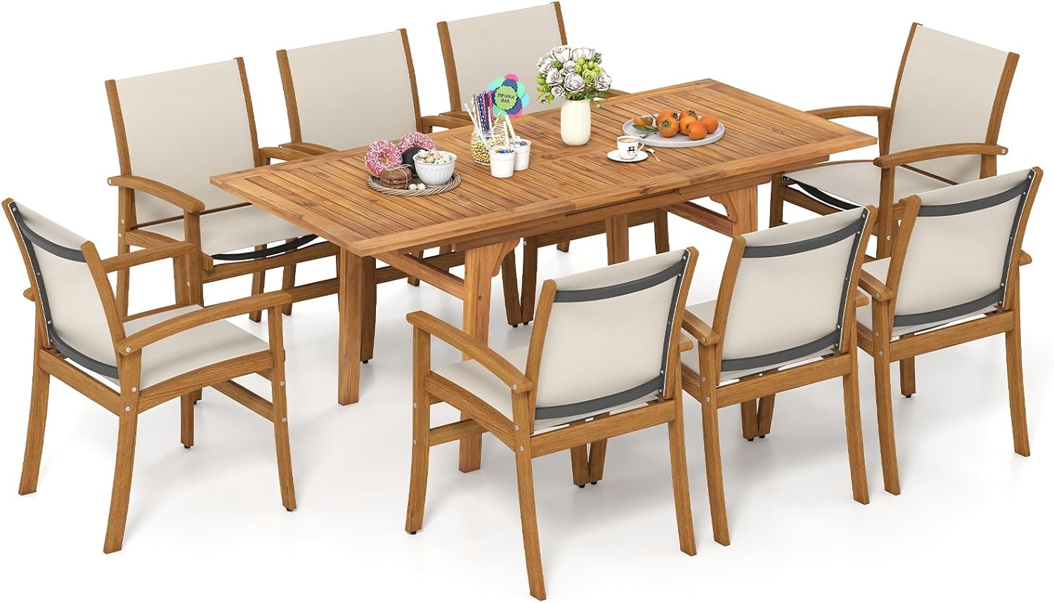 This outdoor patio set includes 8 comfortable patio chairs designed with breathable fabrics, 105° inclined backrests, curved armrests and contoured seats, ensuring optimal comfort for prolonged enjoyment. Moreover, the robust central dining table, expandable from 55" to 71", comfortably accommodates 6-8 guests and comes equipped with a 1.97" umbrella hole ready to shield you from the sun using most patio umbrellas (not included). Crafted from solid acacia wood, this outdoor patio furniture set boasts strong stability, with the table holding up to 330 lbs and each chair supporting 400 lbs, making this outdoor dining table set a reliable and stylish choice for hosting your outdoor feasts and gatherings.