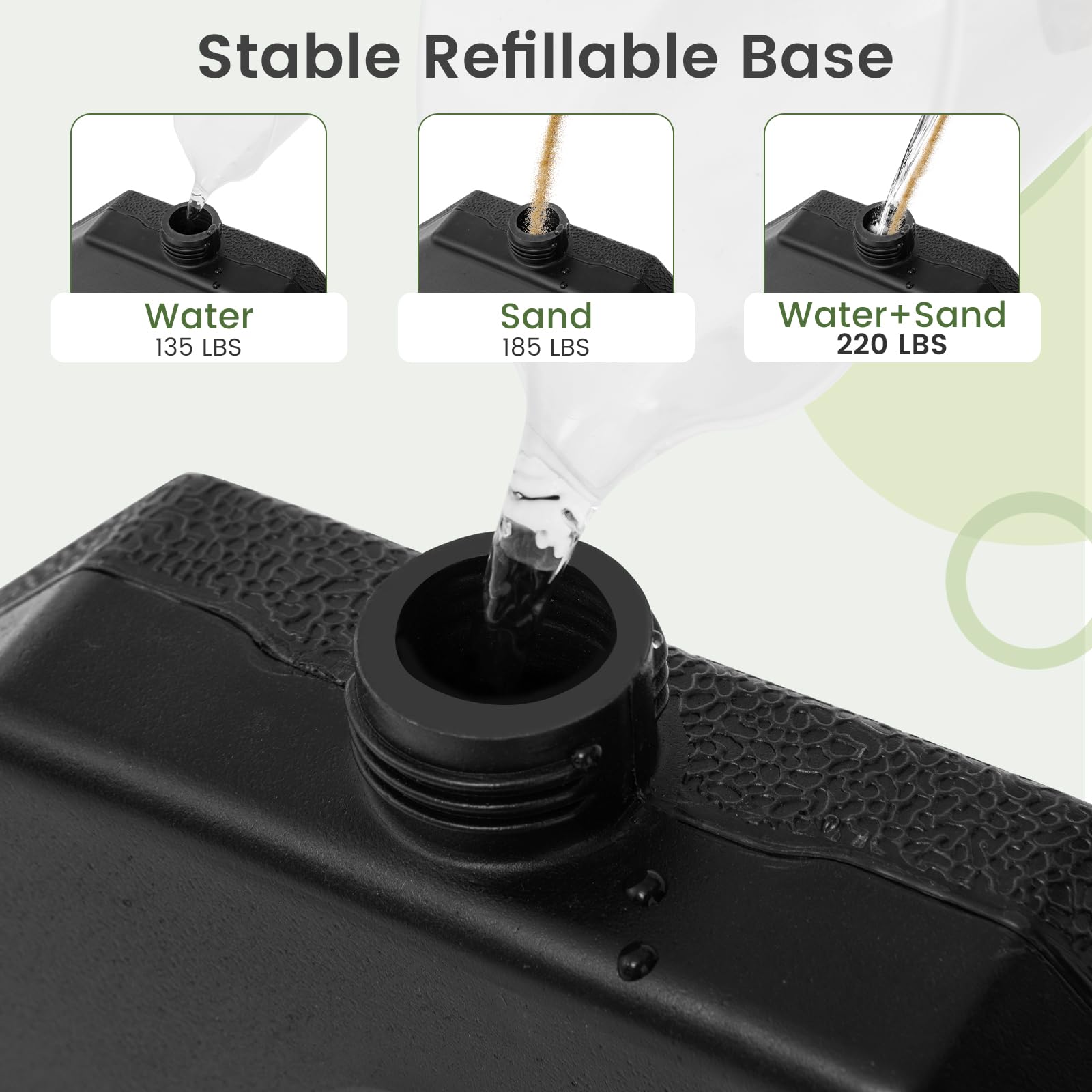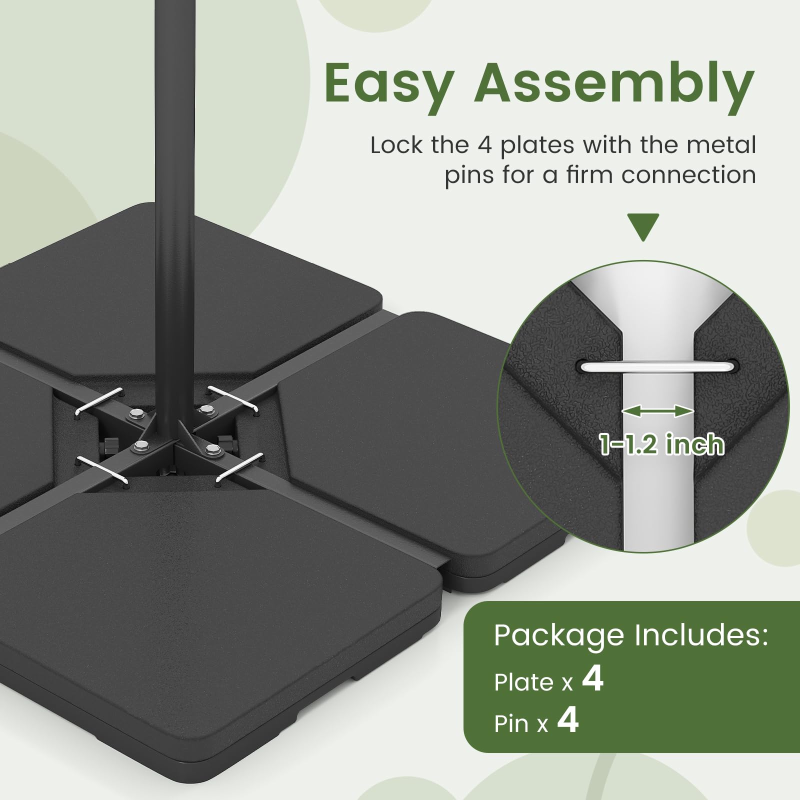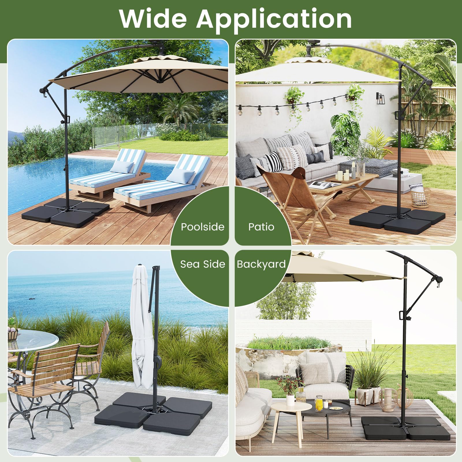 Are you looking for a patio offset umbrella base that's both portable and stable? Our 4-piece set features stackable square plates with built-in handles for easy transport and space-saving storage. Made from premium HDPE material, it's wear-resistant, fade-resistant, and perfect for long-term outdoor use. The refillable base holds up to 135 lbs of water,185 lbs of sand, or 220 lbs of a water-sand mix, ensuring maximum stability. Quick assembly with 4 metal hooks locks the plates securely, creating a sturdy foundation. Compatible with 9-10 ft cantilever umbrellas, this weighted patio umbrella is ideal for backyards, poolside, seaside, and commercial spaces.
