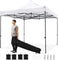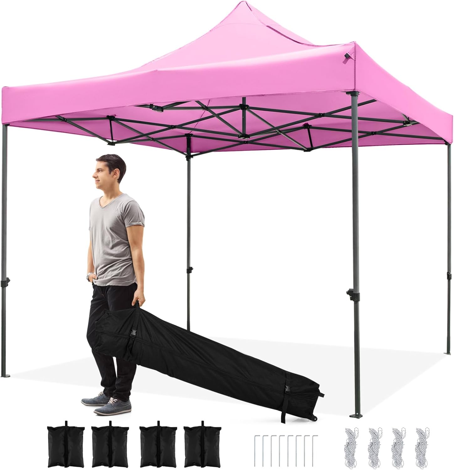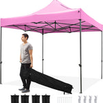 Designed to offer reliable shade and protection, the pop-up canopy tent features a heavy-duty carbon metal frame with reinforced truss plates for added sturdiness. For secure setup, sturdy stakes, wind ropes, and anchor bases with integrated stakes work together to maximize stability, while sandbags (holds up to 22 lbs, sand not included) provide extra wind resistance. The canopy top is crafted from 420D oxford fabric with a PU coating, making it both water-resistant and effective at blocking the sun's rays. More importantly, the effortless assembly requires no tools. Plus, 3 adjustable height options allow you to tailor the shade as needed. When it's time to pack up, a storage bag with 2 roller wheels ensures convenient transport. Hence, the tent shelter is perfect for sports games, outdoor parties, picnics, or vendor events.