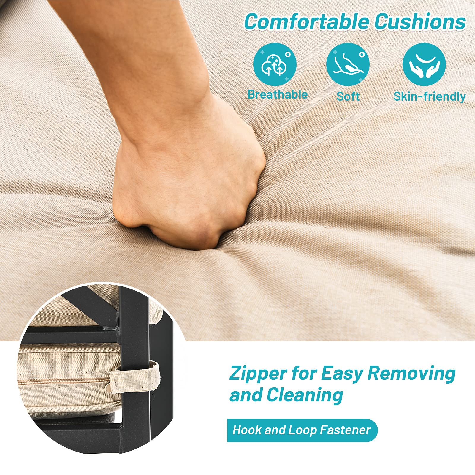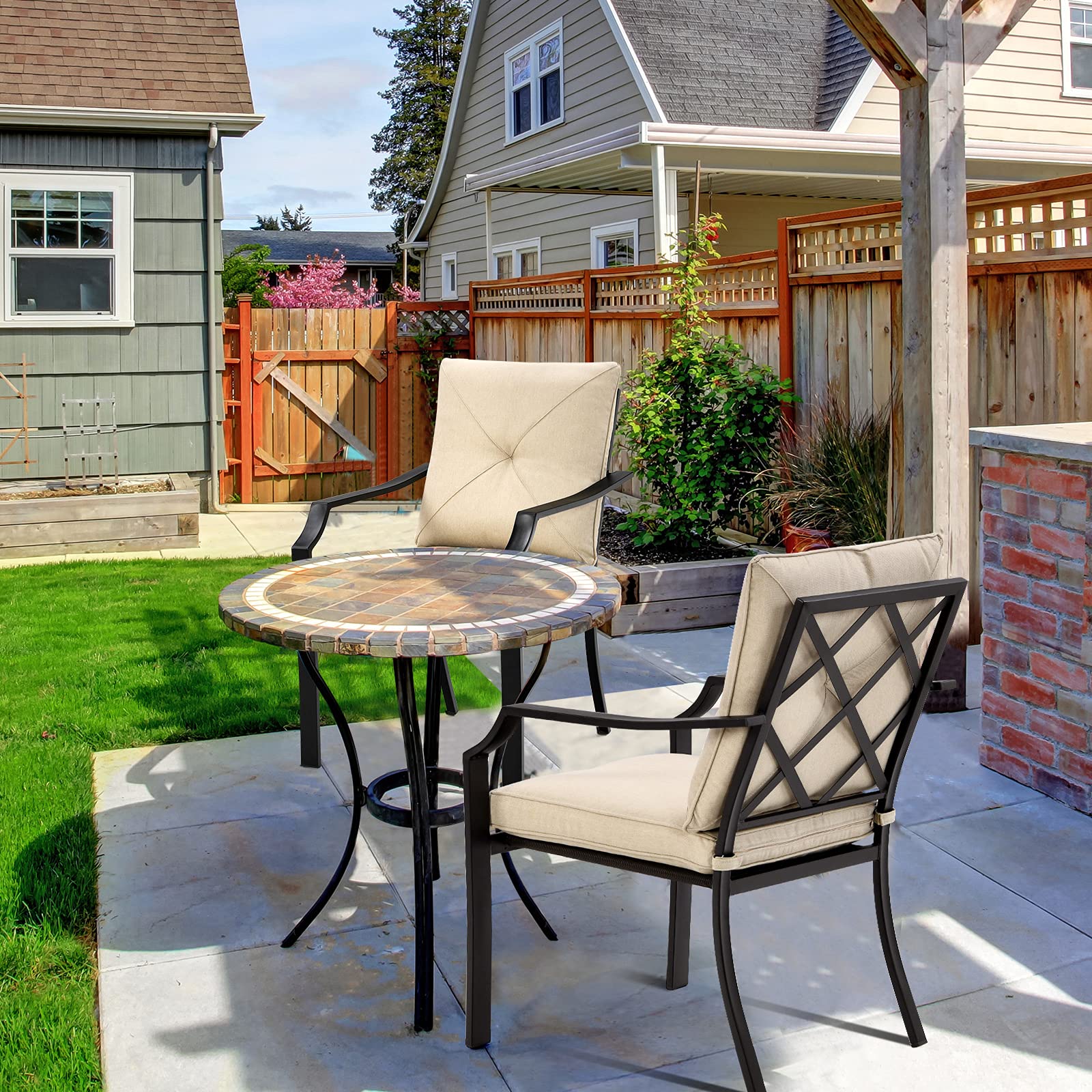 This 4 piece patio chair set is very suitable for families to sit together, chat, or enjoy food. Composed of a rustproof and reinforced steel frame, each chair has a strong load-bearing capacity of 270 lbs, which can well meet your daily needs. With soft and thick cushions, your full body will get better support for enjoying the ultimate comfort. And all the cushions can be detached. The seat cushion covers are removable and washable for great convenience. Additionally, these elegant outdoor bistro chairs make a great addition to your outdoors. Besides, the stackable design is convenient for you to move and store.
