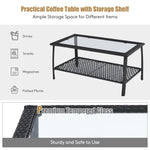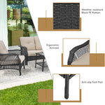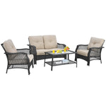 Create a cozy place for your outdoor gathering with this 4 pieces outdoor patio furniture set! With 1 loveseat, 1 coffee table, and 2 single chairs, this cushioned outdoor conversation set provides a comfortable area for you to entertain your friends while it can be placed into different shapes based on your location and preference. And the coffee table has an extra storage shelf, so you can store a lot of items on it rather than getting up and getting them. The all-weather PE rattan, anti-rust steel frame, and premium tempered glass can stay outside for long-lasting use.