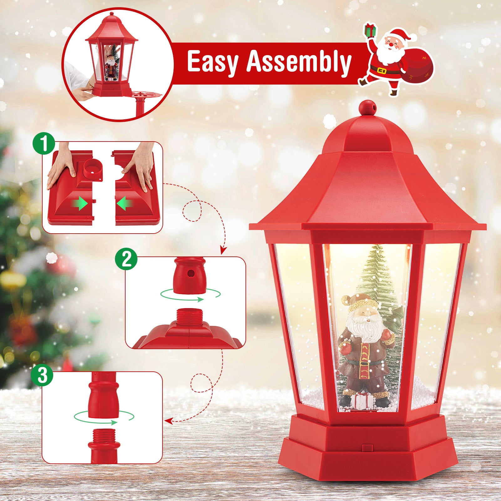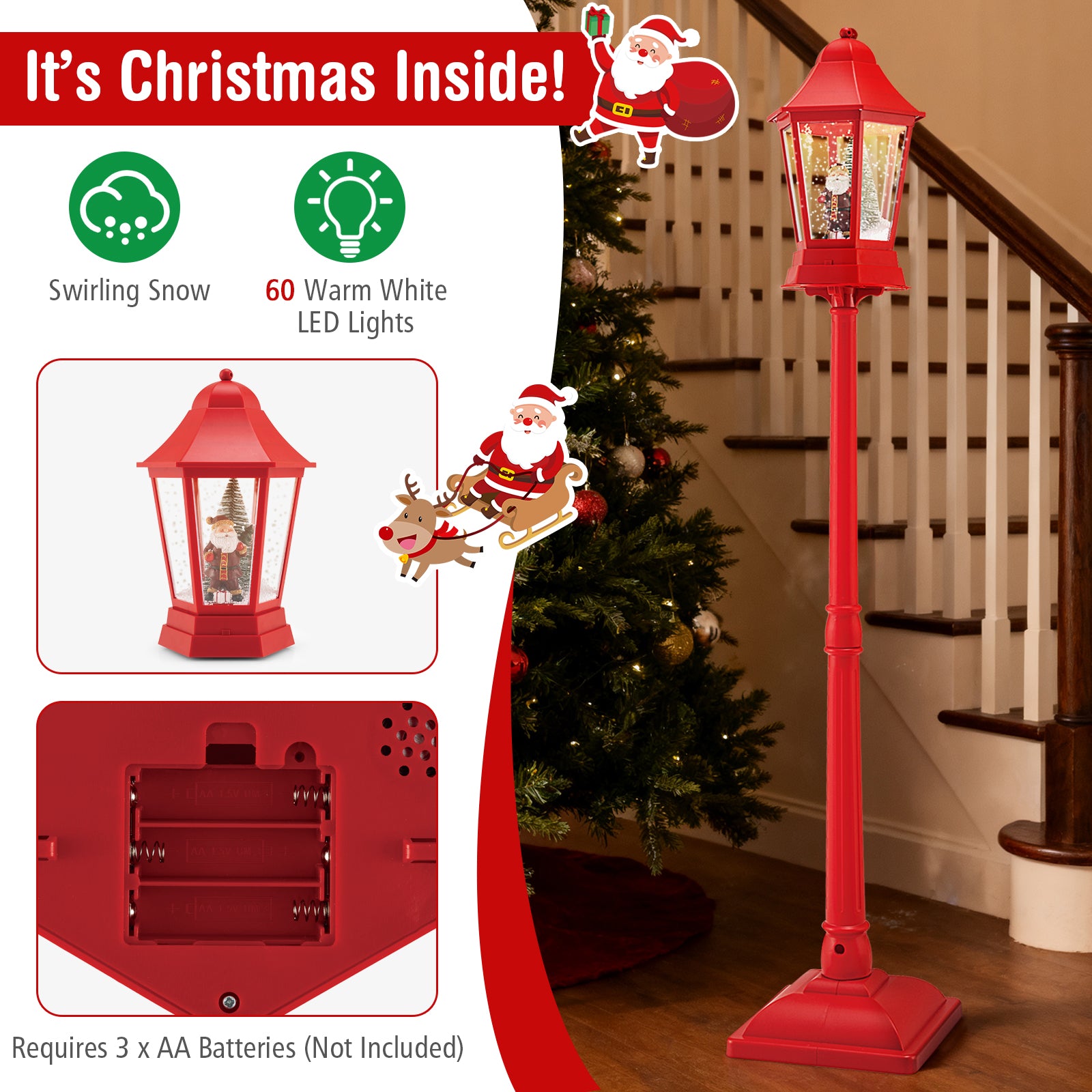 At its heart, Santa clause and a large gift box/smiley snowman stands in front of a festive holiday tree, all surrounded by swirling snow and the warm white glow from the LED lights. Enjoy the delightful sound of 8 classic Christmas tunes like “Jingle Bells”, or simply bask in the lamp’s festive lights by switching to silent mode for a serene holiday mood. Wire-free for flexible placement, this versatile piece can stand tall as a festive floor lamp or convert to a charming tabletop snow globe, making it easy to add holiday cheer to your living room, entryway, or even your mantel. Bring warmth and wonder to your place with our Christmas-themed indoor street lamp!
