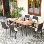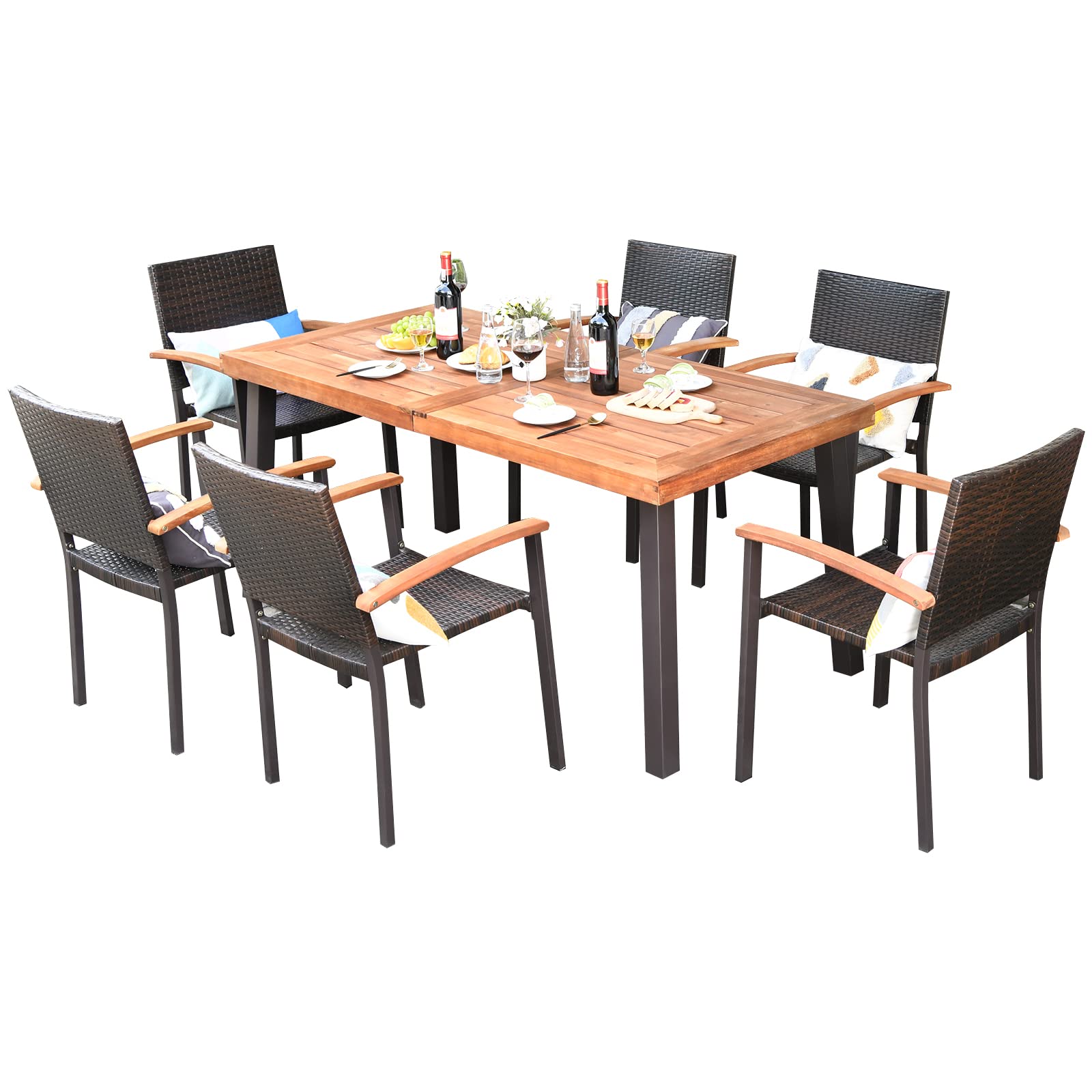 This outdoor dining set includes 1 rectangular dining table and 6 rattan chairs, which can accommodate 6 people to have cozy dining or conversation in the backyard, lawn, poolside, and more. Made from powder coated steel frame, solid acacia wood, and all-weather PE rattan, this outdoor furniture set ensures strong stability, durability, and weather resistance. Featuring wide wood armrests and an ergonomic backrest, the rattan chair can offer you a super comfortable sitting experience. When not in use, the chairs can be stacked up for convenient storage and saving space. Moreover, there is an umbrella hole on the table, which allows you to place an umbrella to block the dazzling sunlight.
