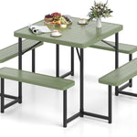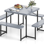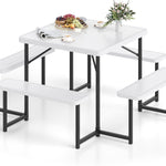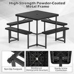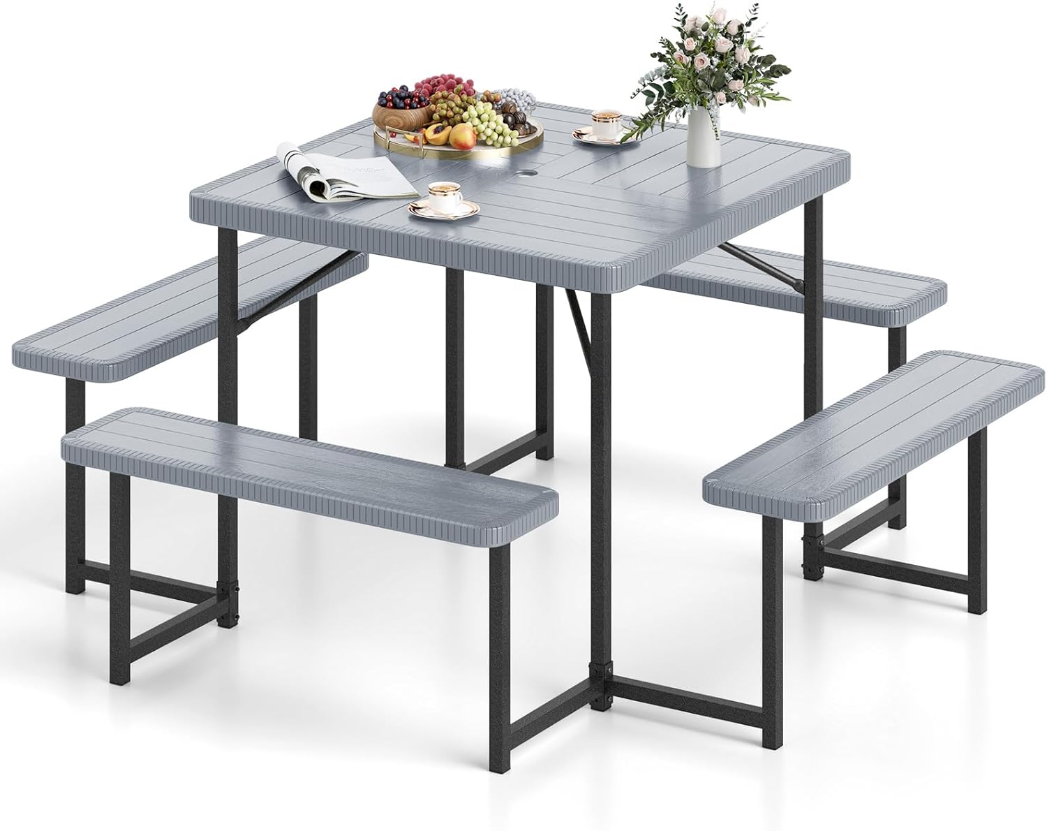 Our square picnic table with 4 benches measures 63" x 63" x 30"(L x W x H), offering ample seating space for 4-8 individuals. With a convenient umbrella hole in the center of the tabletop, you can add shade with ease (Note: Require a weighted base to secure your umbrella, not included). The tabletop and bench seats are crafted of reliable HDPE, which resist scratches and weather conditions, built to last. Moreover, the plastic surfaces are also waterproof for easy cleaning, ensuring it looks great all year round. The robust metal frames ensure stability and durability, making it suitable for various outdoor settings without wobbling. Whether for poolside BBQs, patio dining, school recreation areas, outdoor restaurants, or cozy indoor craft spaces, our table bench set can be a perfect choice!