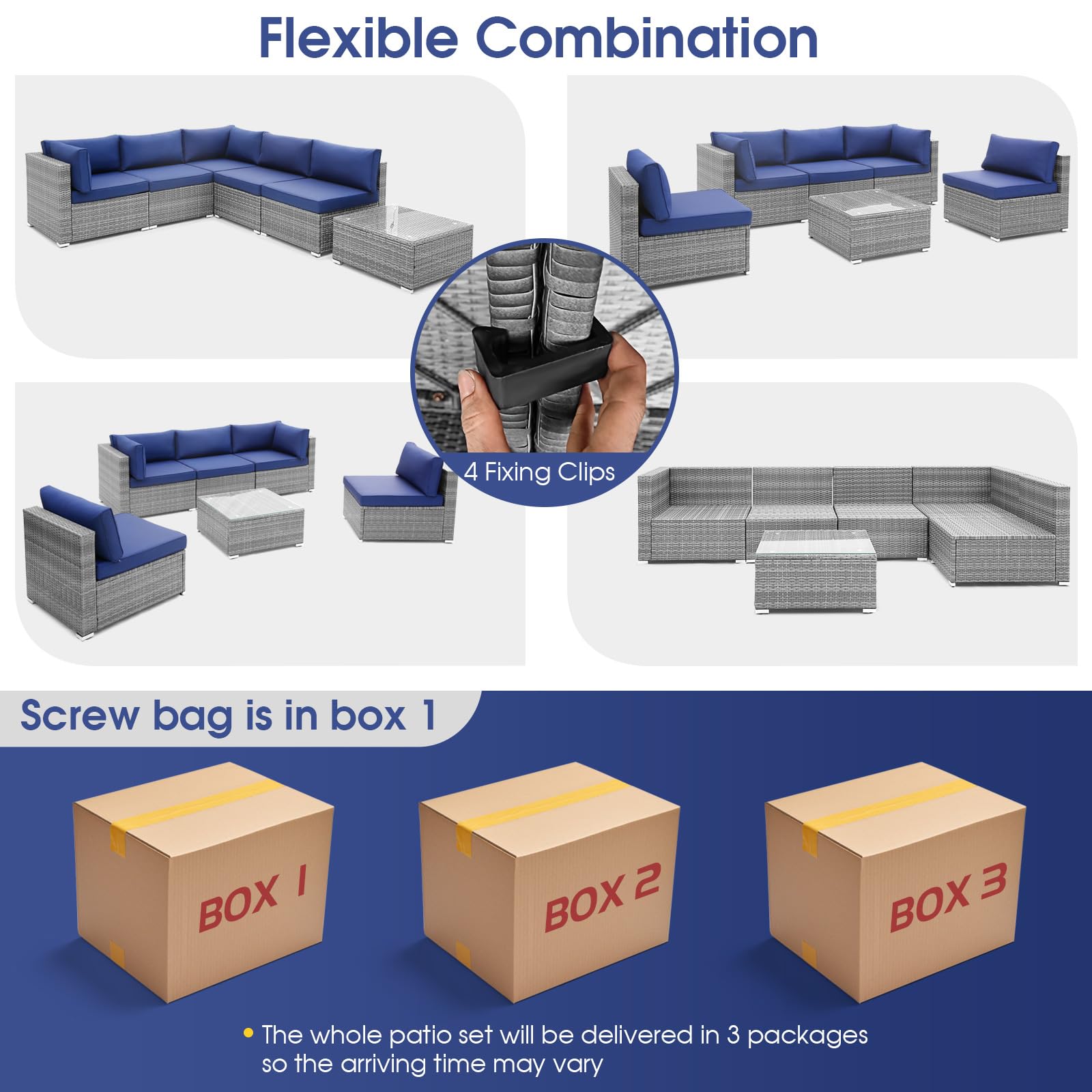 - Flexible Combination: This 6-piece patio rattan furniture set can be combined into different shapes to fit areas of different sizes. And 4 fixing clips are provided for sofa connection. Such a convenient design makes the sofa set ideal for different occasions like backyard, poolside, and front porch.