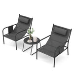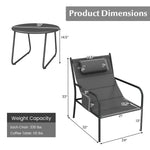 Each chair features contoured sling seat with padded sponge layer and breathable fabric, complemented by an elastic headrest for enhanced comfort. The sturdy metal frame supports up to 330 lbs per chair, while the matching coffee table can hold up to 110 lbs. Complete with a side storage pocket, the chairs will make you relax with more convenience. With elegant appearance and high-level comfort, this set is ideal for your patio, backyard or poolside. Enjoy relaxing outdoors with this stylish and comfortable furniture set.