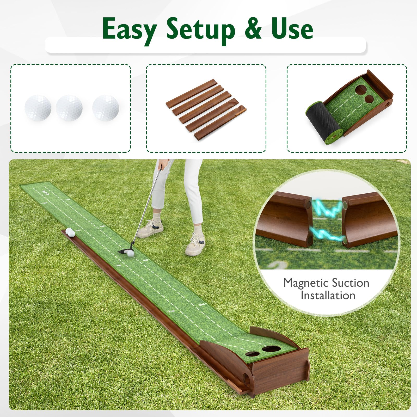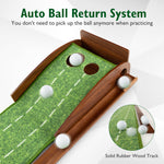 Made of high quality materials, the putting mat boasts good wrinkle resistance and is close to the feel of a true golf course. Designed with clear alignment lines, 4 distance scales and 2/3 holes of different sizes, this putting green allows you to practice putting at different distances and difficulties. Additionally, the auto ball return function saves you from wasting time chasing the balls, ensuring uninterrupted practice time. The solid rubber wood track can be put together easily with the magnetic ends. Besides, with the roll-up design, this golf practice mat can be conveniently stored and carried anywhere.