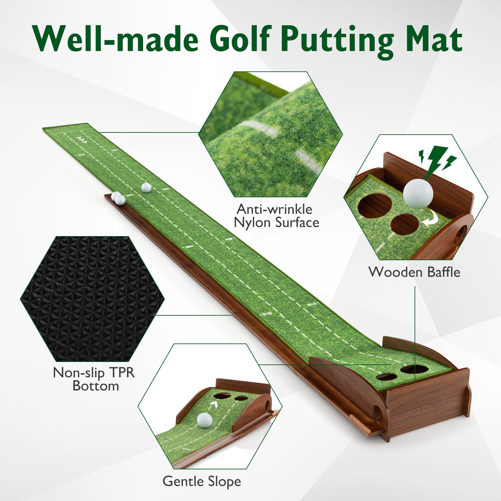 - Auto Ball Return System: This putting practice mat is equipped with a wooden baffle to stop the balls from running out. Moreover, with a solid rubber wood track, the ball will return back to you automatically. Thus, you don't need to pick up the ball anymore when practicing.
