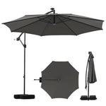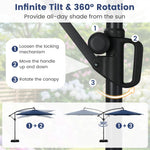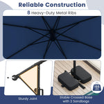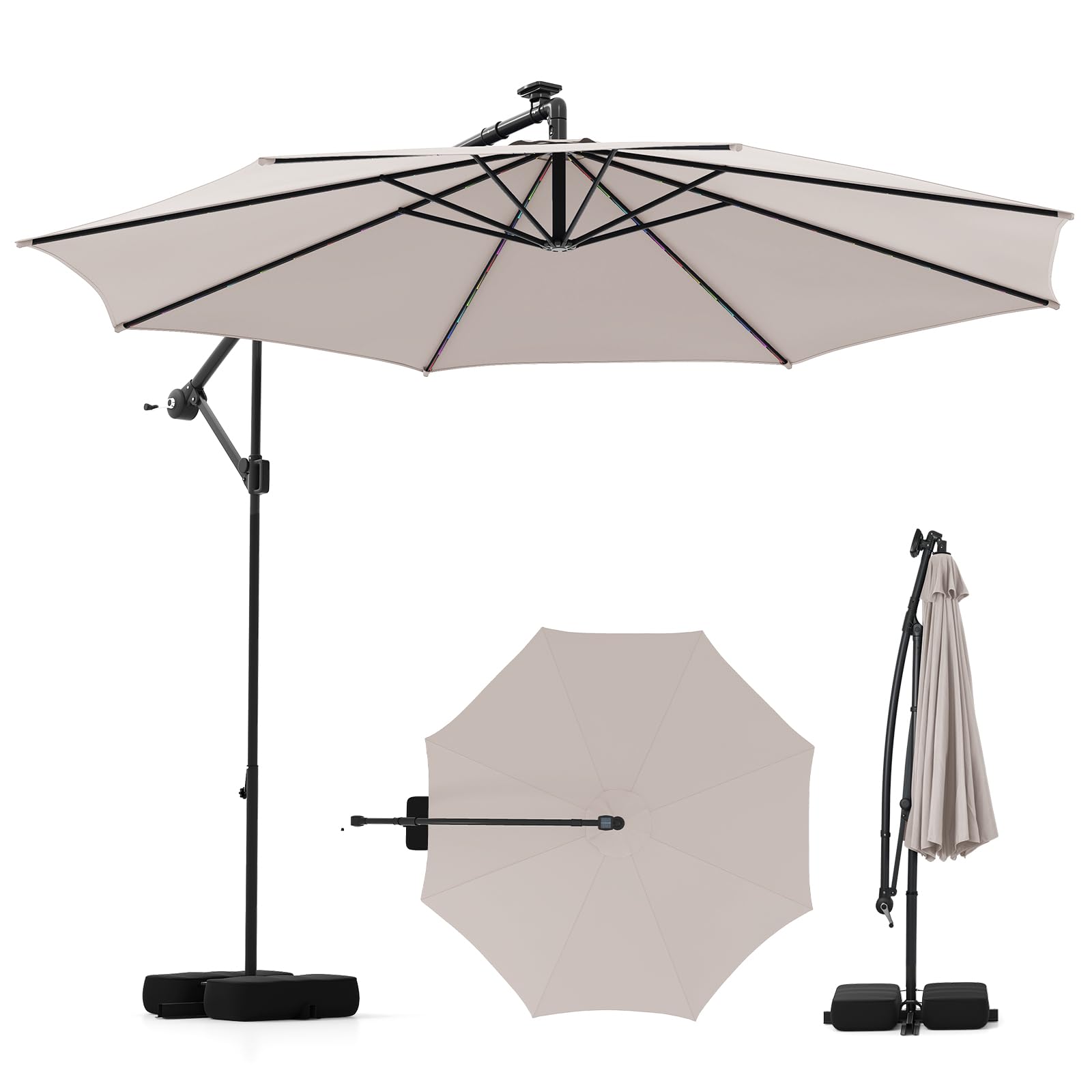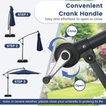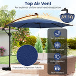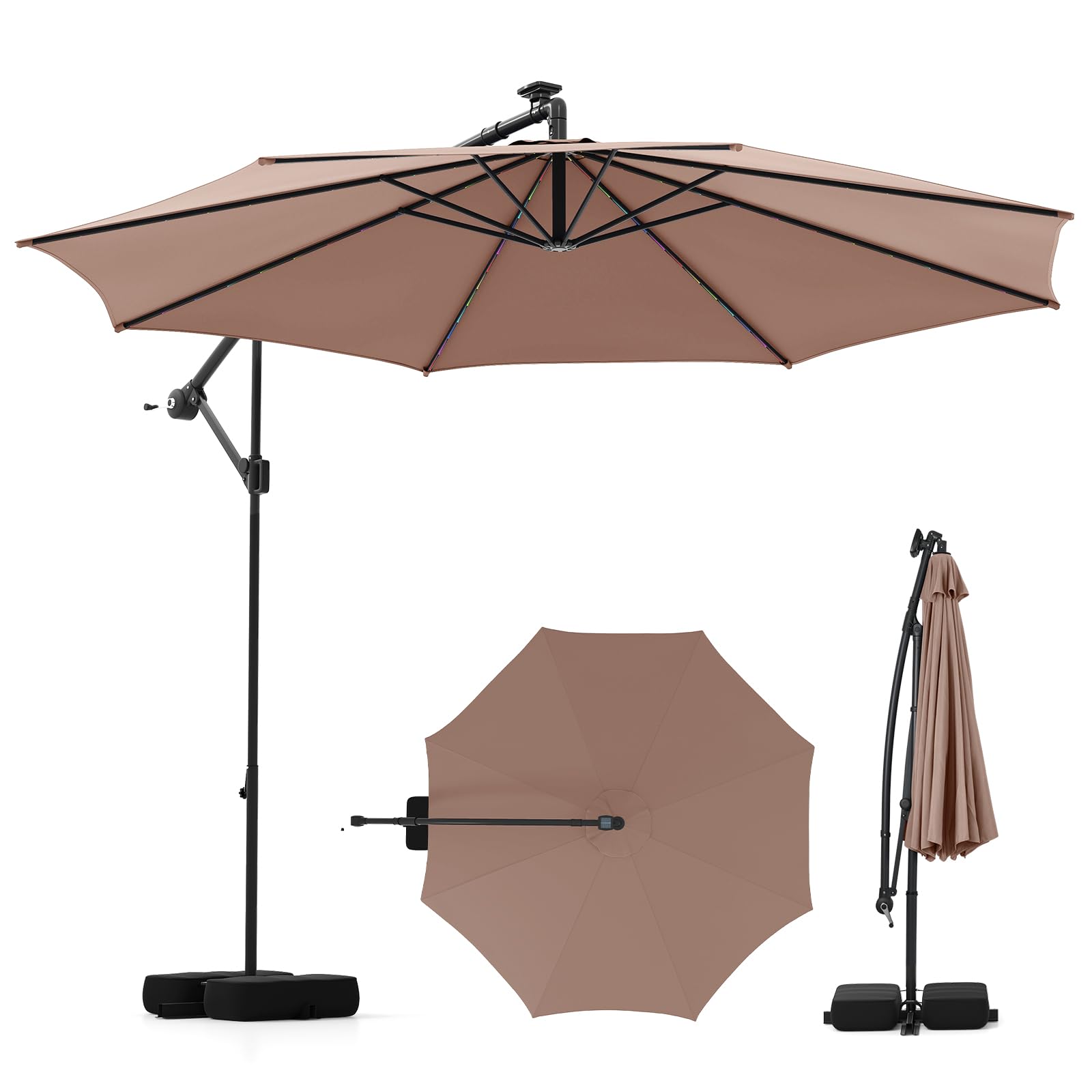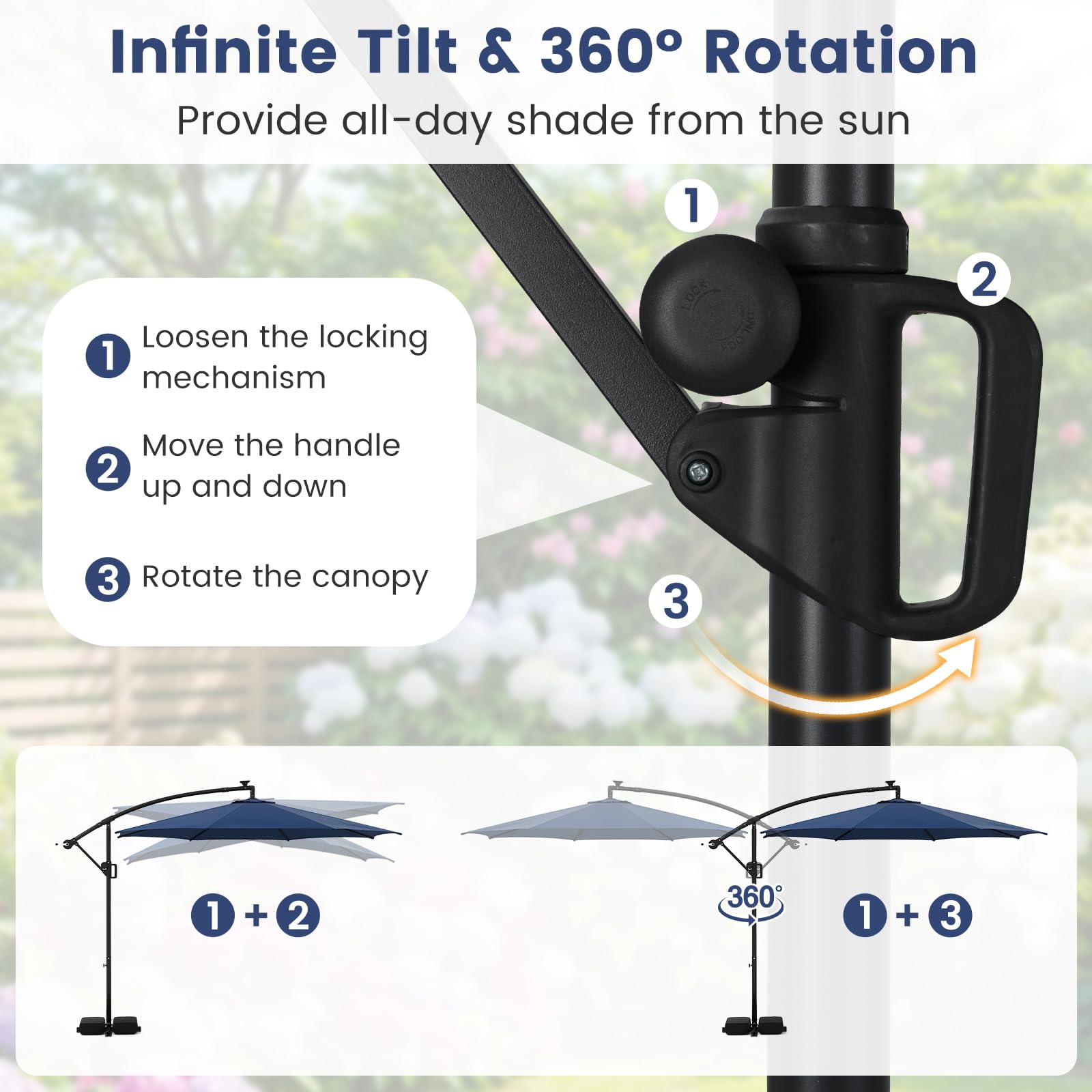 Our 10 ft offset hanging umbrella not only provides a generous shade area but also enhances evening experiences with its 96 LED lights powered by a solar panel. And there are 9 lighting modes available, including static and dynamic modes, allowing you to customize the atmosphere of your outdoor gatherings or personal relaxation time effortlessly. Stability is paramount with our umbrella, supported by 8 robust ribs and secured with a cross base and 2 sandbags capable of withstanding up to 135 lbs. The premium double-tier polyester canopy offers superior protection from the sun and light rain while facilitating air flow through a smartly placed top vent, thus minimizing wind pressure. Designed to provide all-day sunshade, the canopy can be easily tilted as well as rotated 360° using a straightforward locking mechanism. It caters to both residential leisure and commercial use, providing an ample cool area for backyards, pool sides, and outdoor dining spaces.