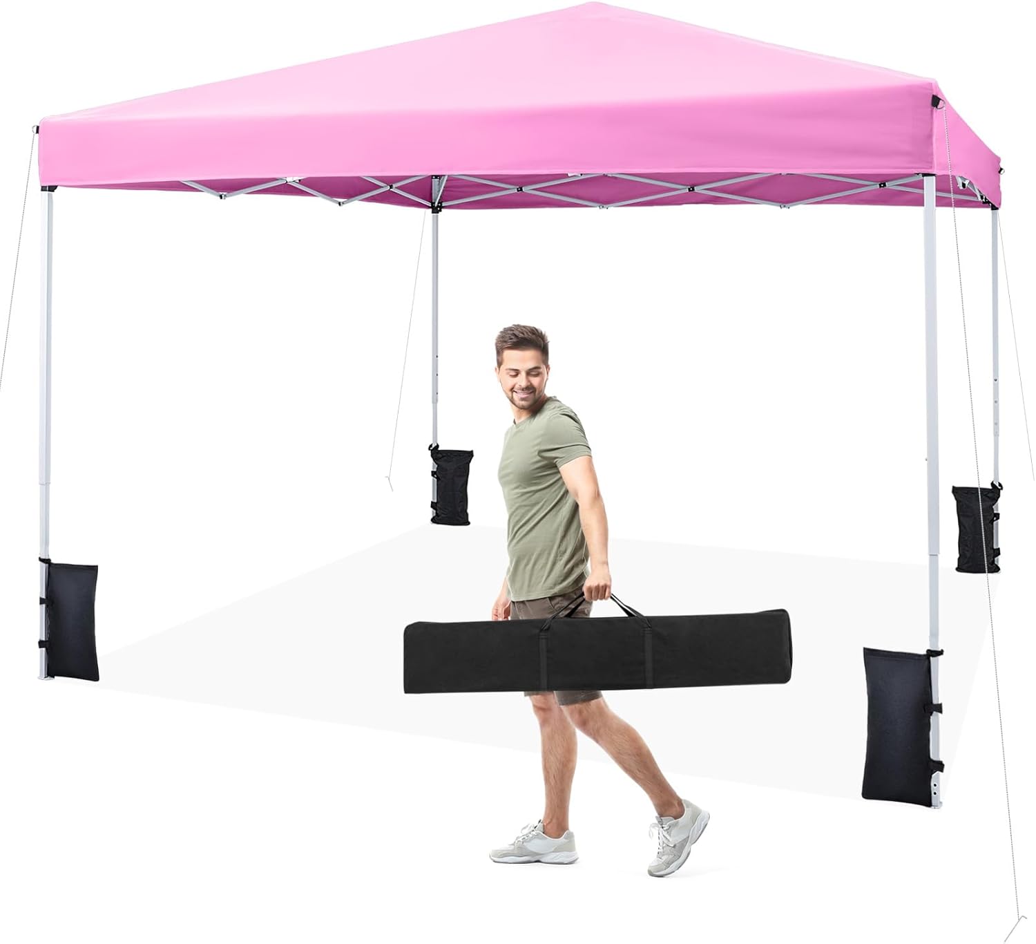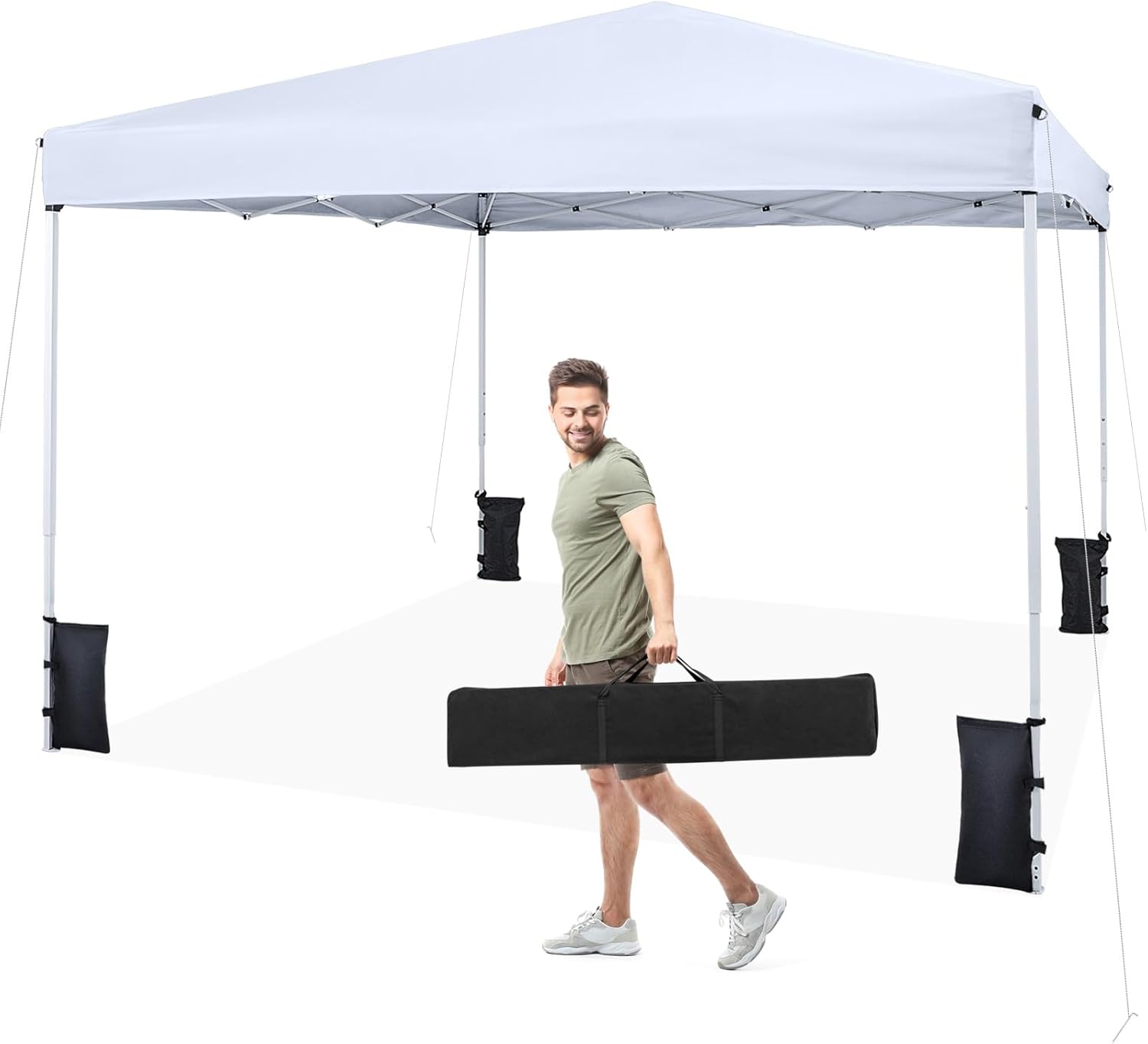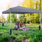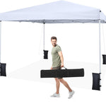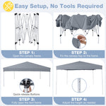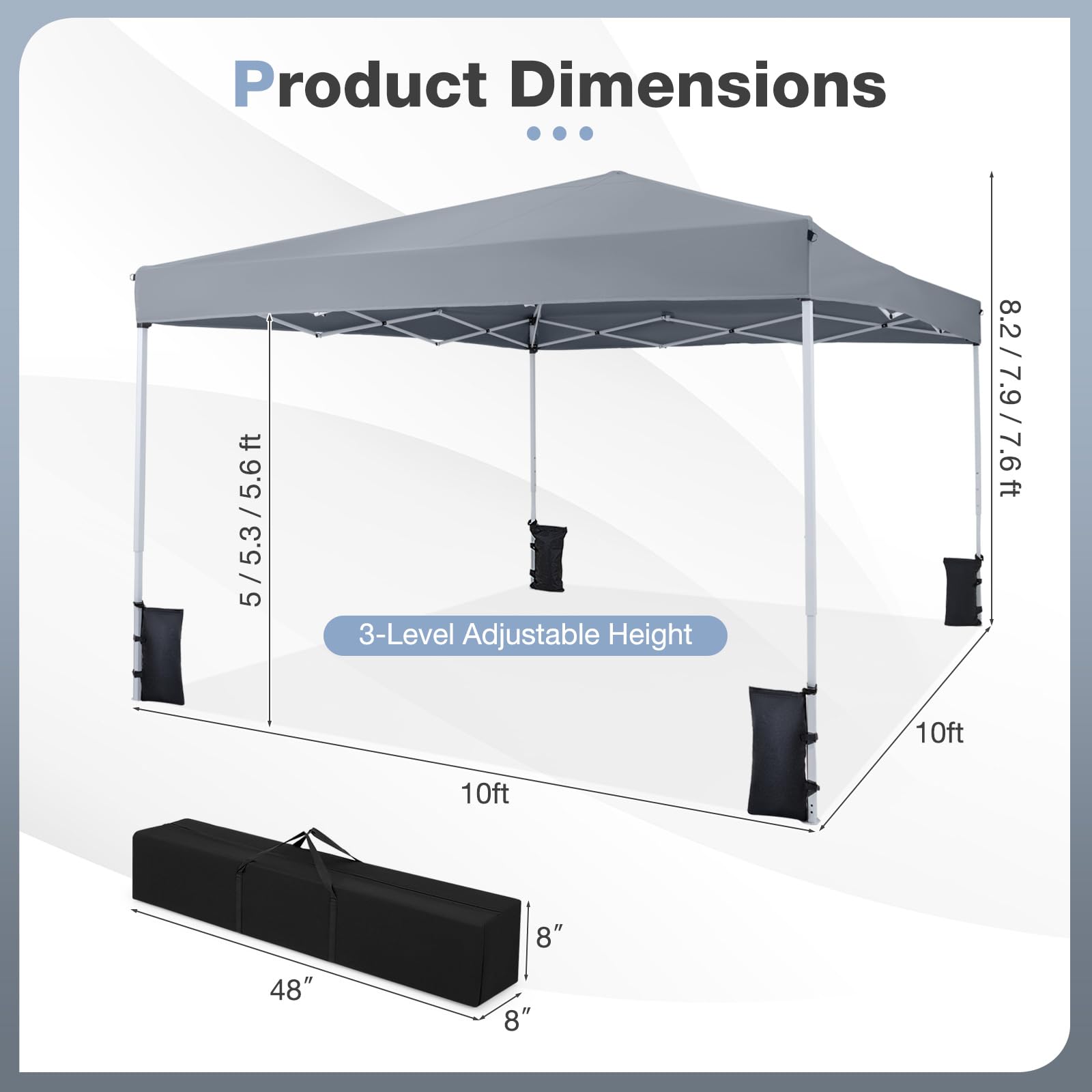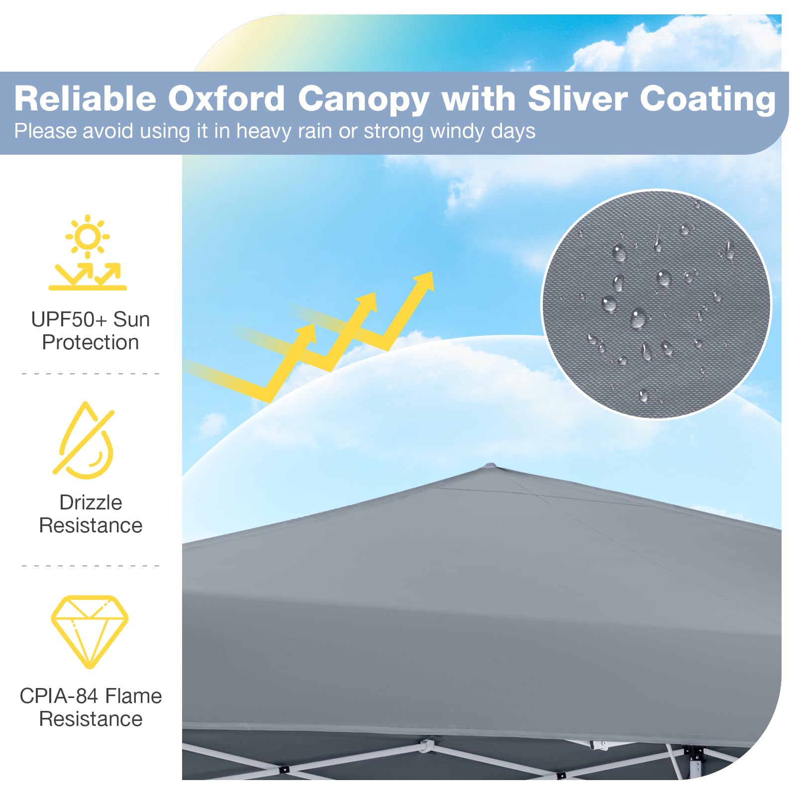 Our foldable and portable canopy tent measures 10 x 10 x 7.6-8.2 ft (L x W x H), with 3 easily adjustable height positions, accommodating various outdoor activities, whether for family barbecues, festivals, vendor booths, or backyard relaxation. Its innovative pop-up structure allows for swift setup without the need for tools, and when not in use, you can easily collapse it and store it in a carrying bag, making transport and storage hassle-free. With its heavy-duty truss carbon steel frame and reinforced by sandbags, ground stakes, and wind ropes, this canopy is designed for impressive stability and security on various surfaces. The high-quality oxford cloth top features a protective silver coating, providing reliable resistance against sun and light rain, while its flame-retardant construction keeps safety front and center. Please note, this shelter is intended for temporary set-up, so secure it firmly at all times and avoid use in extreme weather to ensure durability and longevity.