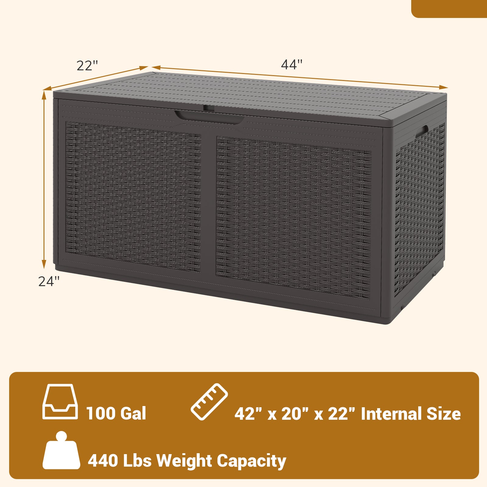 It provides a generous 100-gallon capacity for your storage needs and can perform perfectly as a bench or a table. Furthermore, the robust construction supports up to 440 lbs, allowing the patio box to comfortably seat 2 people. Plus, it features a lockable lid to safeguard your belongings and is supported by metal gas struts and a reinforced metal rod. The delivery box is equipped with smooth wheels and side handles, making relocation simple and stress-free. The faux wicker finish adds a touch of sophistication and is crafted to seamlessly complement your outdoor decoration. Elevate your outdoor living with this multi-use storage solution, a must-have for a well-organized and elegant outdoor area.