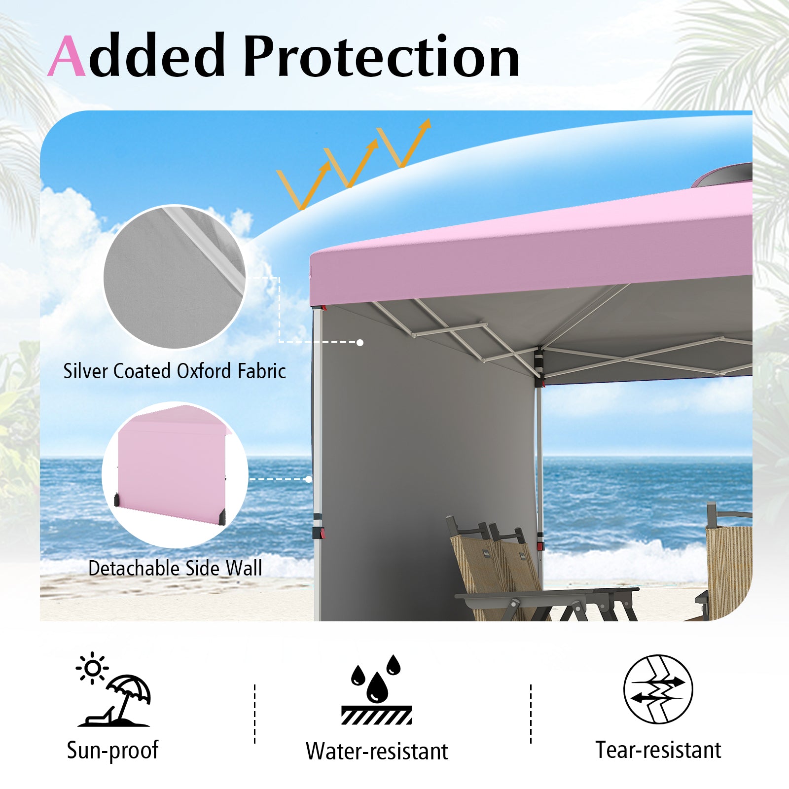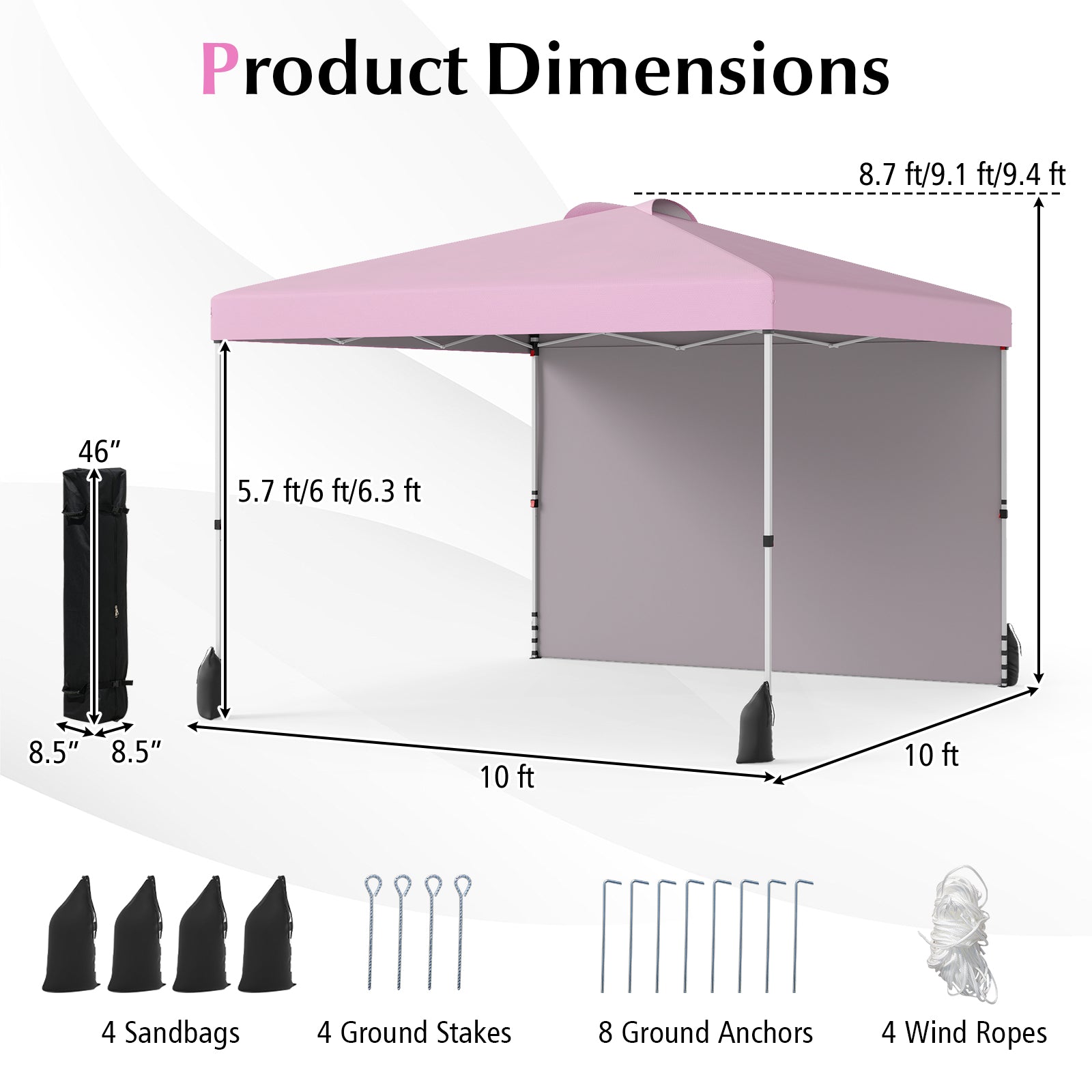 Crafted from tear-resistant oxford fabric with a silver coating, the outdoor sun shelter delivers sun and light rain protection, while promising durability. The pop-up canopy tent boasts a spacious shade coverage of 10 x 10 ft (L x W x H). Additionally, the 3-level adjustable heights and a detachable sidewall offer customizable comfort. More than that, the top vent ensures a cool experience. To fortify against wind, the canopy comes with 8 ground stakes, 4 anchors, 4 wind ropes, and 4 sandbags, ensuring a stable outdoor shade solution. Furthermore, the easy set up canopy tent ensures effortless assembly tools. Meanwhile, its collapsible design and included wheeled bag allow for convenient storage. Therefore, the beach sunshade is ideal for various occasions such as parties, weddings, or picnics.