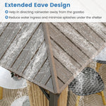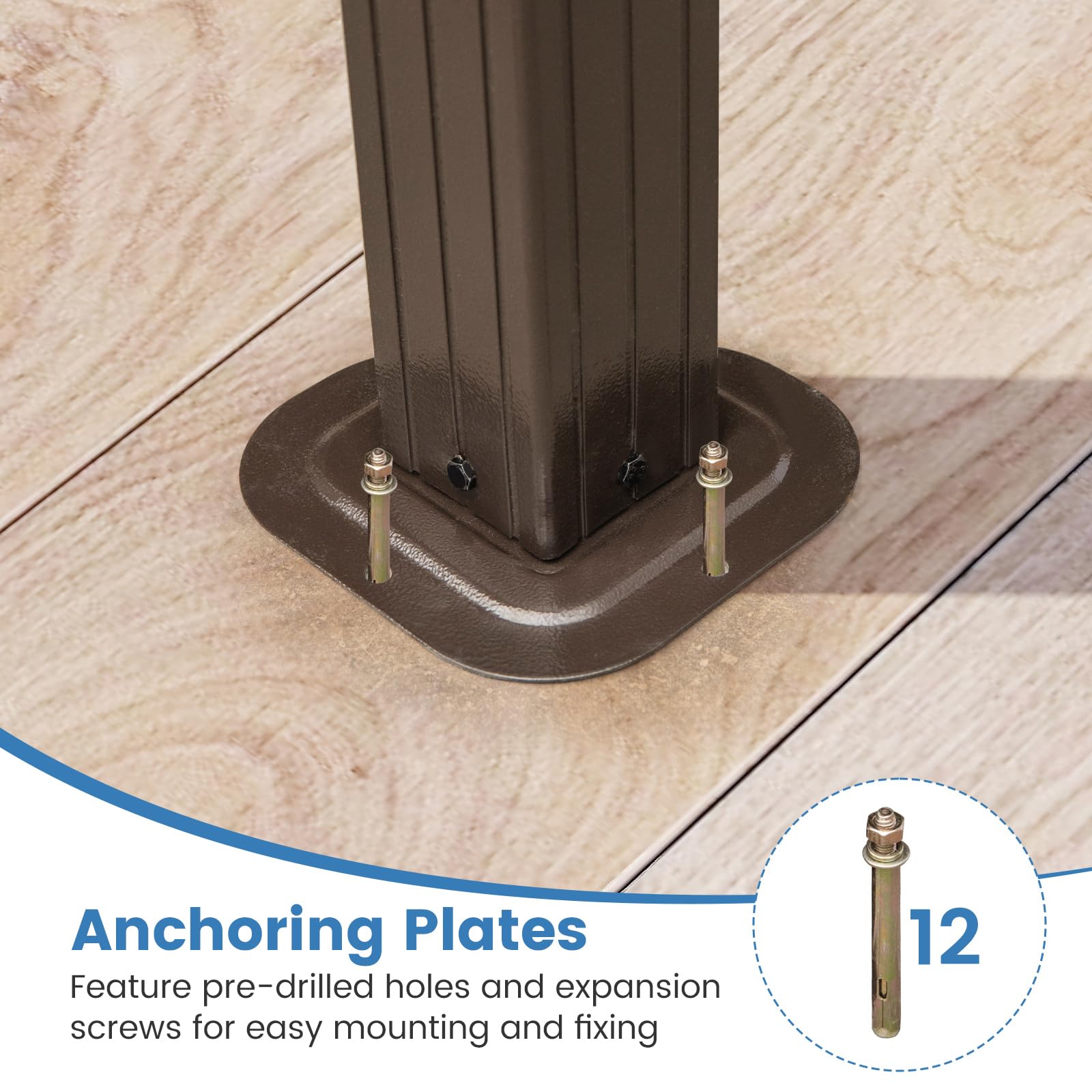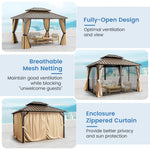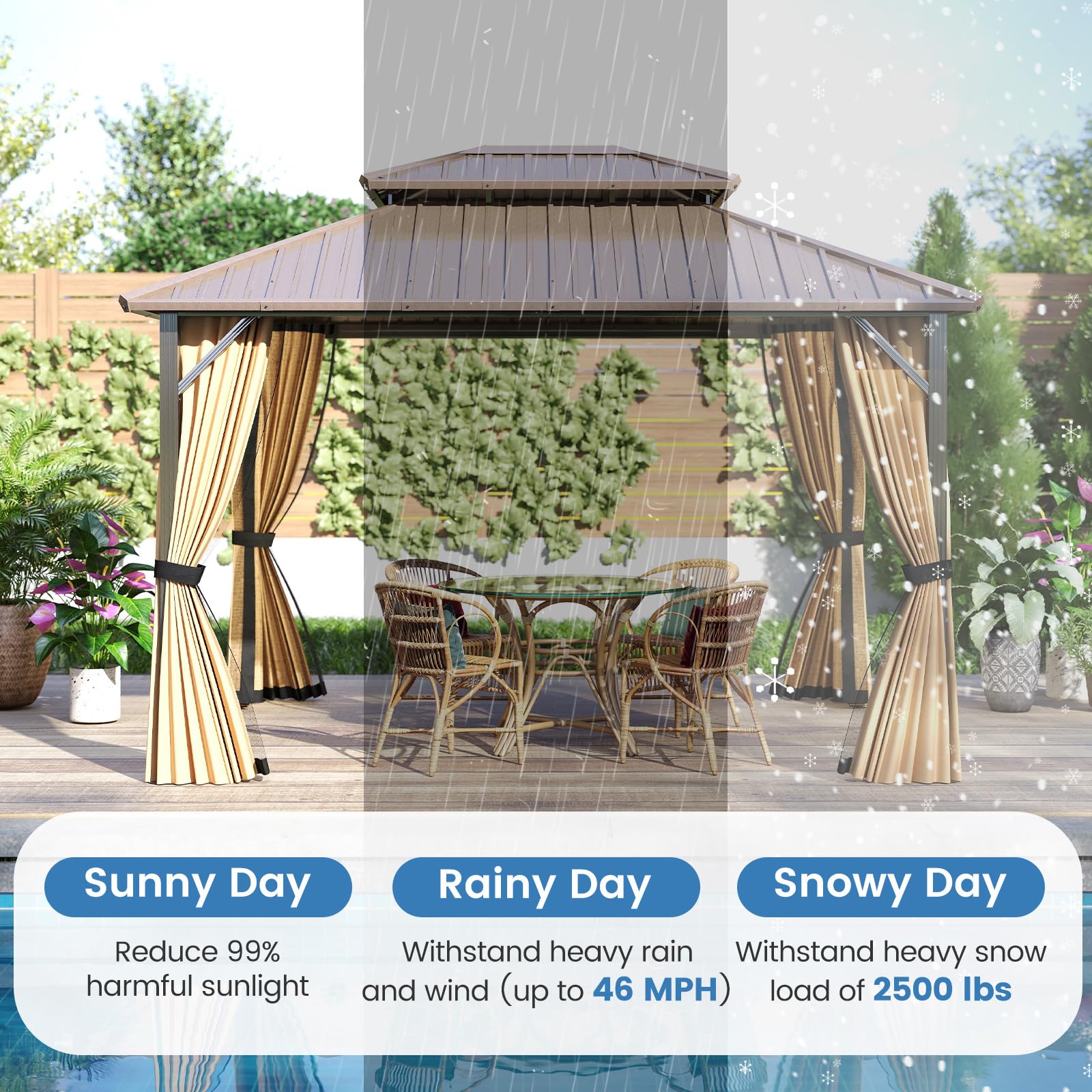 Our 10 x 12 ft hardtop gazebo comes with a double-layer galvanized metal roof, ensuring good ventilation while offering superior protection from sun, rain, wind, and snow, which is a perfect year-round heaven for outdoor gathering. The aluminum frame is engineered for durability and stability, resistant to rust and reinforced with anchoring plates, including 12 expansion screws for securing of concrete floors, ensuring it remains securely anchored in place even during rough weather. Besides, featuring integrated double-layer sidewalls, complete with mesh netting and zippered curtains, you can enjoy an intimate setting free from "unexpected guests" and prying eyes, or open up to let the breeze flow through on warmer days. The addition of a ceiling hook provides versatile options to enhance the ambiance, easily hanging a light, fan, or flower basket to customize your setup for any event. From leisurely afternoon tea to lively evening parties, this gazebo is spacious enough to host a variety of activities!