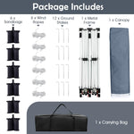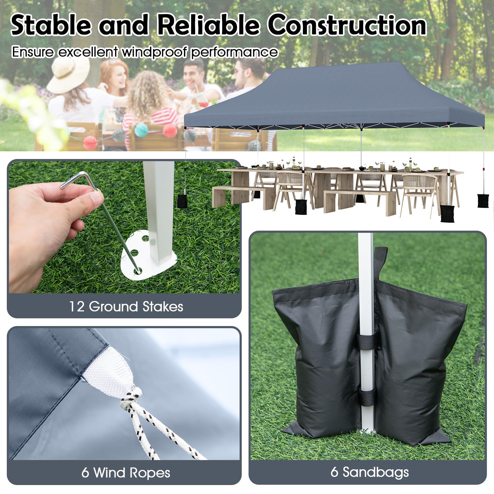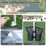 - Stable and Reliable Construction: The large sunshade shelter is supported by a high-strength powder-coated metal frame, secured with sturdy truss connection. Stability is further enhanced by 12 ground stakes, 6 wind ropes, and 6 sandbags that anchor the tent firmly in place, making it suitable for various weather conditions.
