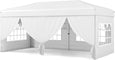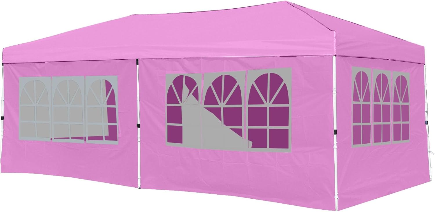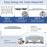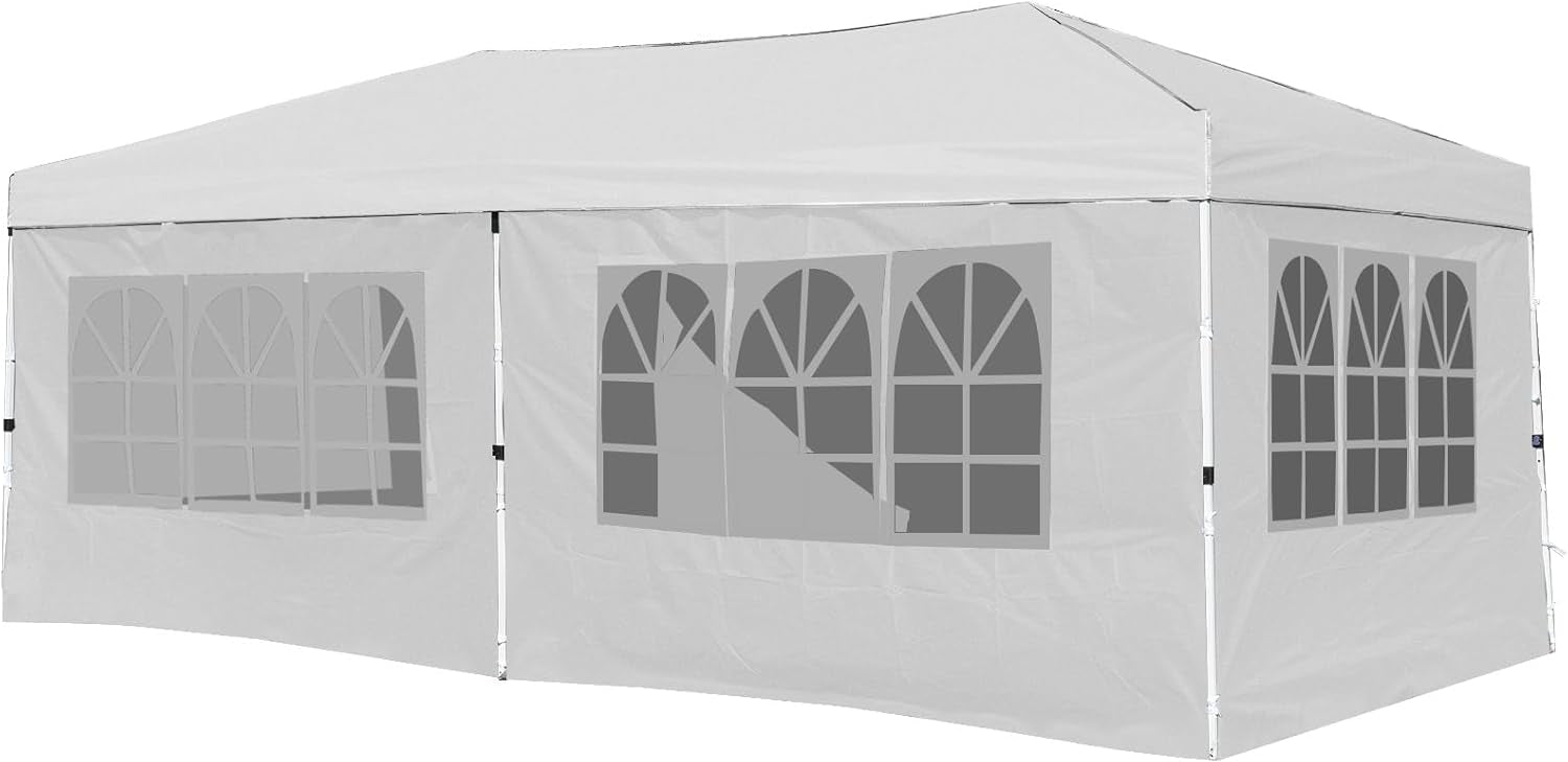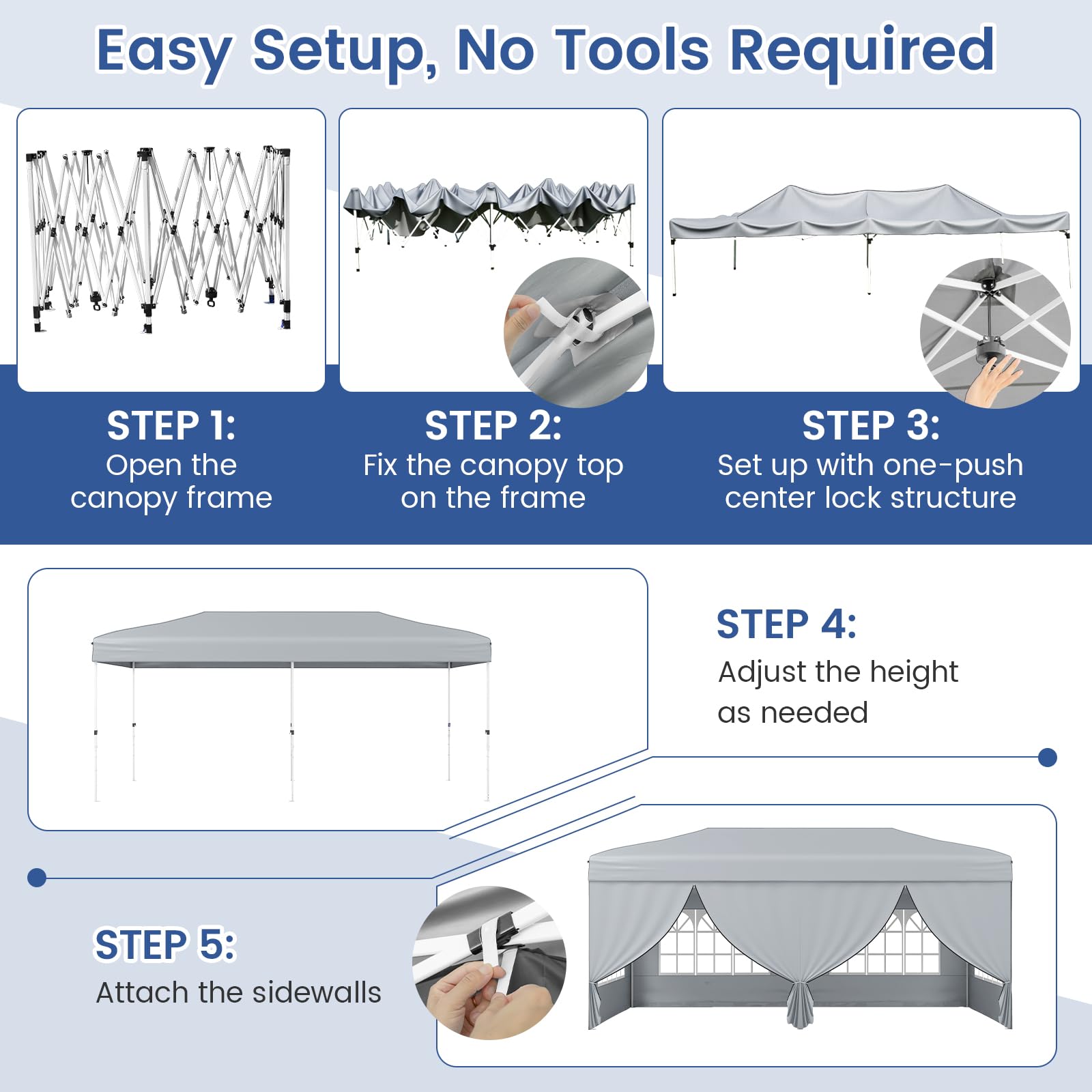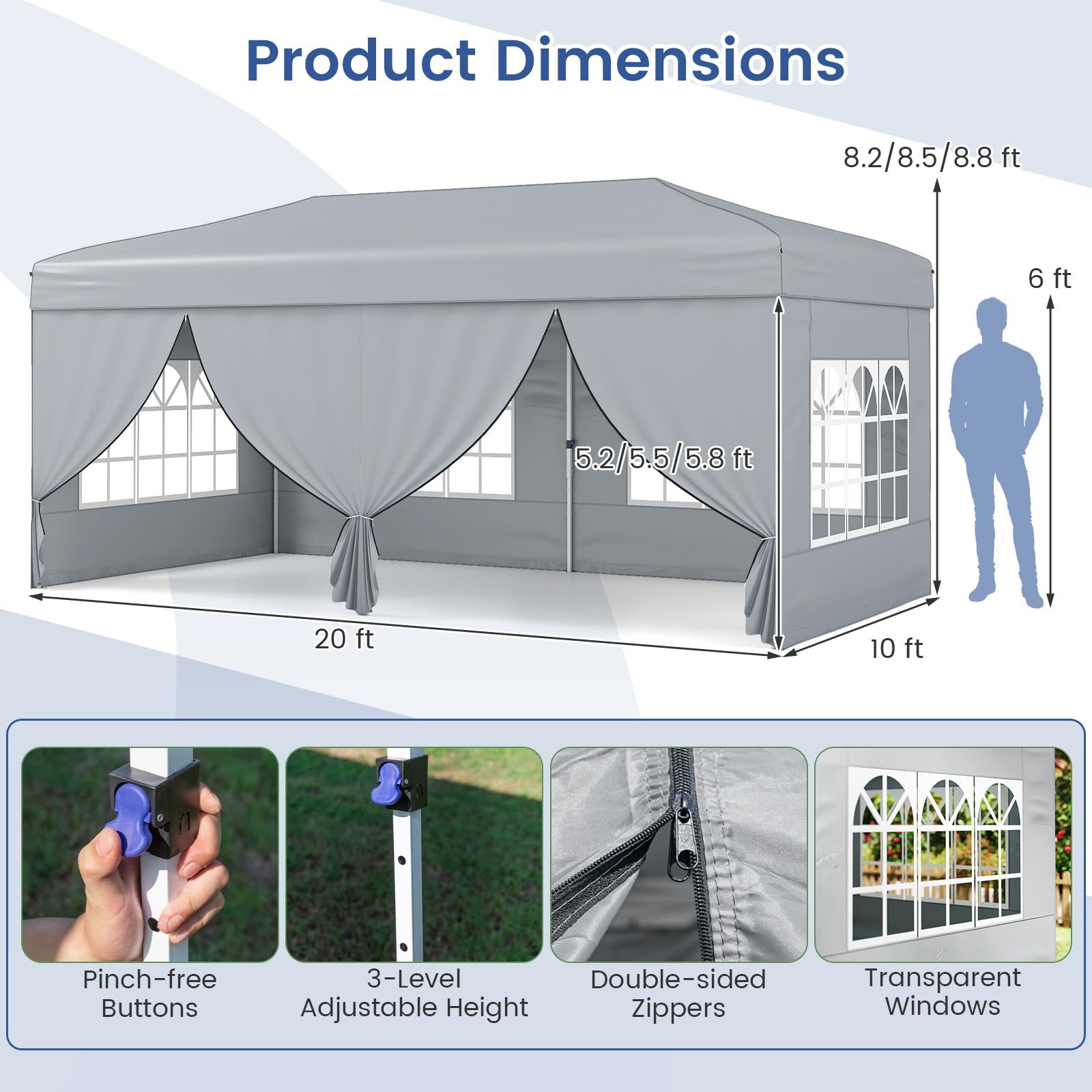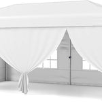 Our foldable and portable outdoor canopy tent measures 10 x 20 x 8.2-8.8 ft(L x W x H), offering a premium solution for outdoor shade, gatherings, and events. Thanks to an advanced one-hand center lock system, you can set up or take down the sturdy carbon steel frame effortlessly, saving time and energy. The included set of zippered and windowed sidewalls can be arranged in any combination, letting you easily adapt privacy and airflow for occasions like parties, weddings, or market booths. Engineered for reliability, the reinforced truss structure, additional wind ropes, ground stakes, and sandbags ensure solid anchoring for stability in changing weather. The canopy’s Oxford cloth with a silver coating delivers UPF50+ sun protection, and meets flame resistance safety standards - making it a dependable choice for both sunny and drizzly days. Height adjustments can be made quickly with pinch-free buttons, and the entire tent conveniently fits in a wheeled storage bag, making transport and storage straightforward whether you’re at home, the park, or on the go.