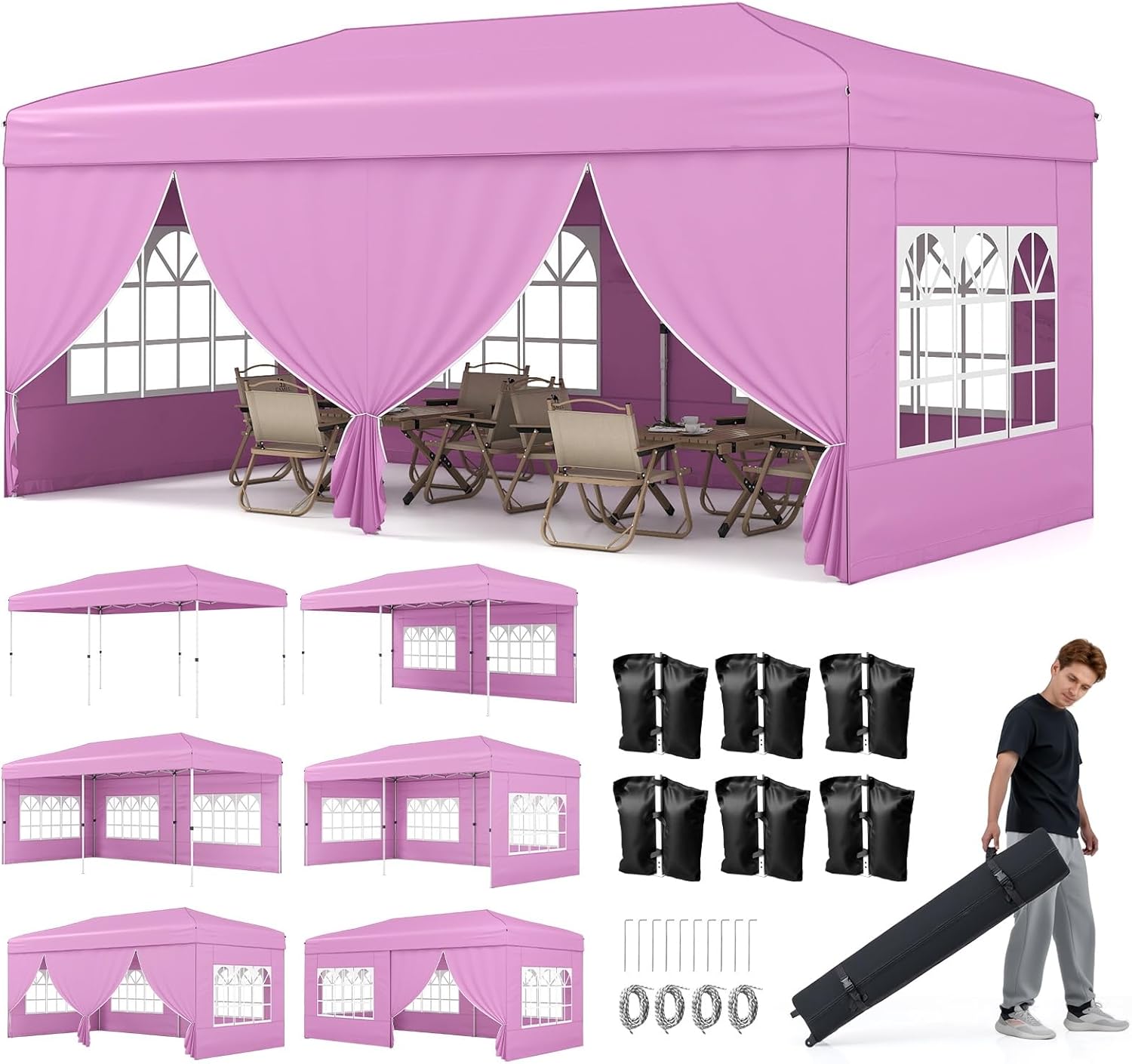 6 sandbags 10 ground stakes, and 6 wind ropes add stability at each corner