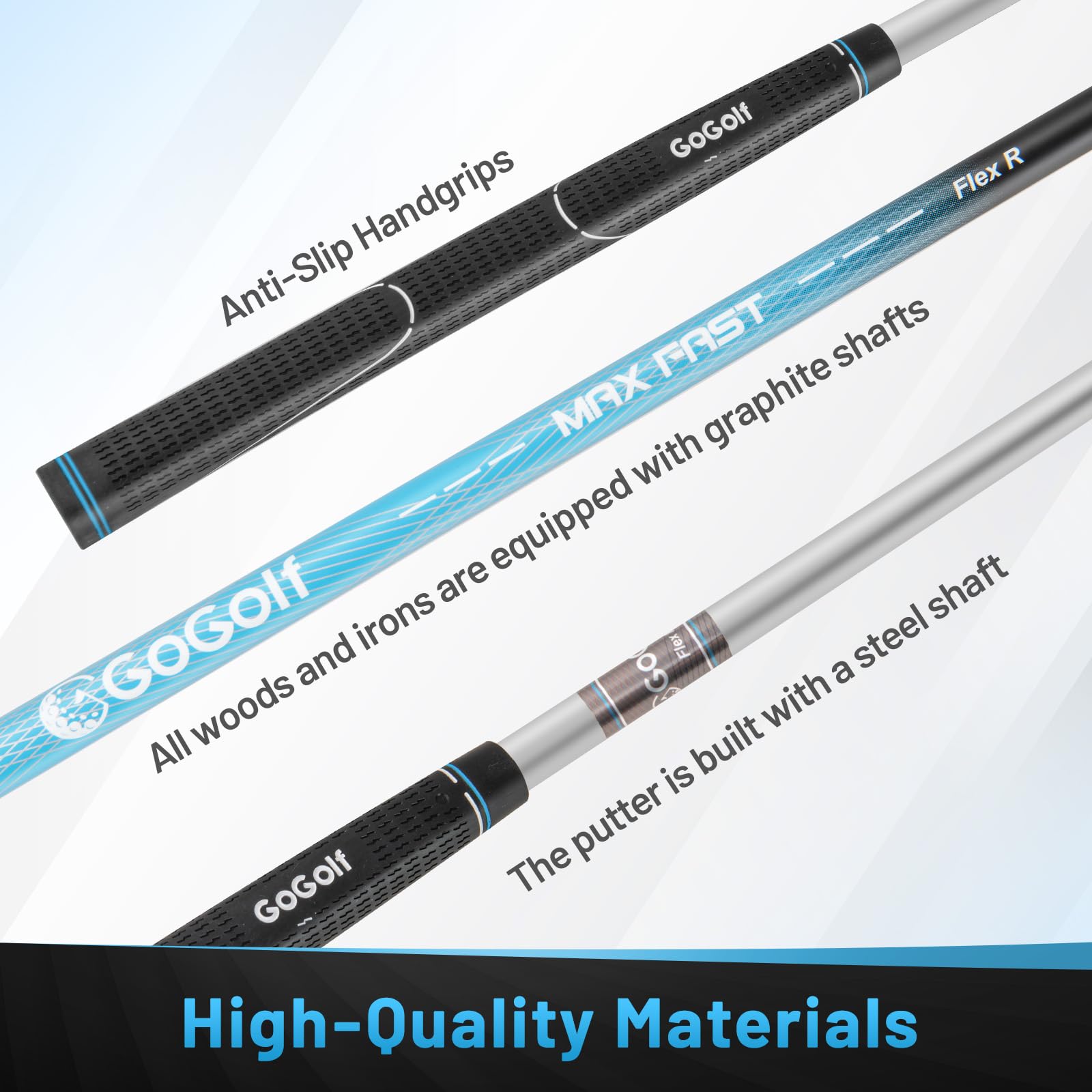 You will experience high-performance woods and irons with graphite shafts for optimal play. The irons' low center of gravity and cavity back design enhance stability and forgiveness, while the putter aids in precise putting. The lightweight and portable golf bag features ample storage, ensuring comfort and organization on the course.