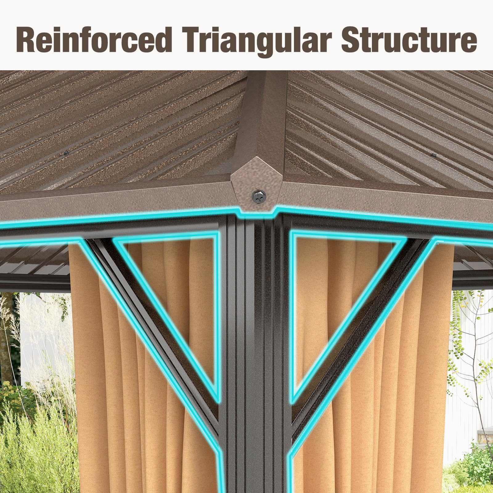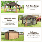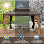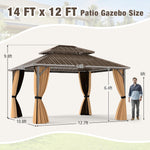 Our 12 x 14 ft hardtop gazebo comes with a double-layer galvanized metal roof, ensuring good ventilation while offering superior protection from sun, rain, wind, and snow, which is a perfect year-round heaven for outdoor gathering. The aluminum frame is engineered for durability and stability, resistant to rust and reinforced with anchoring plates, including 12 expansion screws for securing of concrete floors, ensuring it remains securely anchored in place even during rough weather. Besides, featuring integrated double-layer sidewalls, complete with mesh netting and zippered curtains, you can enjoy an intimate setting free from "unexpected guests" and prying eyes, or open up to let the breeze flow through on warmer days. The addition of a ceiling hook provides versatile options to enhance the ambiance, easily hanging a light, fan, or flower basket to customize your setup for any event. From leisurely afternoon tea to lively evening parties, this gazebo is spacious enough to host a variety of activities!