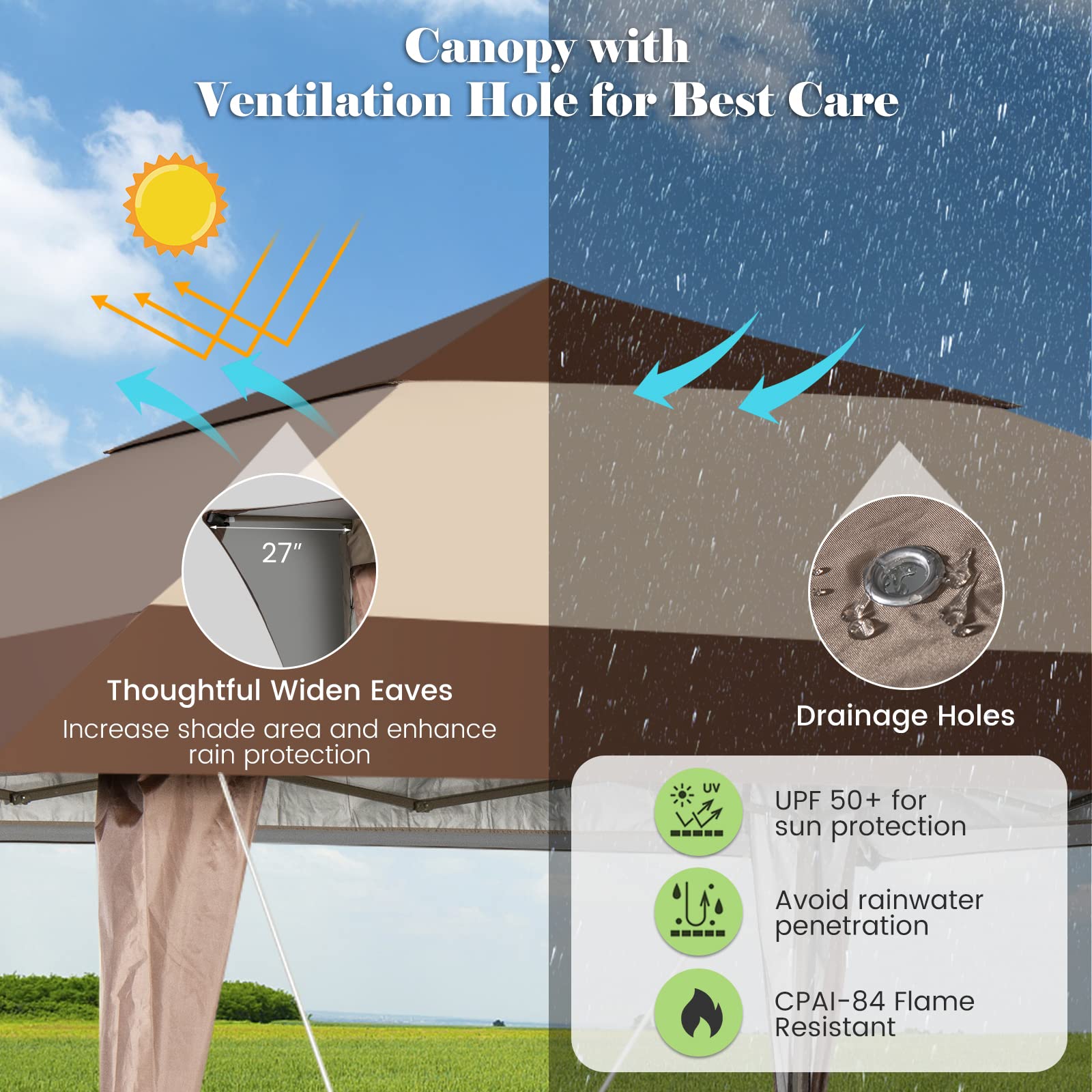 - Widen Shade & Vented Top: With 27" wide eaves, the 13"x 13" gazebo offers 169 square feet of shadow for 8-10 people to stay cool at the same time. Besides, the top 2-tier design allows internal and external air to flow smoothly, dissipating interior heat while bringing in fresh air. This feature also offsets wind power. Together with a strong steel frame, the gazebo stands stably on your patio.