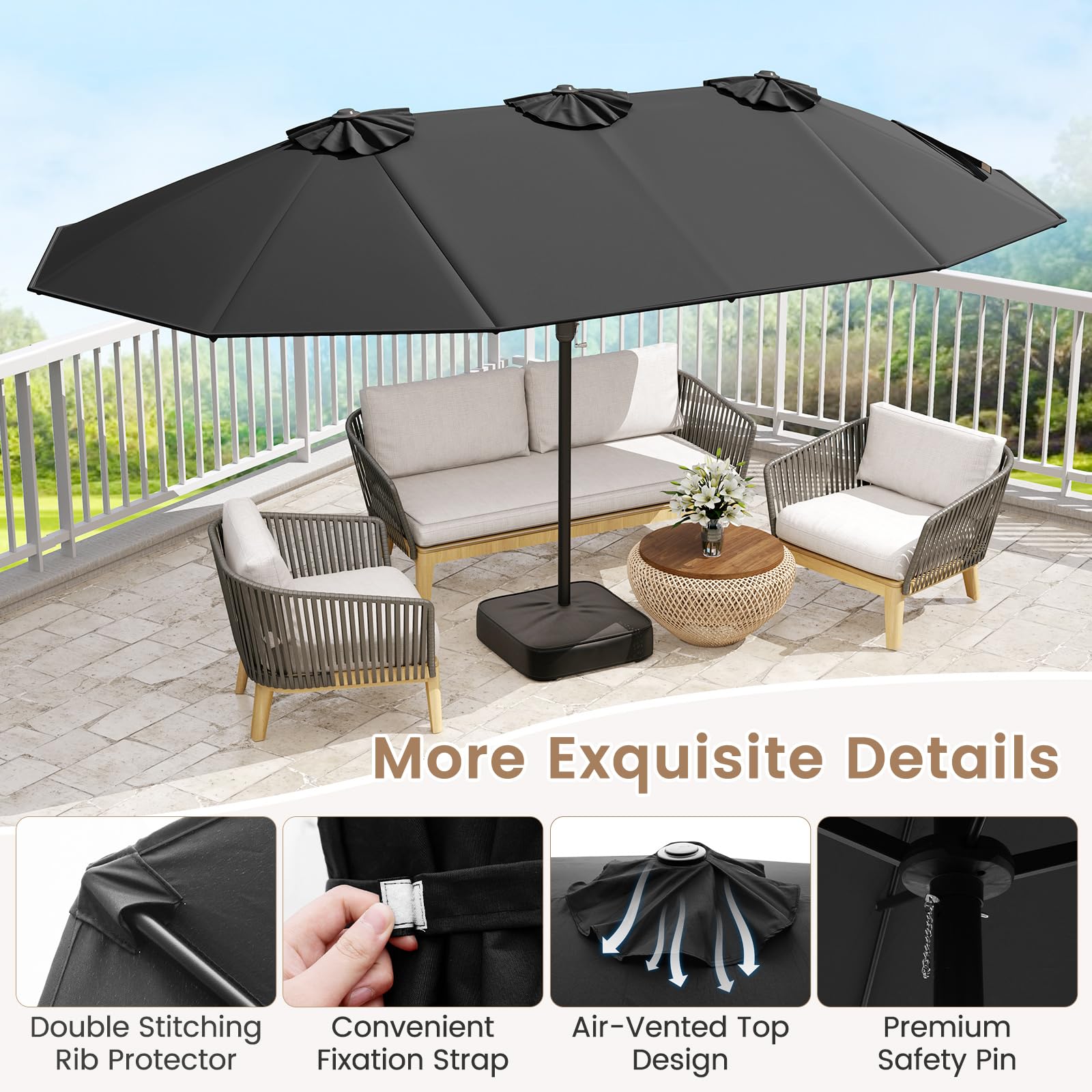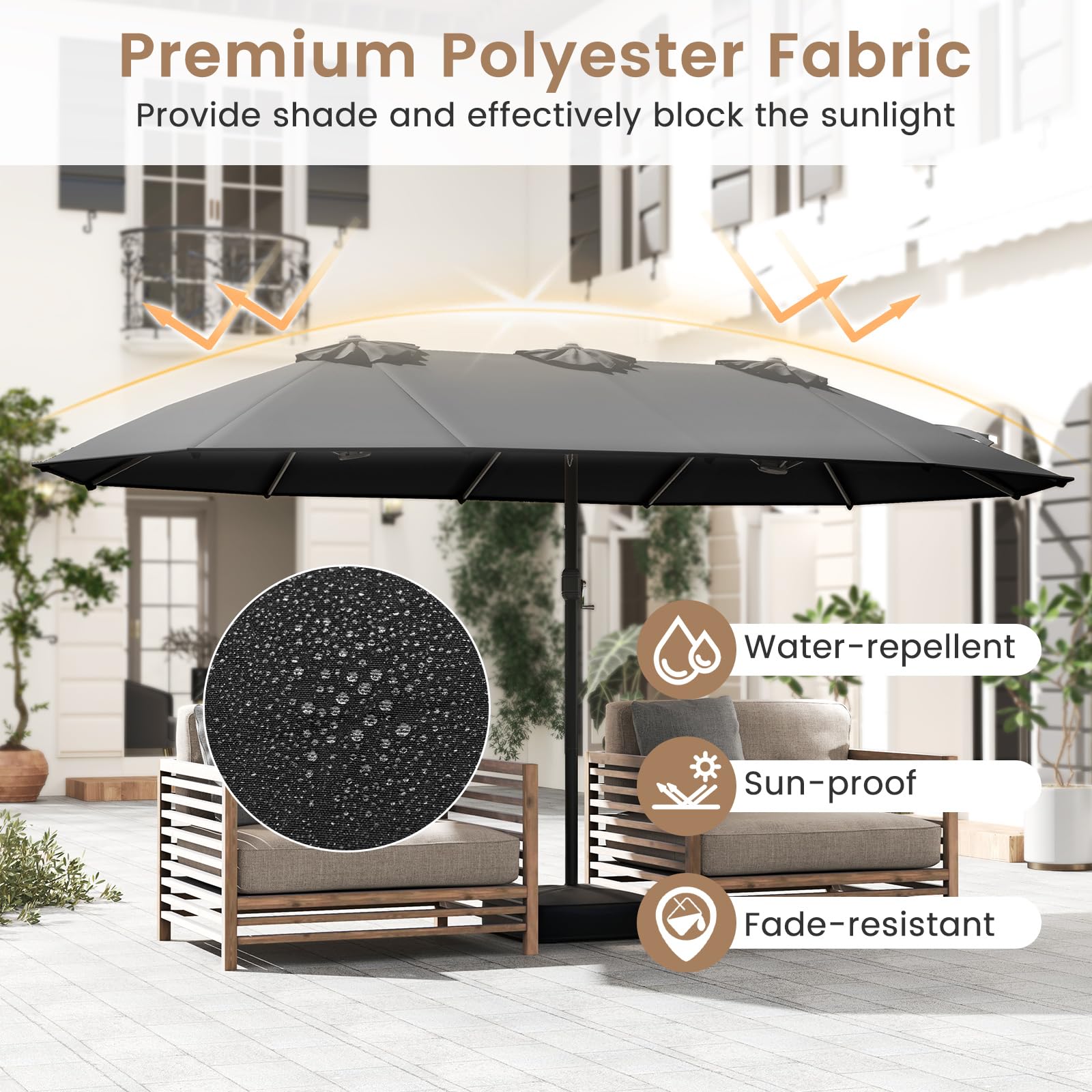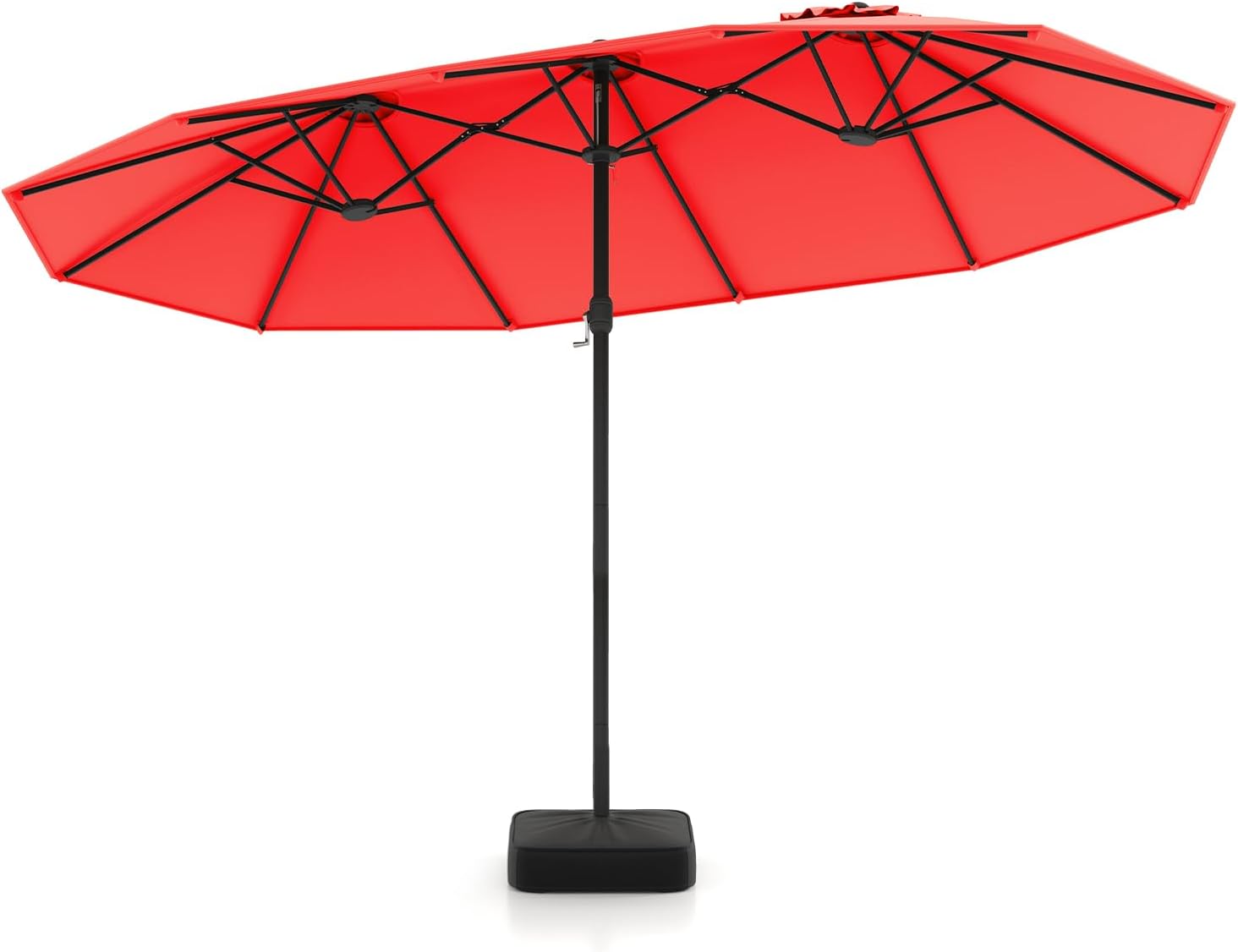 Our double sided patio umbrella provides a large area of shade for your summer! With the canopy in the length of 15ft, this umbrella can accommodate more than a complete set of sofa, creating a shady place when you spend leisure time with family and friends. Compared with others, our umbrella comes with a metal base frame and 2 sandbags (sand not included) to enhance stability. When not in use, you can easily close and secure the umbrella with the crank mechanism and strap. The canopy is made of polyester fabric that is sun protective and fadeless, maintaining brand new performance for a long time. In addition, the heavy-duty iron structure with powder-coated feature can stand the test of time and ensure safety. This umbrella is not only ideal for residential use in garden and backyard, but also a perfect choice for commercial places, like café, outdoor market, etc.
