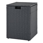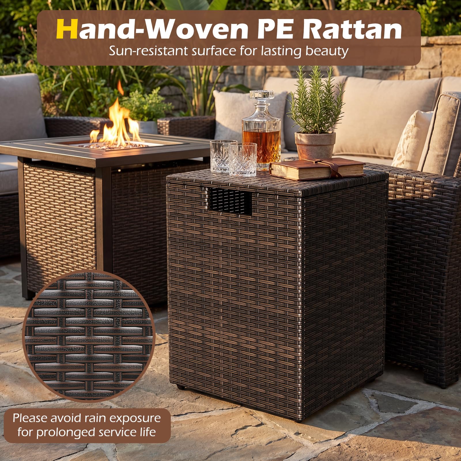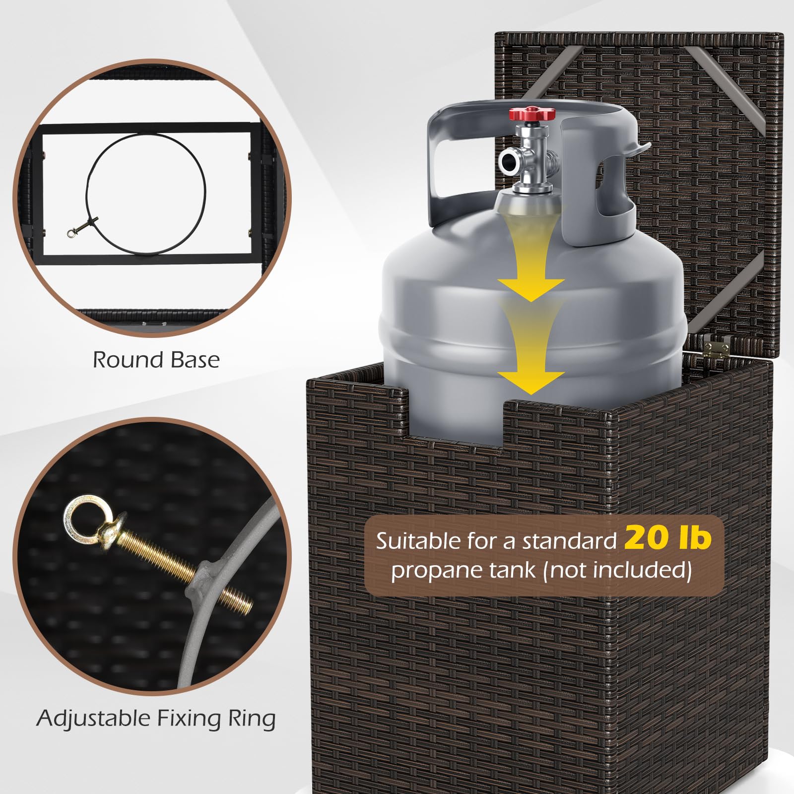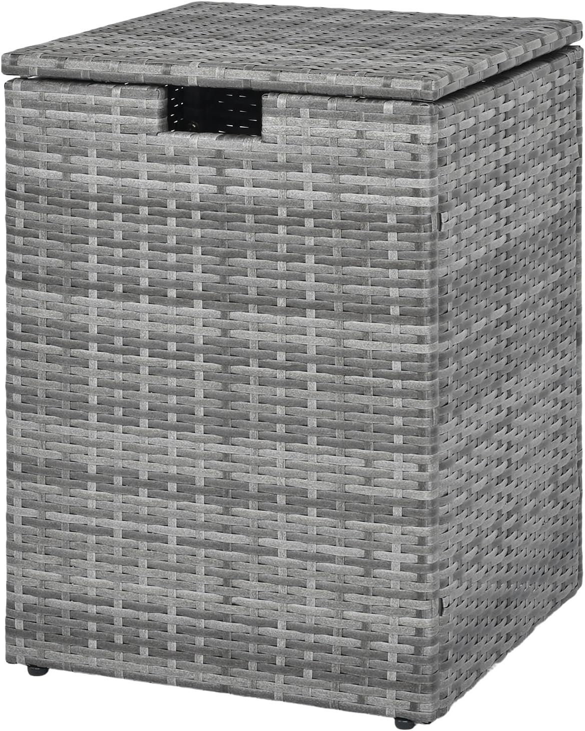 Made with hand-woven PE rattan, this gas tank storage side table offers a sun-resistant surface for lasting beauty. The innovative flip lid with a cut-out handle allows easy operation, while the reliable fixing ring safely keeps your 20 lb propane tank (not included). Featuring a robust metal frame and adjustable foot pads, the square propane tank holder is stable on different surfaces, serving as a fantastic addition to your patio, garden, poolside, etc. Overall, this hideaway tank table is ideal for grills, fire pits, and other outdoor appliances, ensuring your space is tidy and secure.