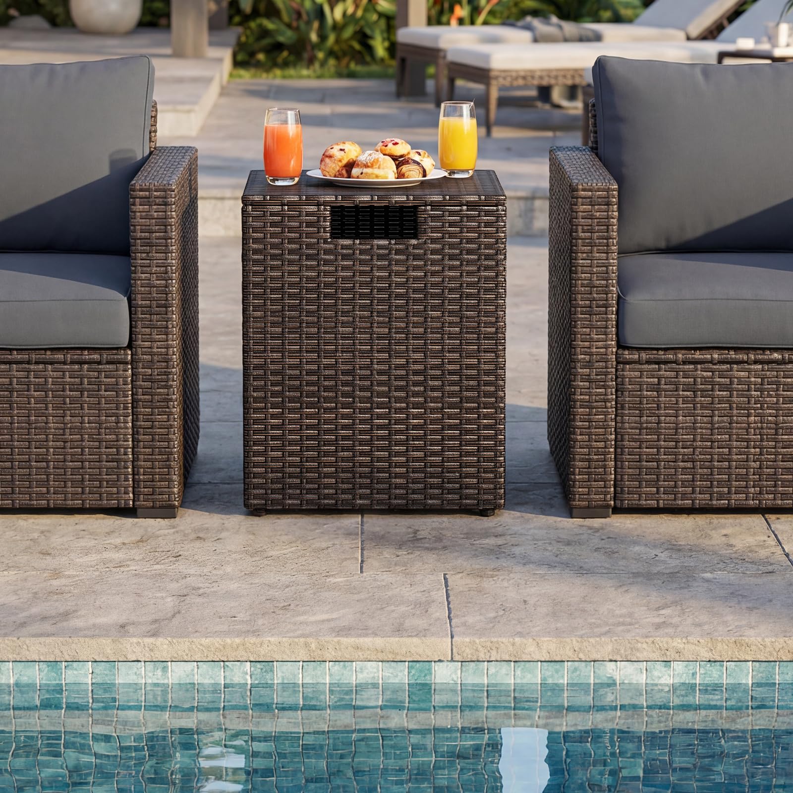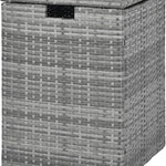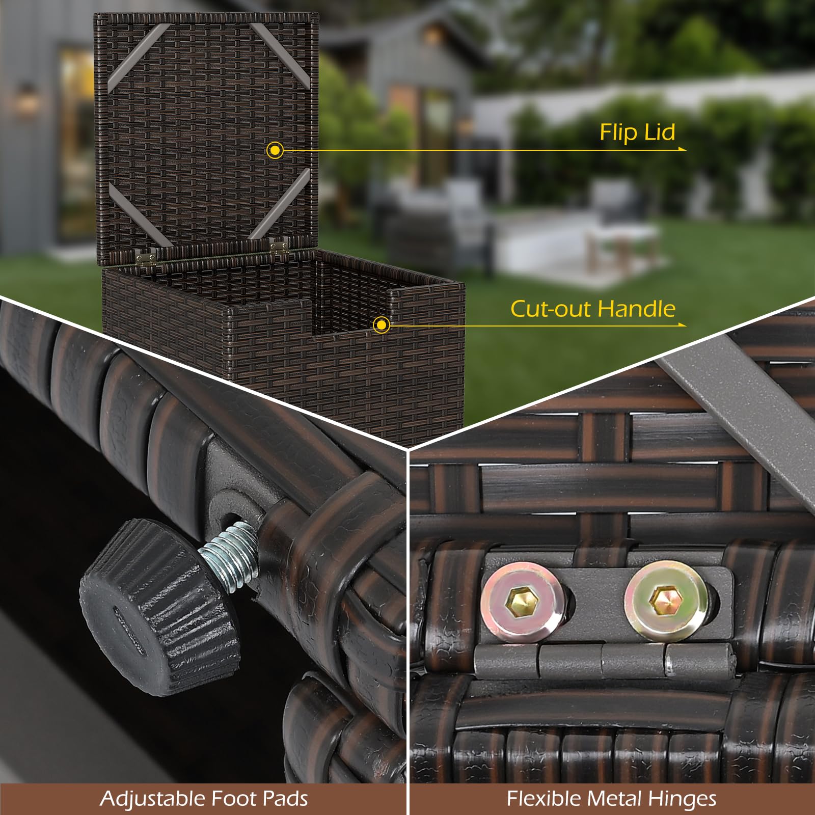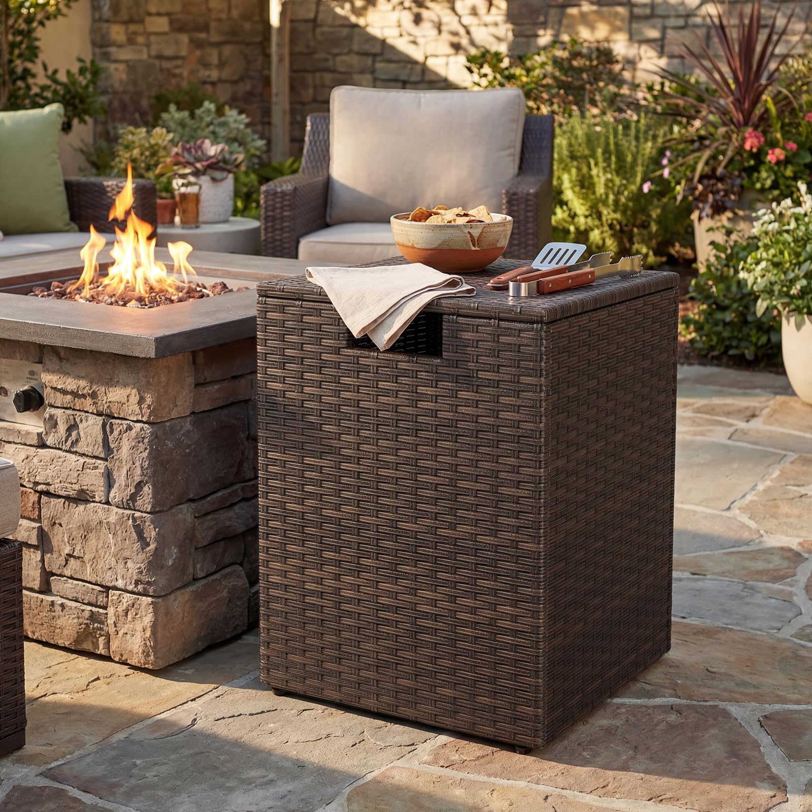 Made with hand-woven PE rattan, this gas tank storage side table offers a sun-resistant surface for lasting beauty. The innovative flip lid with a cut-out handle allows easy operation, while the reliable fixing ring safely keeps your 20 lb propane tank (not included). Featuring a robust metal frame and adjustable foot pads, the square propane tank holder is stable on different surfaces, serving as a fantastic addition to your patio, garden, poolside, etc. Overall, this hideaway tank table is ideal for grills, fire pits, and other outdoor appliances, ensuring your space is tidy and secure.