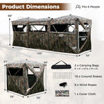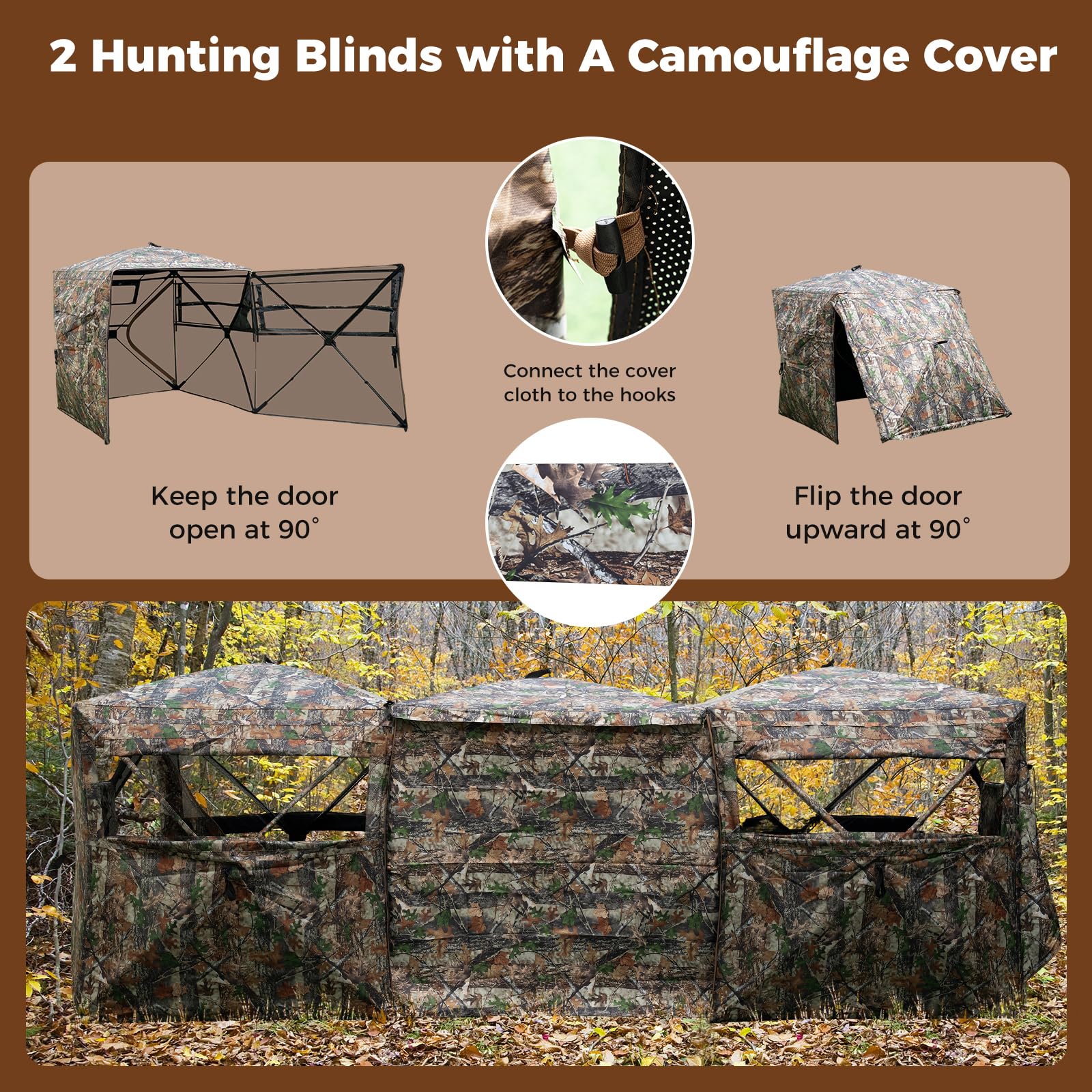 The double hunting blinds are designed for hunters who demand both space and stealth. The modular system allows you to seamlessly join 2 blinds, creating a spacious hide ideal for any scenario. Enhanced with 6 one-way see-through panels and silent observation windows, the pop-up hunting tent provides optimal visibility without ever revealing your position. Adjustable openings with quiet hooks and horn buckles let you customize your concealment, while realistic camouflage patterns and brush-in loops let you blend naturally into any terrain. Entry is discreet thanks to dual small doors. Plus, accessibility is effortless with 2 full-size openings suitable for large gear or wheelchair access. Crafted from waterproof vinyl-coated oxford fabric and reinforced by a robust hub and fiberglass poles, the portable hunting shelter is build to last. Thanks to the pop-up structure and included carrying bag, the hunting ground blind is a breeze to travel with you.