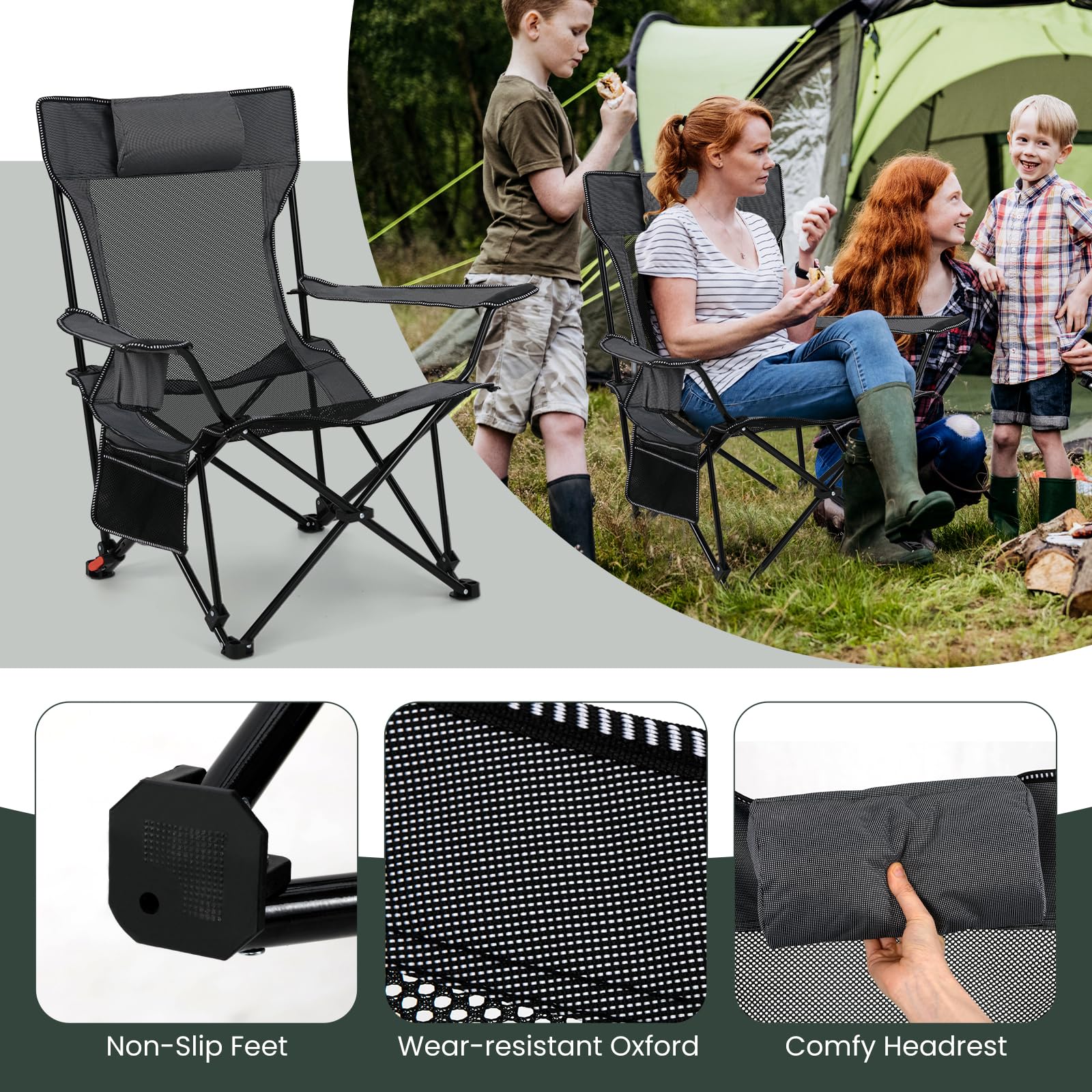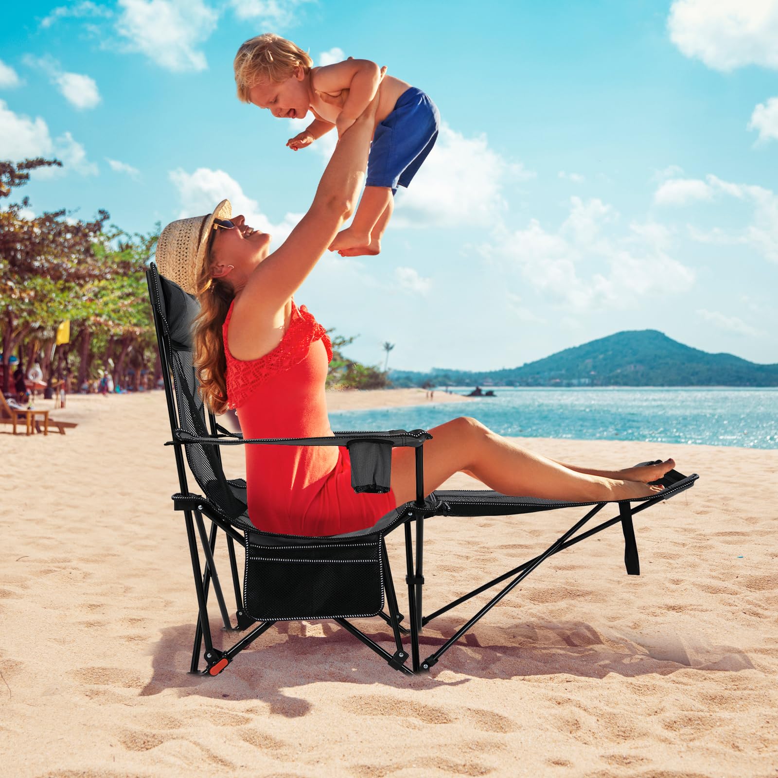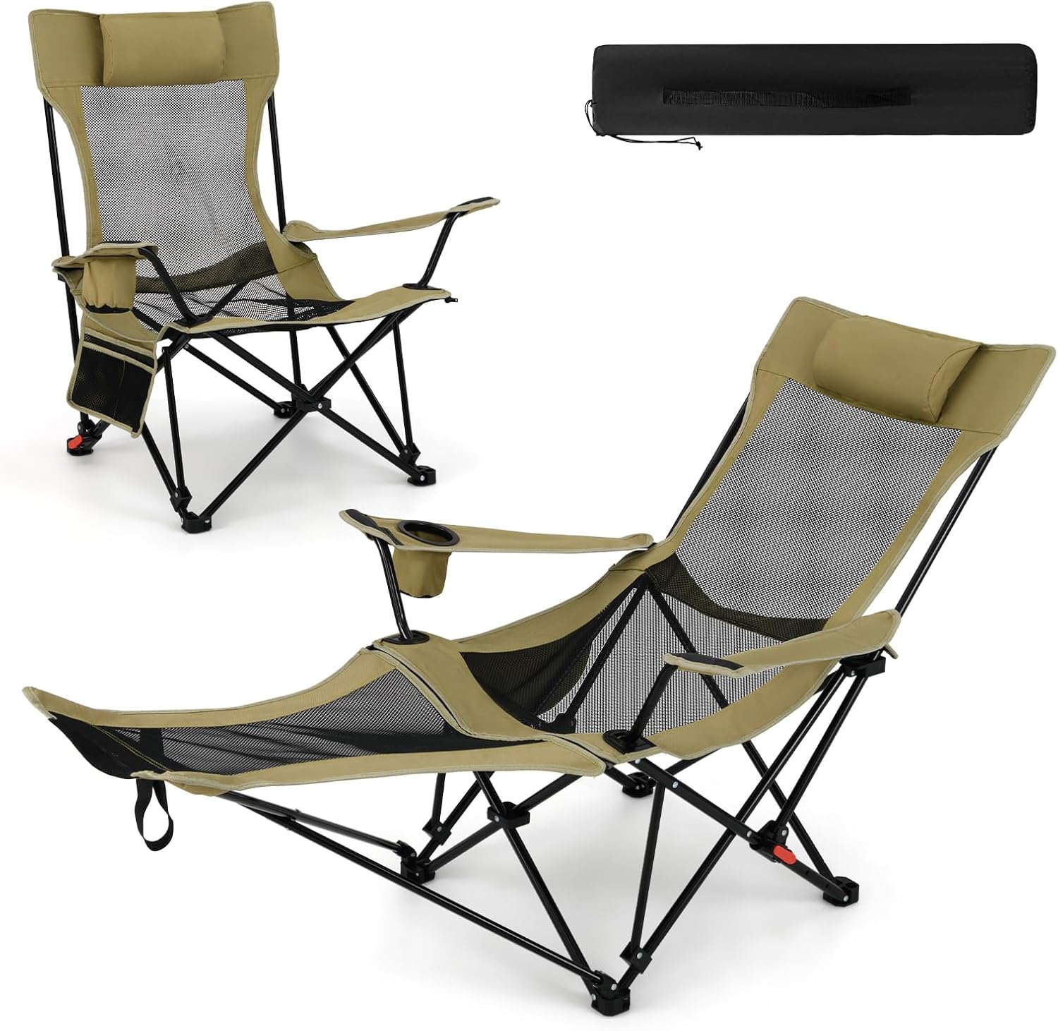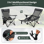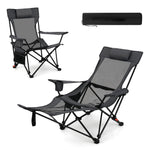 Are you looking for the ultimate outdoor companion for your camping, fishing, or beach adventures? Our foldable reclining camping chair is the perfect solution! This foldable reclining camping chair features a 2-in-1 design with a detachable footrest, allowing you to customize it to your needs. It has a 4-position adjustable backrest and a comfy headrest for ultimate relaxation. The chair also offers ample storage space with practical cup holders and side mesh pockets. When not in use, this camping chair folds down to a compact size and fits neatly into the included carry bag, so you can take it anywhere you want. From camping trips to fishing expeditions or beach parties, this lightweight mesh recliner is your go-to for versatile and comfortable outdoor seating.