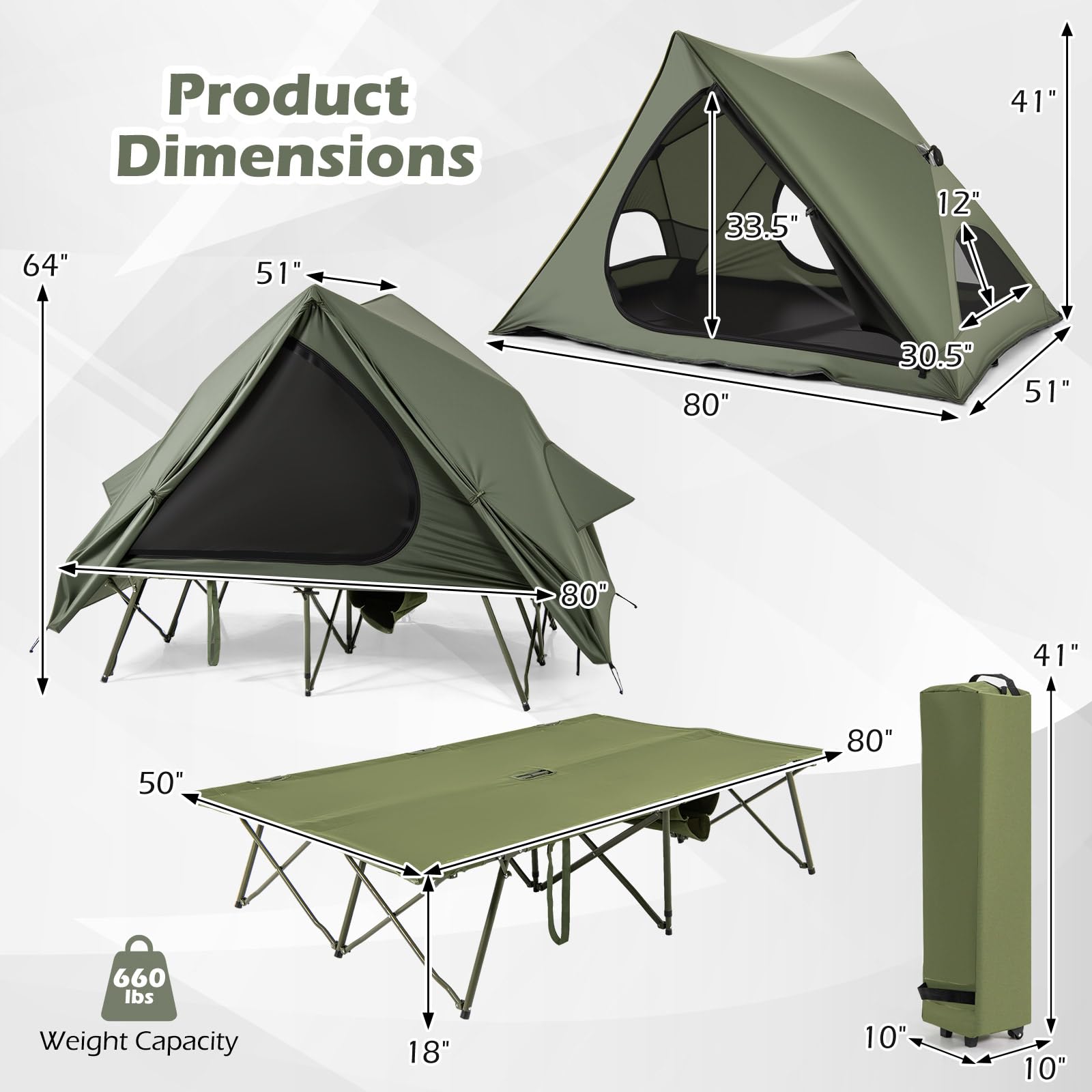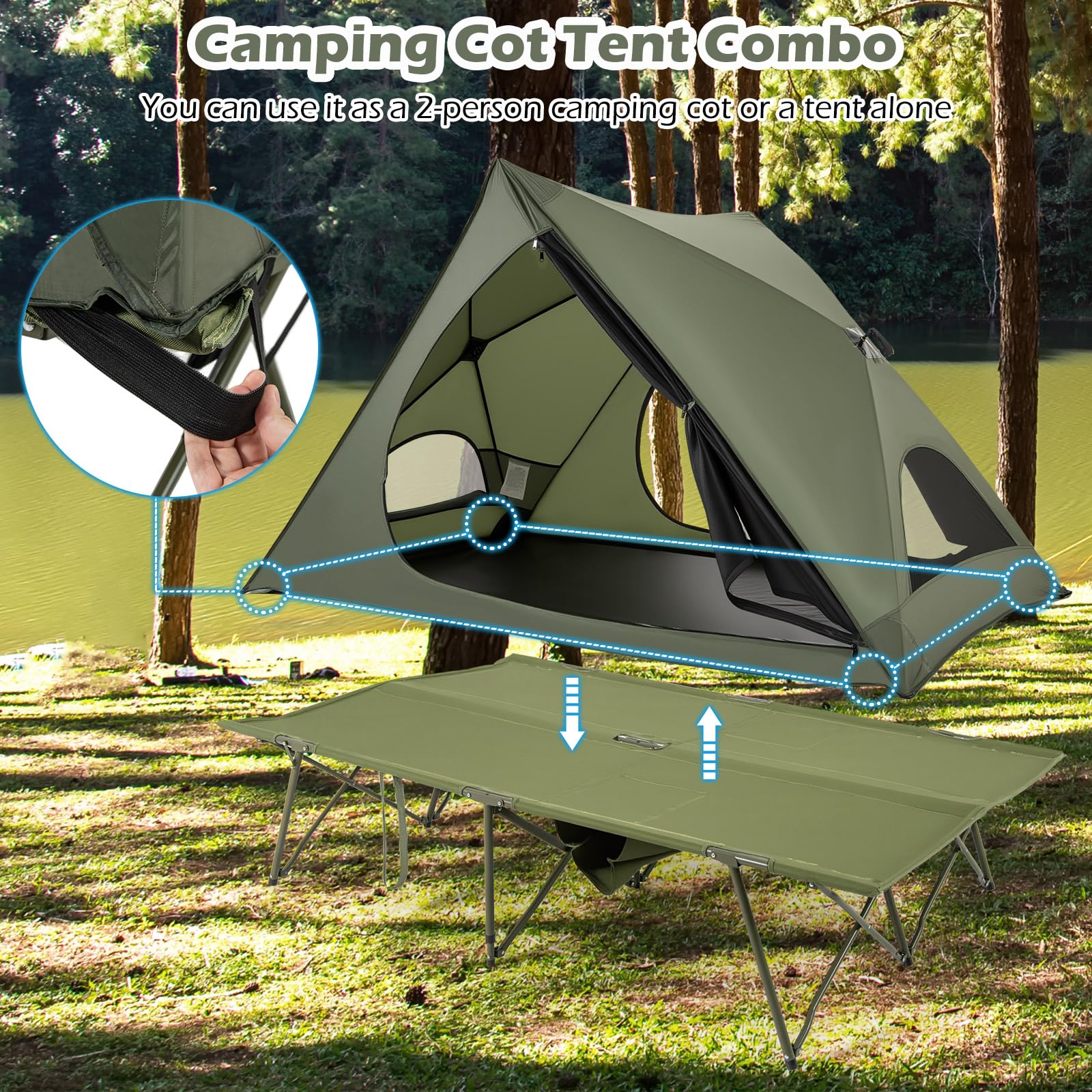 Use the cot alone, tent alone, or combine both for versatile outdoor setups.