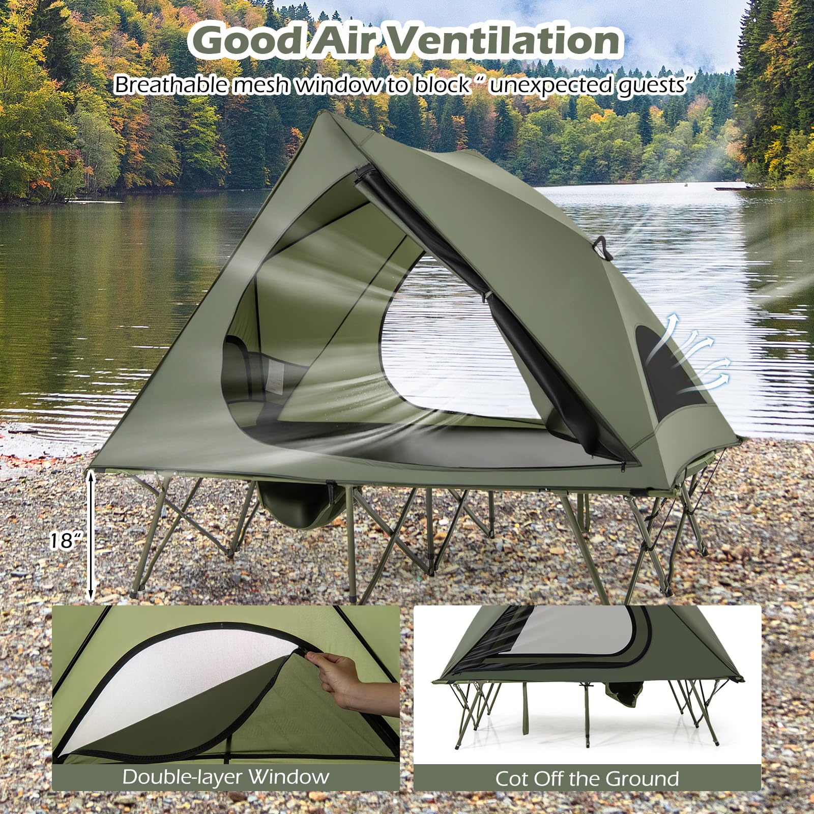 Pop-up tent and foldable cot design allow for quick and easy assembly