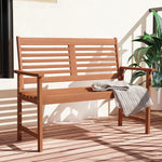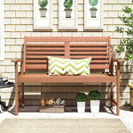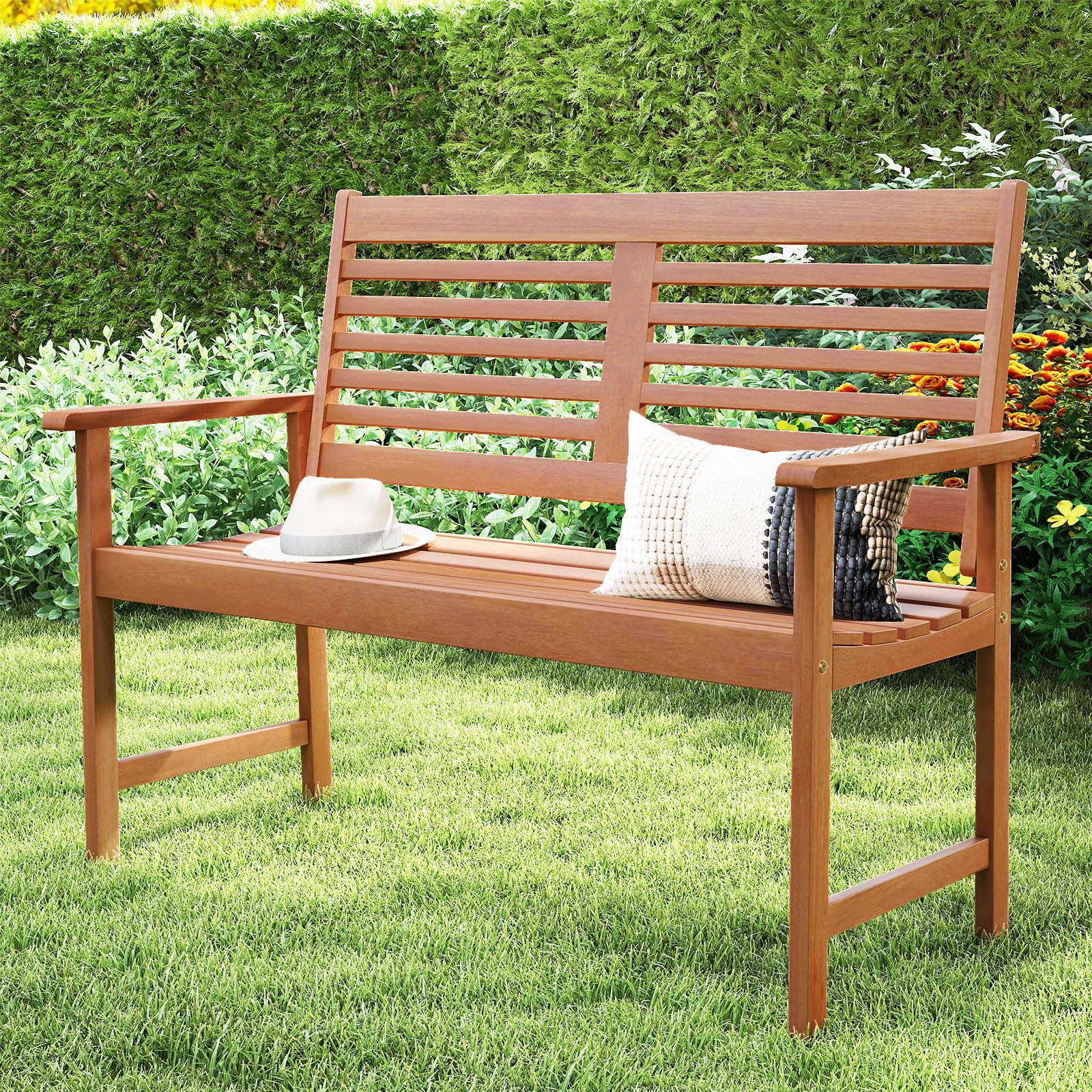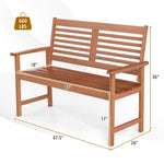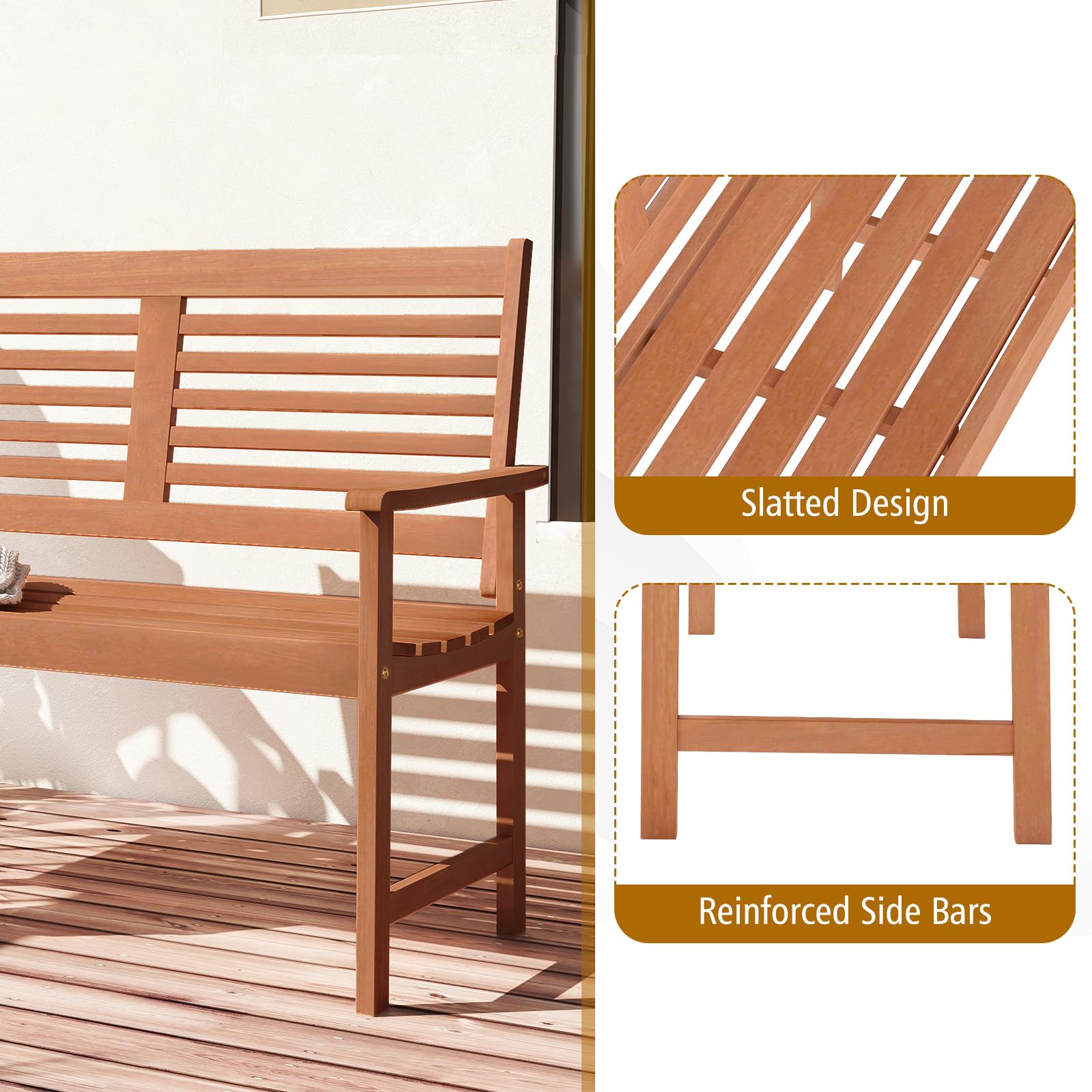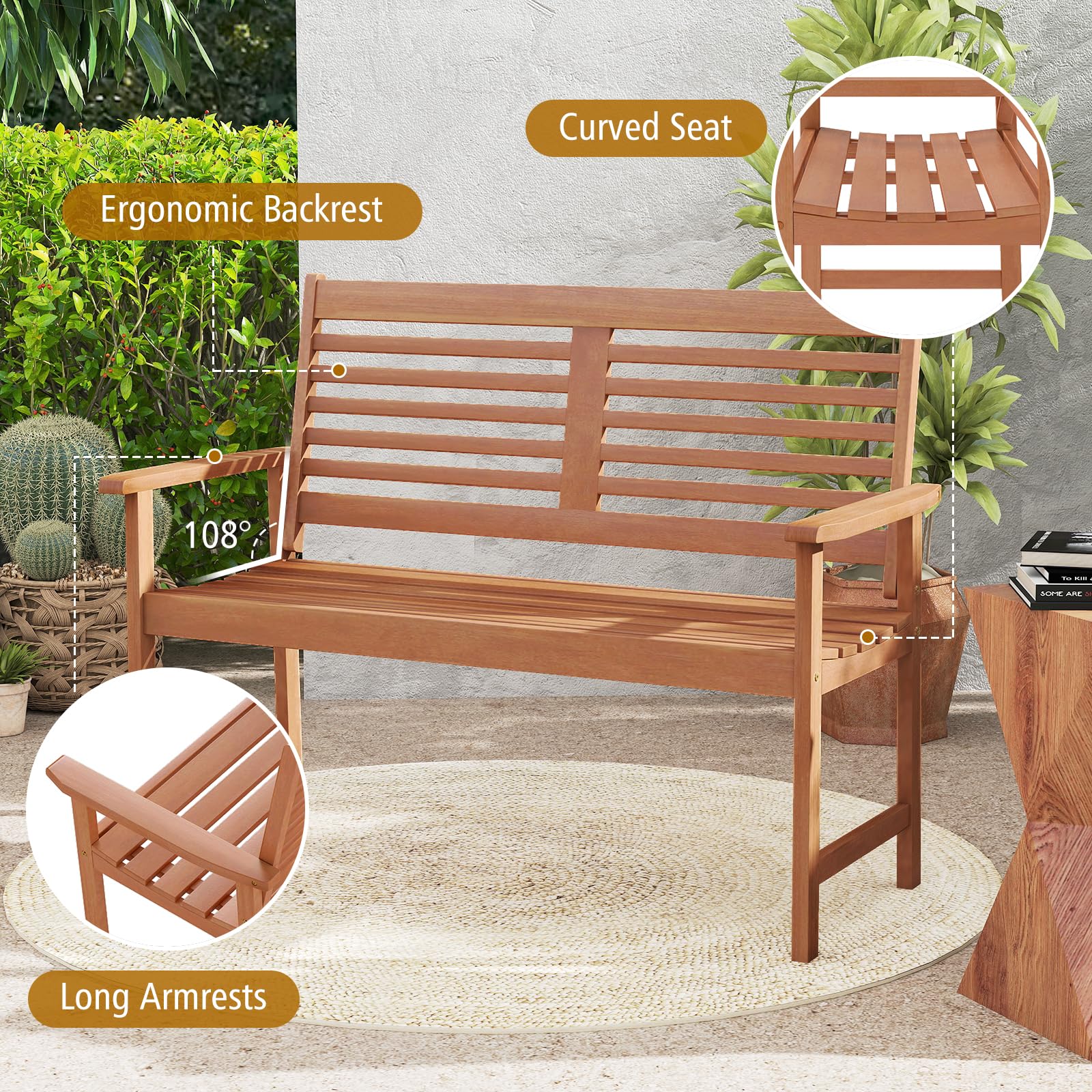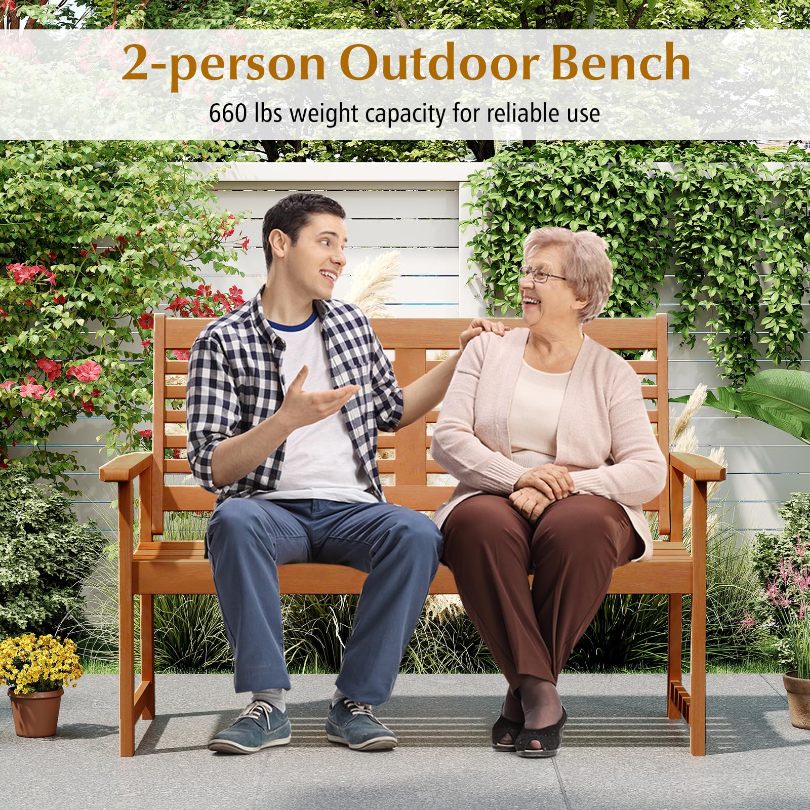 Made from solid wood and finished with teak oil, it exudes an inviting look while offering robust support with a weight capacity of up to 660 lbs. What's more, the wood bench includes an ergonomic backrest and armrests, ensuring hours of comfortable seating. The patio bench easily accommodates 2 people, ideal for intimate chats or peaceful solo retreats. And it is suitable for various outdoor settings, from patios to balconies, seamlessly blending with your existing decorations.
