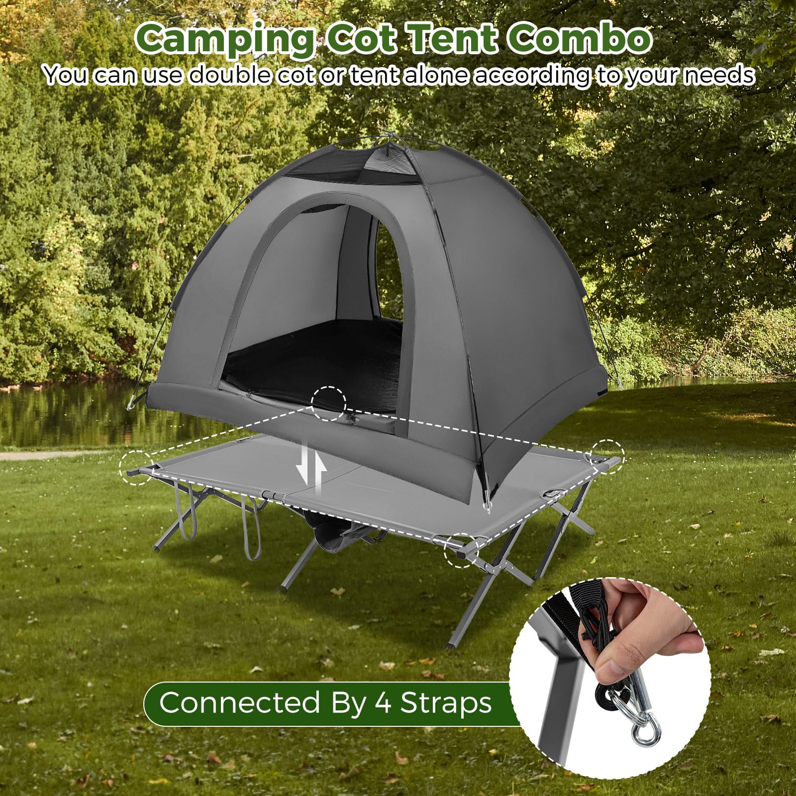 Are you looking for a versatile outdoor solution that can provide comfort and protection? This 2-peron camping cot tent combo offers the perfect balance of flexibility and durability. Use the 2-person cot or tent alone, or combine them securely with 4 straps to create your ideal outdoor sleeping arrangement. Besides, the water-resistant rainfly, made with 150D Oxford fabric and a PU 2000MM waterproof rating, ensures you stay dry and protected from the elements. Enjoy good air ventilation through breathable mesh windows while keeping the interior fresh and comfortable. The cot's 600D Oxford fabric mat, sturdy metal legs, and non-slip foot pads provide stability and can support up to 660 lbs/300 kg. Plus, wind ropes and stakes are included for added reliability in windy conditions. Whether you're camping, heading to the beach, or relaxing in the backyard.