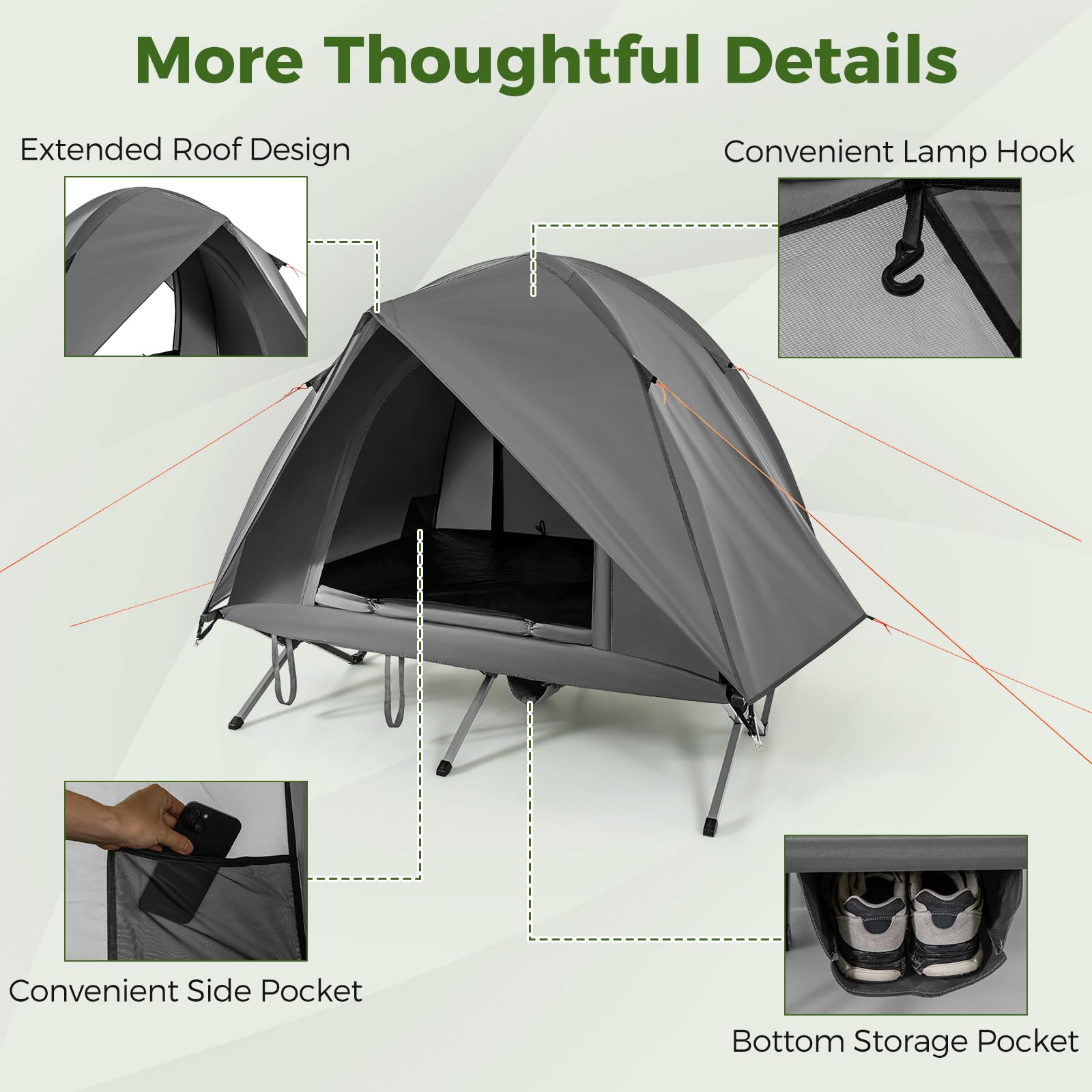 Pop-up tent and foldable cot design allow for quick and easy assembly