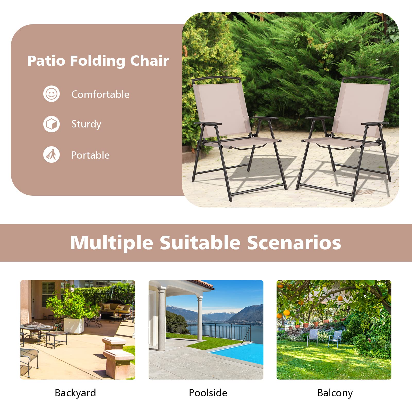 - No Assembly Required: Our patio folding chairs come with full assembly, which can save you time and energy to a great extent. Once you receive the package, you can unfold the chairs immediately and sit on them to have your outdoor relaxation. The modern style of the chairs also helps you be in good mood.