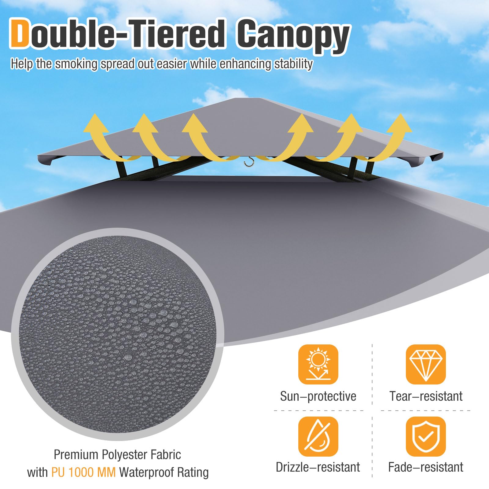 Our 8 x 5 ft grill gazebo provides ample shade and sun protection, creating an inviting space for cooking and socializing with friends and family. There are 2 side metal shelves, 6 hanging hooks, and a built-in bottle opener, providing easy access to grilling accessories. You can also add a light or decoration on the ceiling hook to enhance the ambience of your outdoor cooking space. Additionally, the tent is crafted from a reliable polyester canopy and supported by a robust metal frame, which is built to withstand various weather conditions, ensuring long-term outdoor use. Thanks to its vented top and anchoring plates with pre-drilled holes, the gazebo could keep stake even in breezy conditions. Enjoy BBQ outdoors with family and friends, create unforgettable memories!