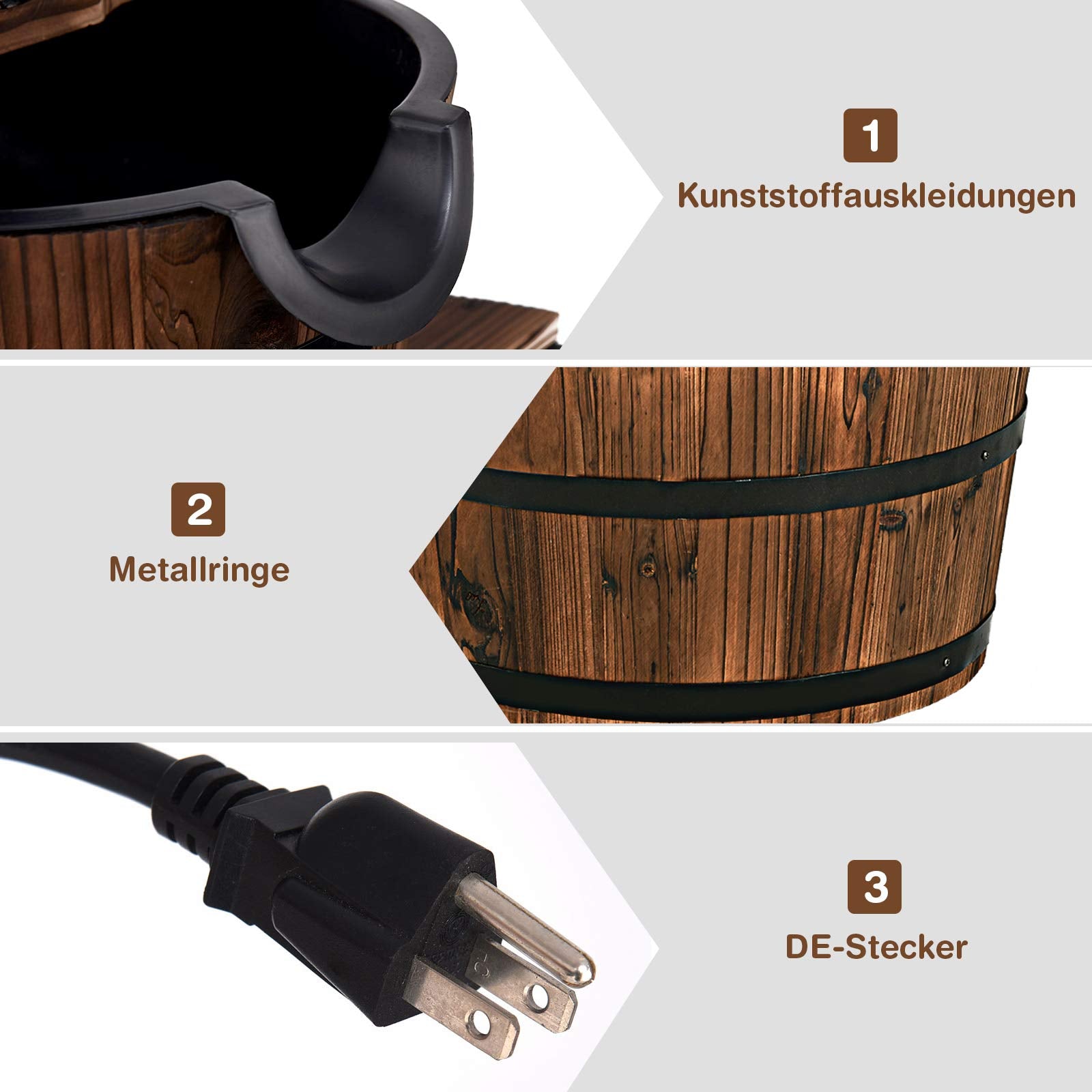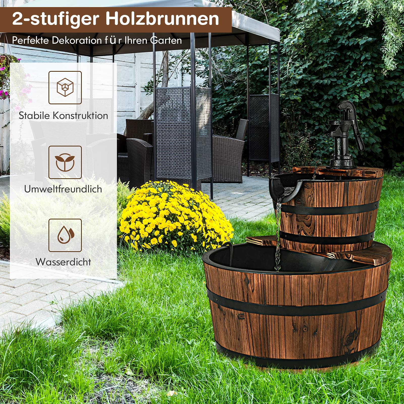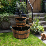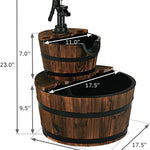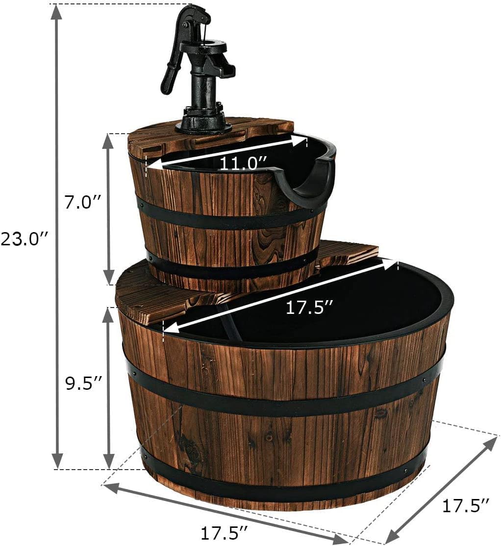Transform your patio, yard, or garden with our charming 2-tier antique-style water fountain. Crafted from carbonized fir wood, this elegant fountain features a rustic barrel design with a decorative hand pump (non-functional) for a classic countryside appeal.