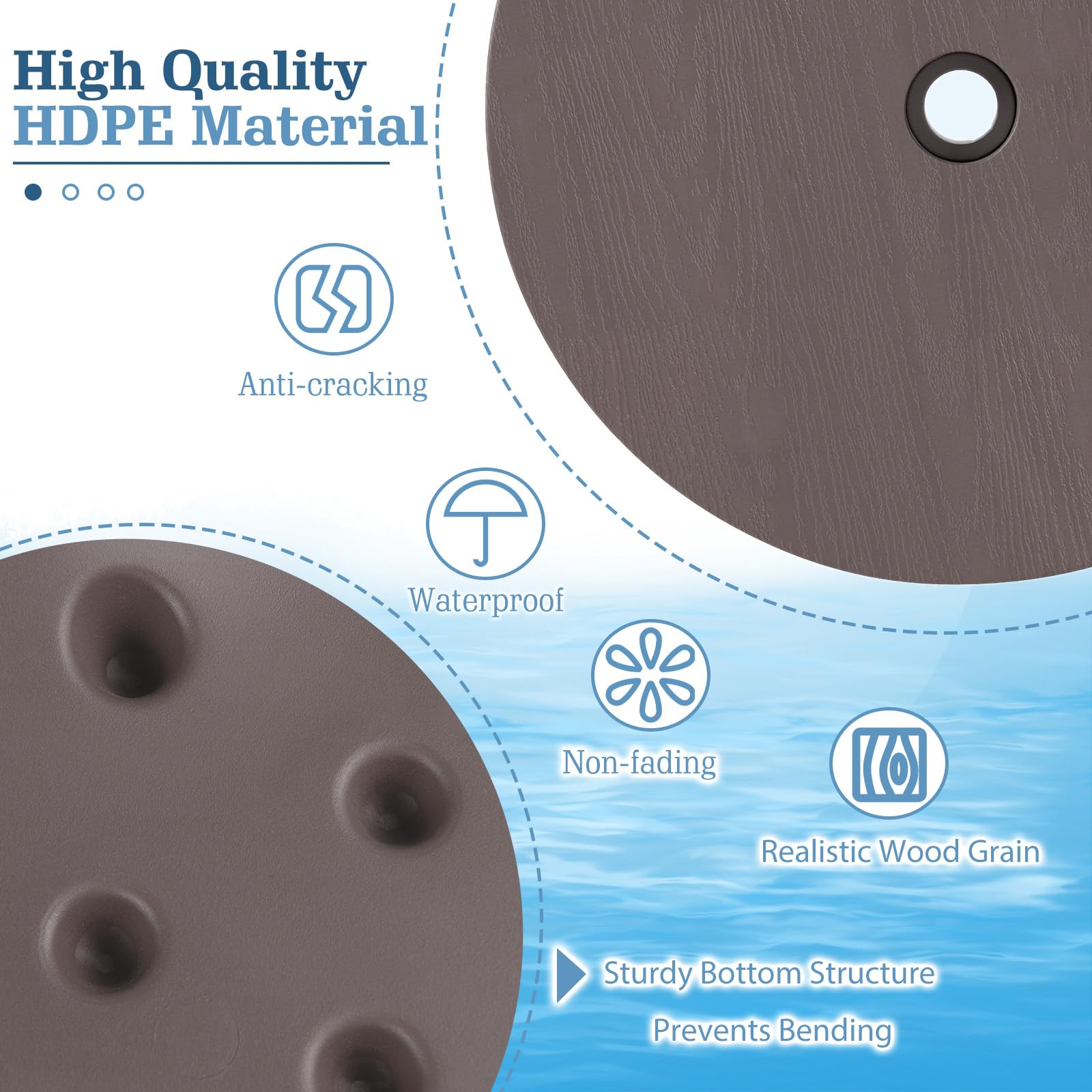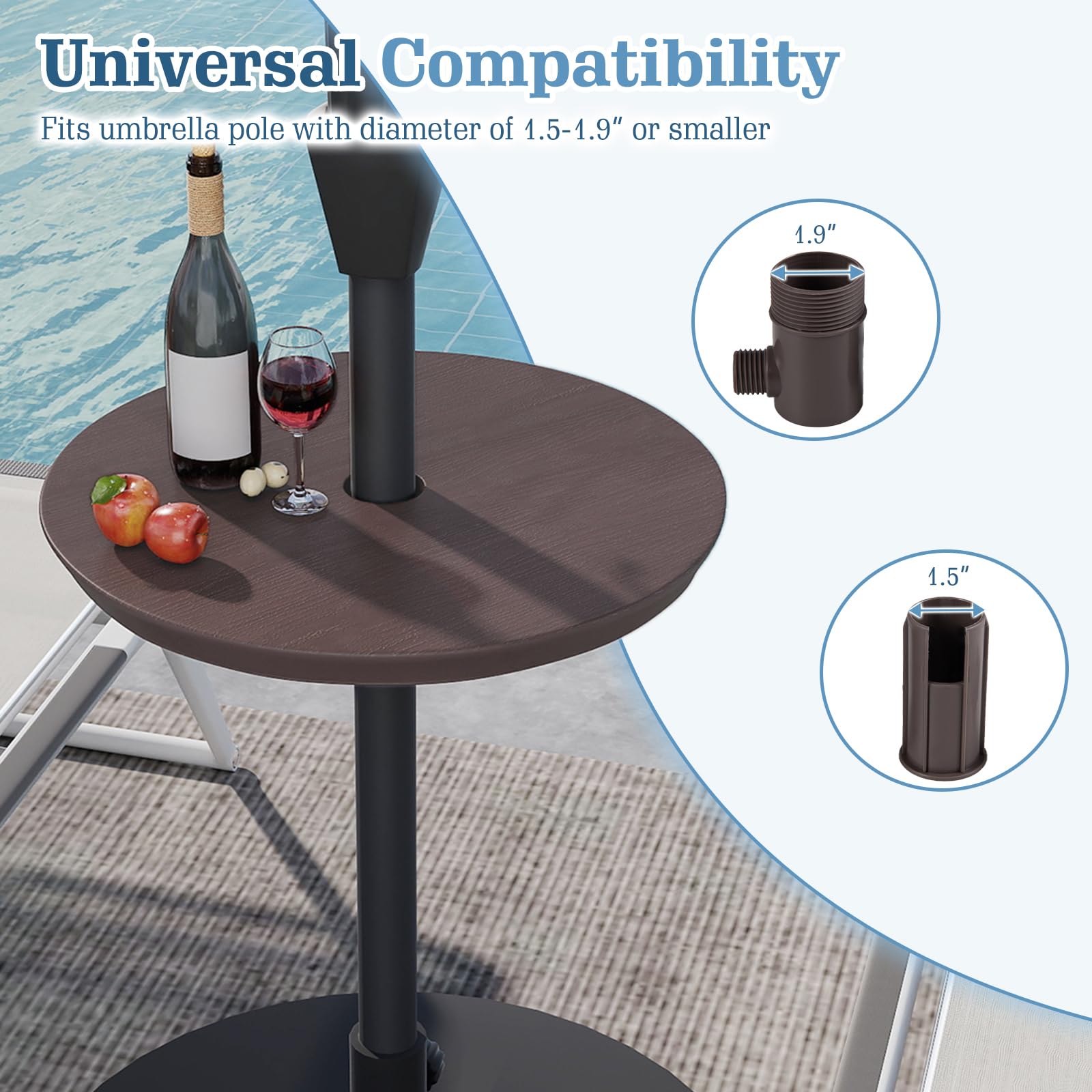 Crafted from premium HDPE that is waterproof and anti-cracking, the portable round table is built to last. The realistic wood grain finish brings a refined look to your patio, garden, or poolside area. Additionally, it is easy to adjust the tray’s height with the rotatable adaptor, customizing placement for optimal convenience. This adaptable accessory fits umbrella poles from 1.5”-1.9”(38-48 mm) in diameter, serving effortlessly as a side table, bistro table, or bar table to suit your entertaining needs. A robust bottom structure delivers dependable support and prevents bending, while the lightweight design makes relocating and repositioning a breeze. Quick, tool-free assembly allows you to enjoy your umbrella table tray in minutes, offering both style and function for any outdoor space.