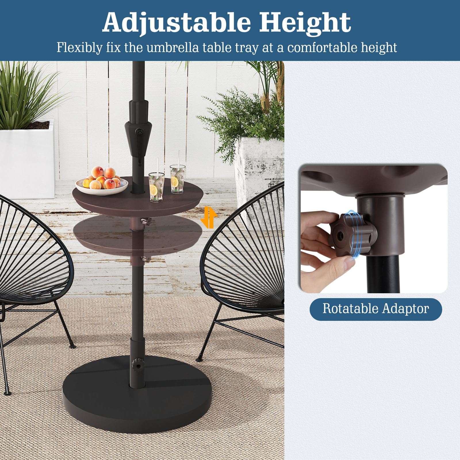 Rotatable adaptor allows you to flexibly fix the umbrella table tray at a comfortable height