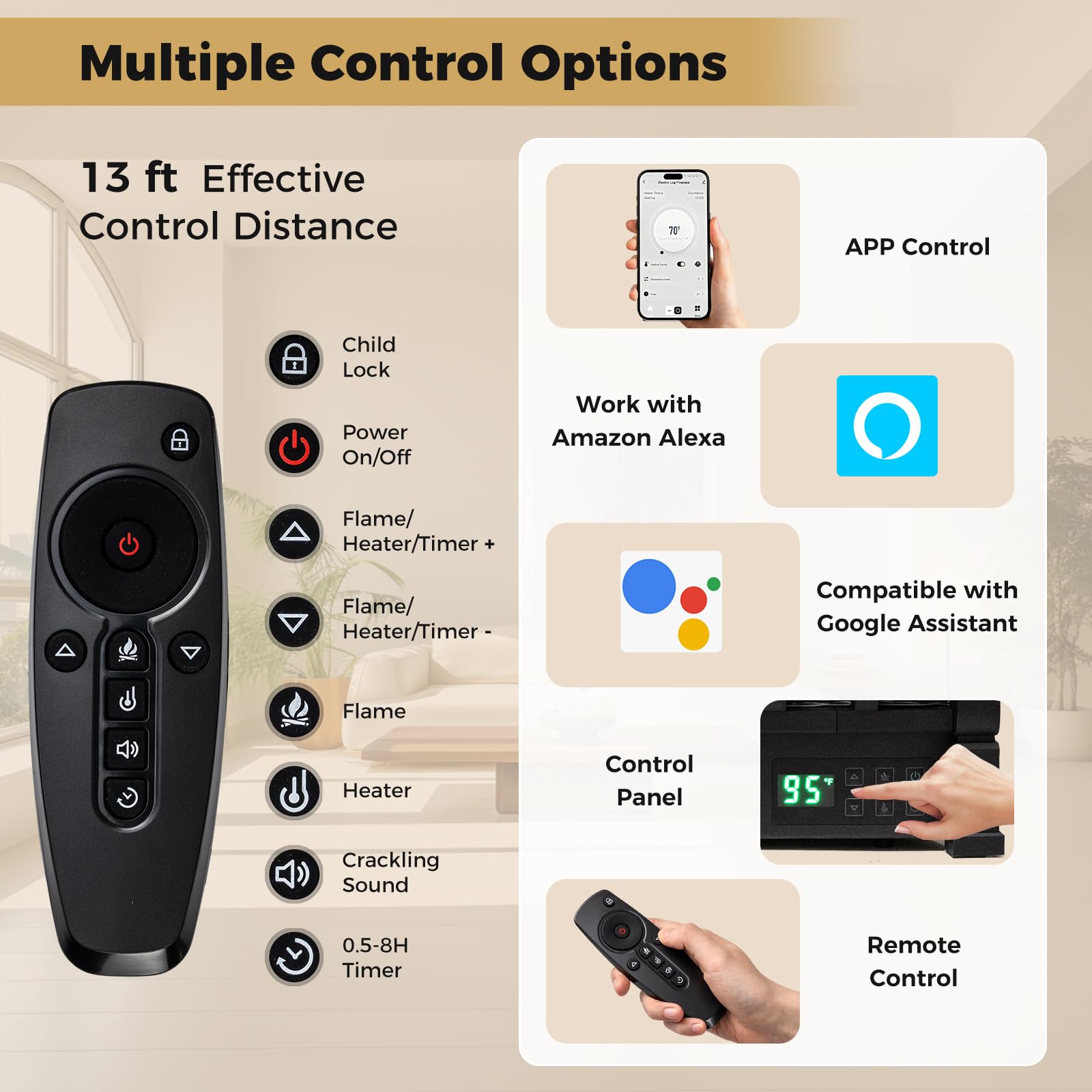 Easy control via APP, remote (up to 13 ft), and control panel