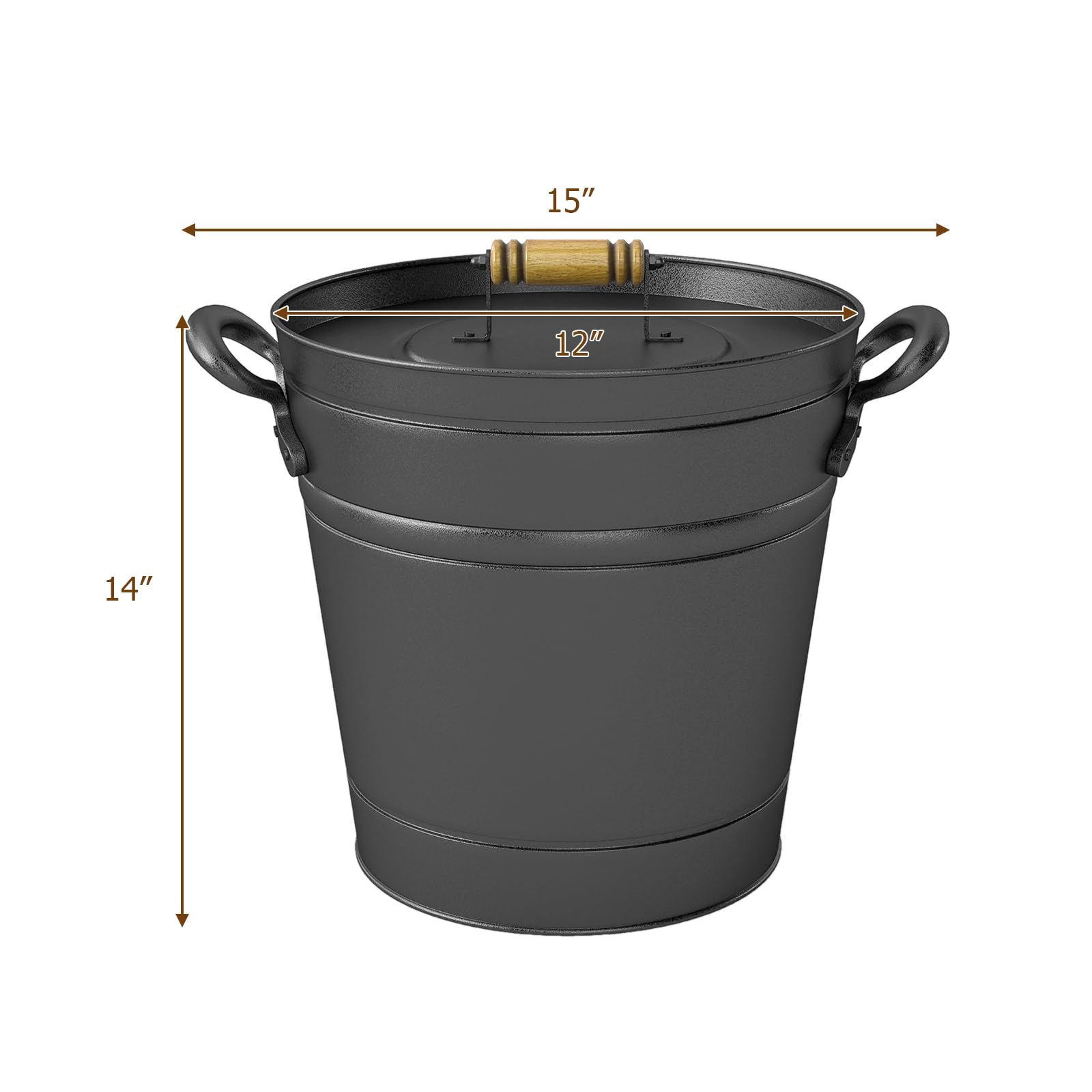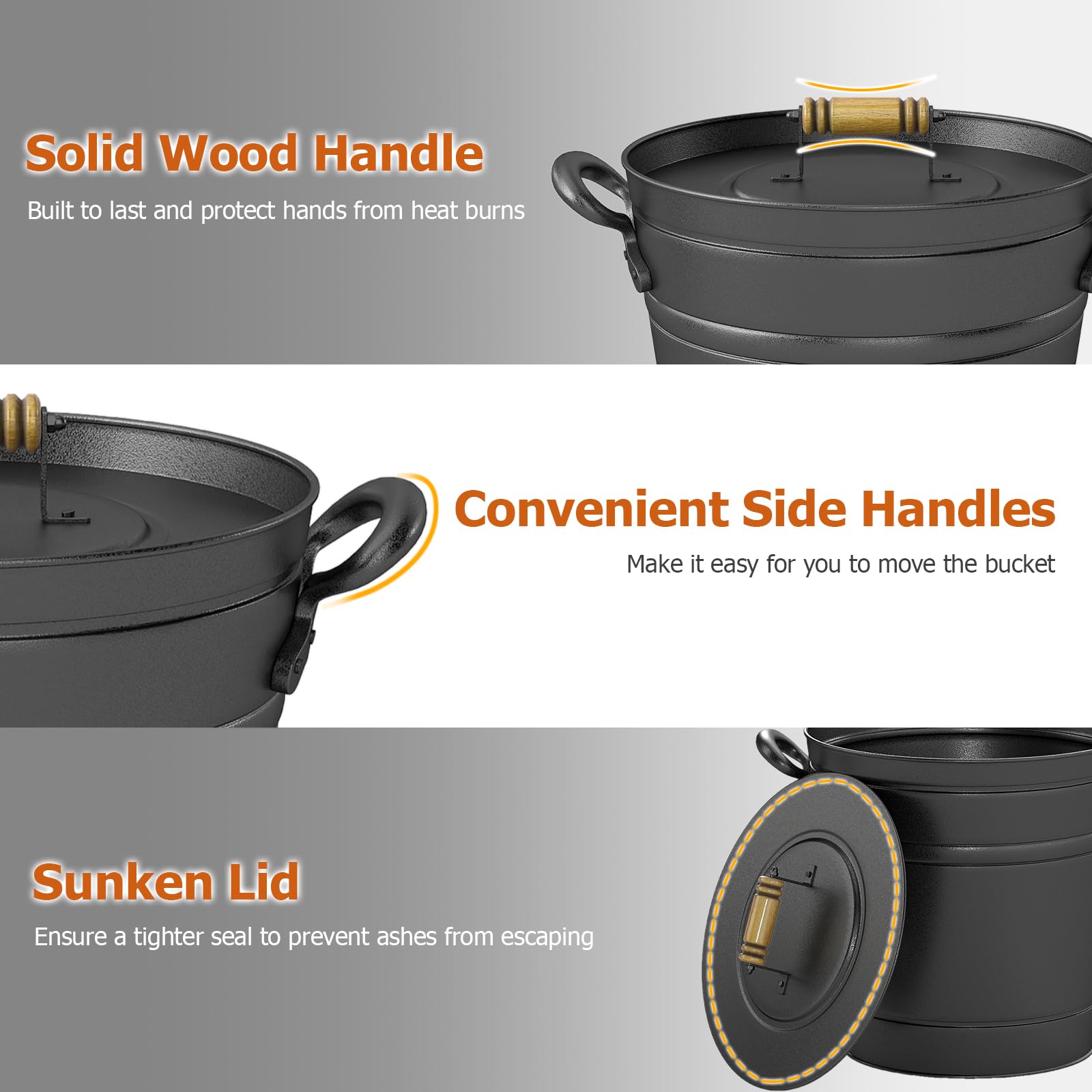 This ash bucket is a versatile and convenient tool designed to meet your fire-related needs. With a generous 2.9 gal capacity, it can store and transport ash, pellets, logs, coals, and more with ease. The sunken lid ensures a tight seal, preventing ashes from escaping and keeping your surroundings clean. Made of selected powder-coated metal, it is rust-proof and high temperature resistant, ensuring long-lasting durability. The solid wood handle provides a comfortable grip and protects hands from heat burns. Measuring 15" x 12" x 14" (L x W x H), this lightweight and portable ash bucket features convenient side handles for easy carrying. Suitable for a wide range of applications, including bonfires, fire pits, fireplaces, barbecues, and wood burners, it is an essential accessory for both outdoor and indoor use.
