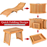 This is our folding Eucalyptus lounge chair and table set which is composed of a solid wood structure. The chaise chair and table are tightly screwed, which provides you with satisfactory load-bearing capacity and stability. Soft cushions with durable covers ensure your comfortable sitting experience. A natural wood frame and two-color cushion add a unique charm to your outdoor environment. Both of our side tables and lounge chairs can be quickly folded when not in use for easy storage. Featuring a thickened handle, you can carry this furniture set to different places. The lounge chair and table set are an ideal choice for poolside, patio, porch, and seaside. Why not add some natural elements to your outdoor courtyard?