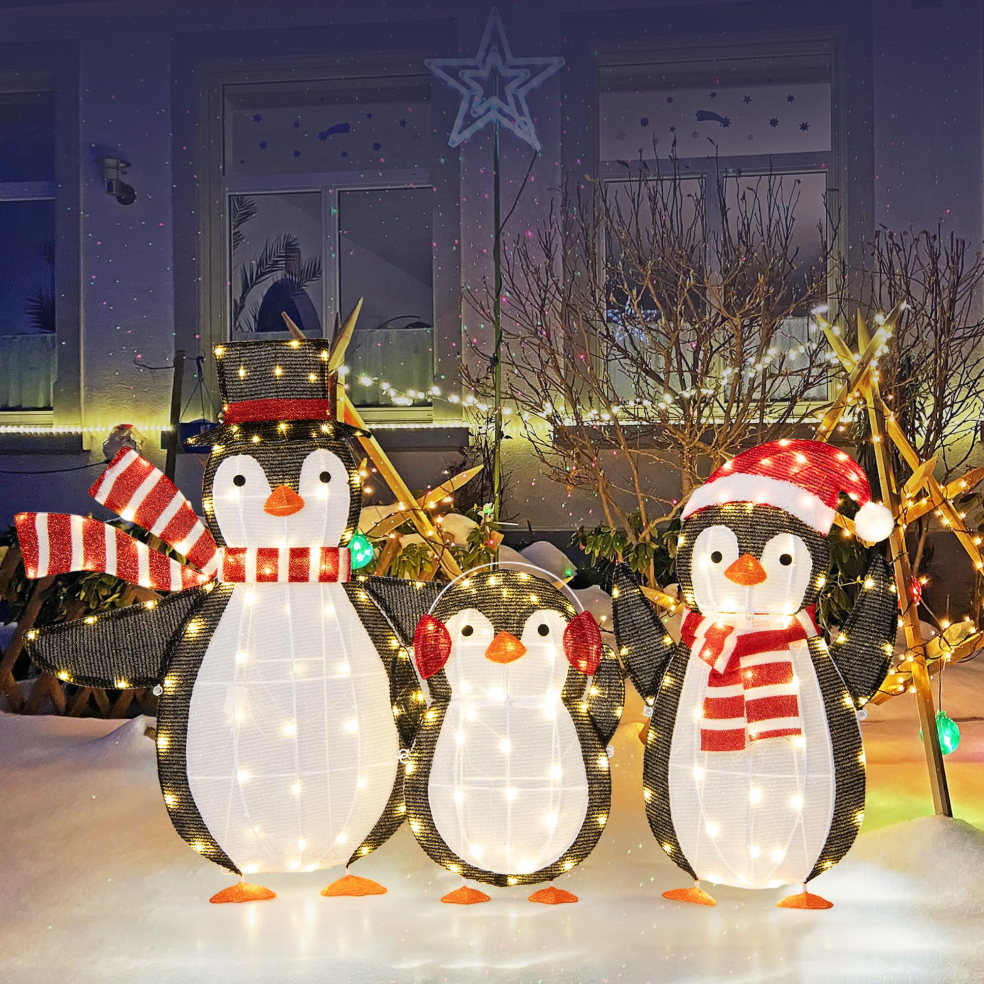- 194 Warm White LED Lights: The 3-piece lighted penguin family features 194 warm white LED lights that create a cozy and inviting atmosphere. These stunning lights will brighten your holiday display beautifully.