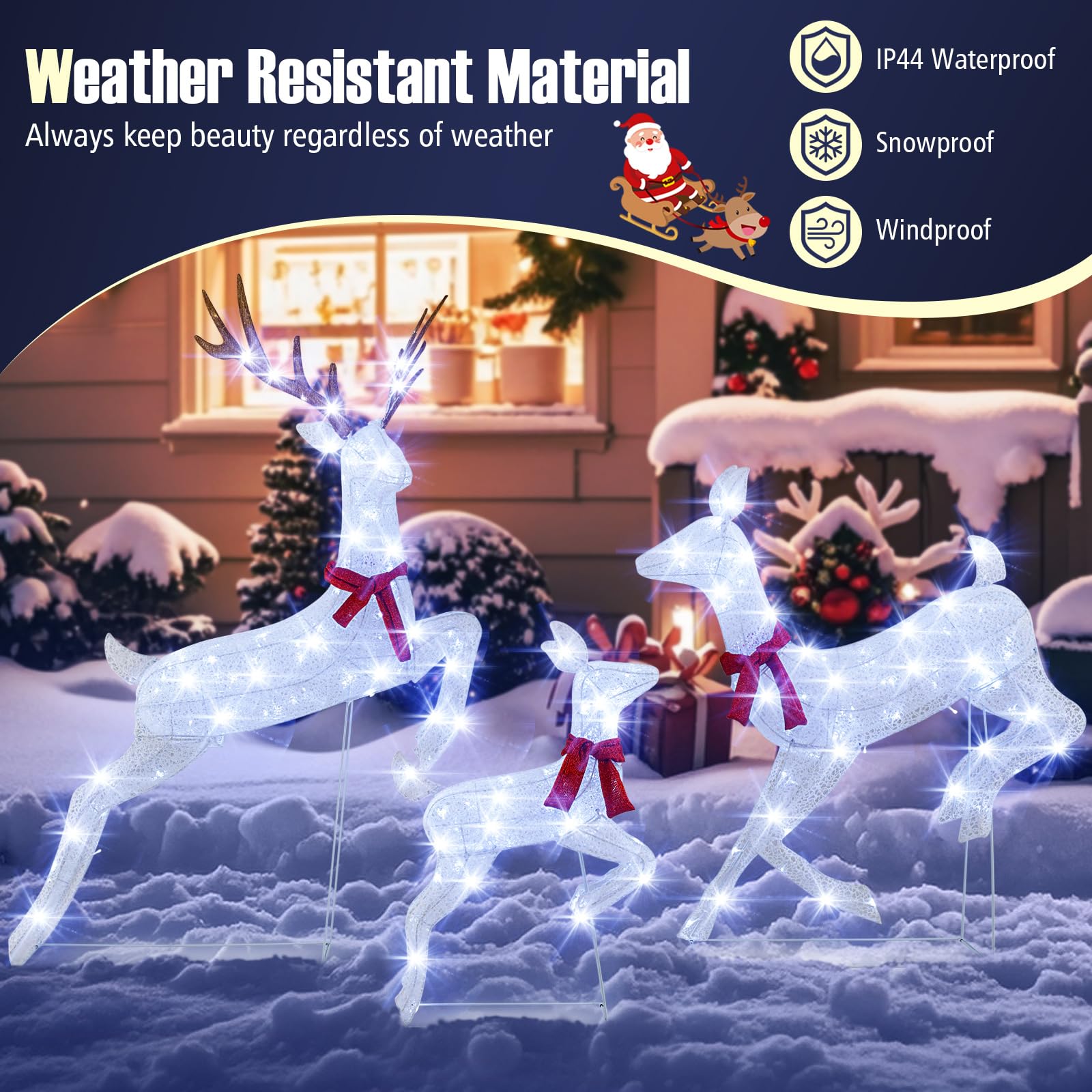 - Weather Resistant Material: Crafted from premium materials designed to withstand various weather conditions, this Christmas decoration is IP44 waterproof, snowproof and windproof, ensuring the deer family remains splendid throughout the season.